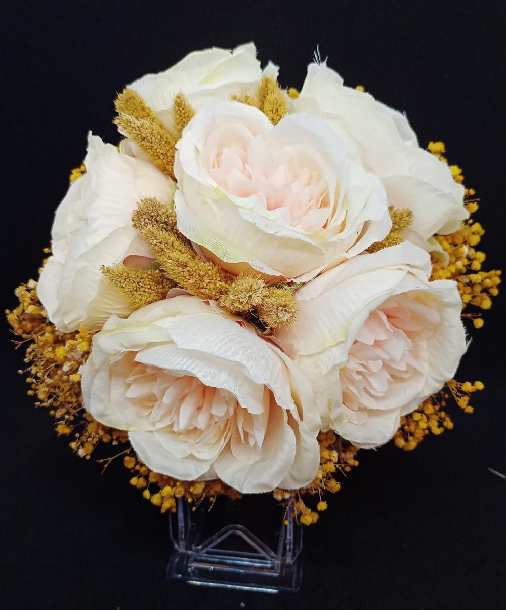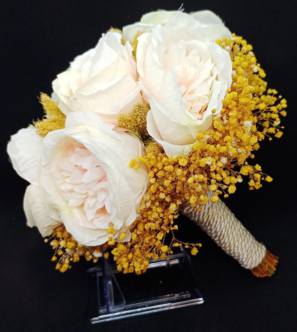 Kahve rengi sapa sahip hardal sarısı cipsolarla süslenmiş açık pembe gül yapay gelin buketi.