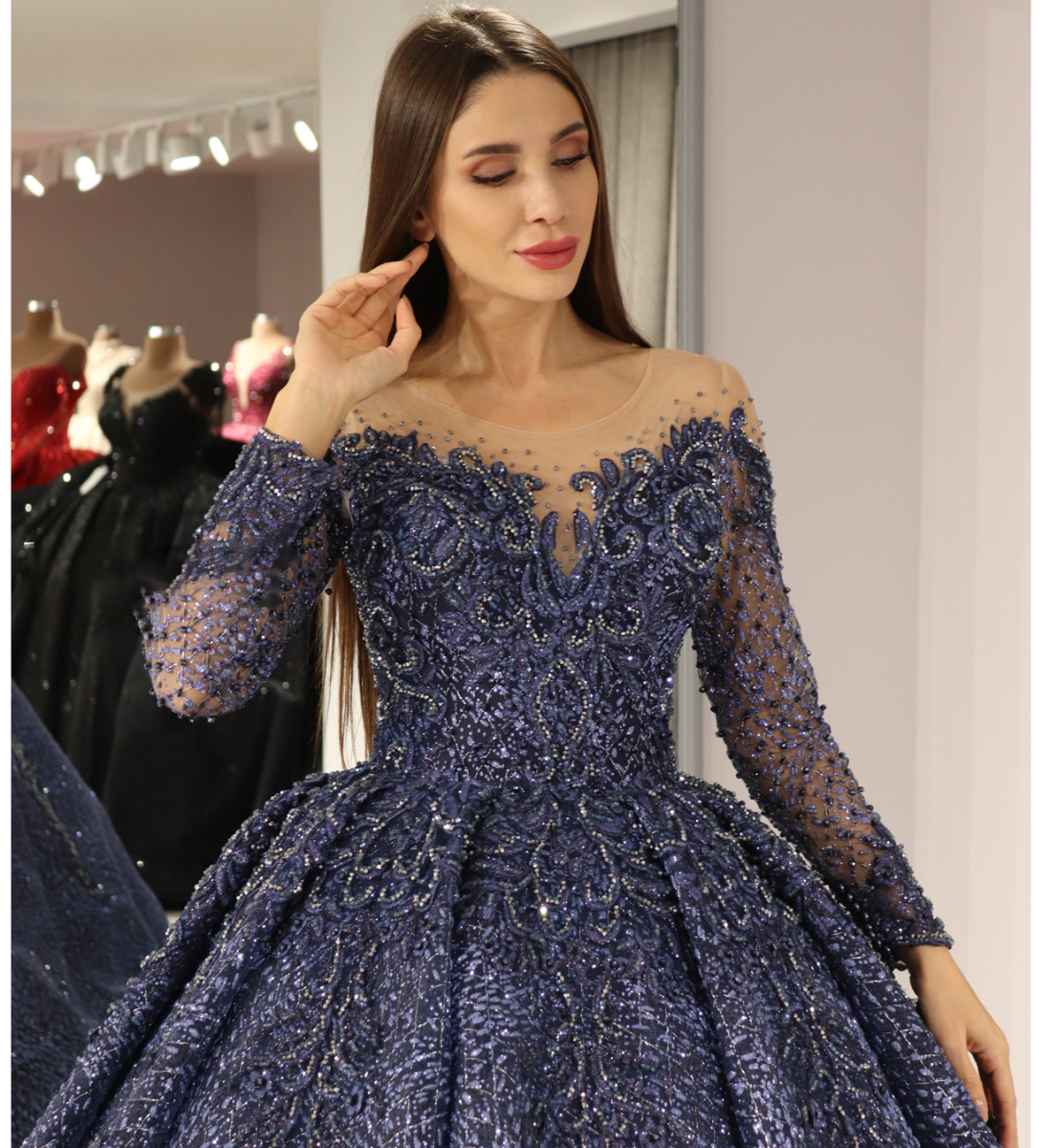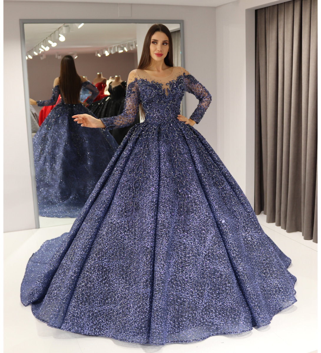 İllüzyon Yaka Detaylı Uzun Kollu Prenses Nişanlık