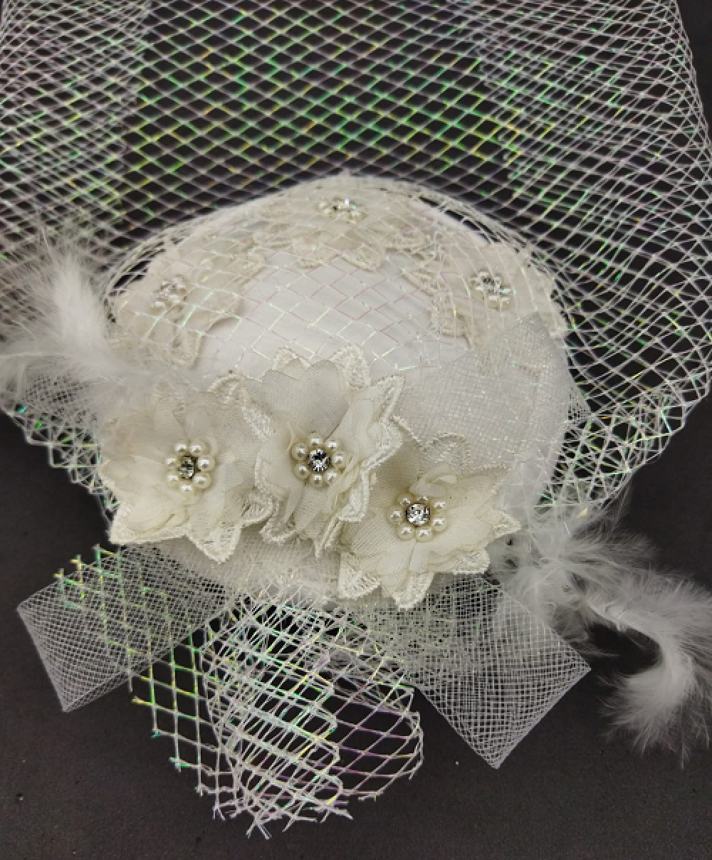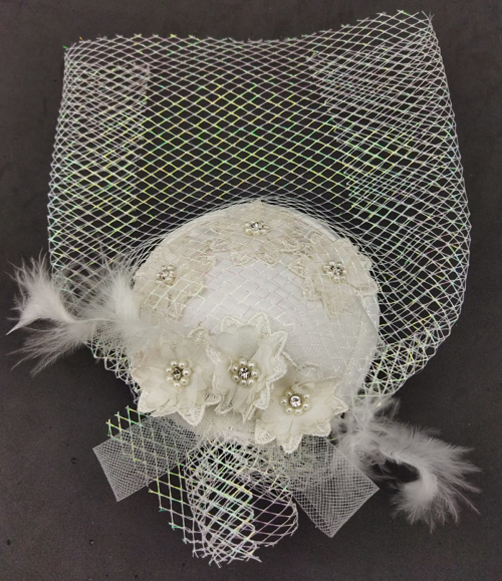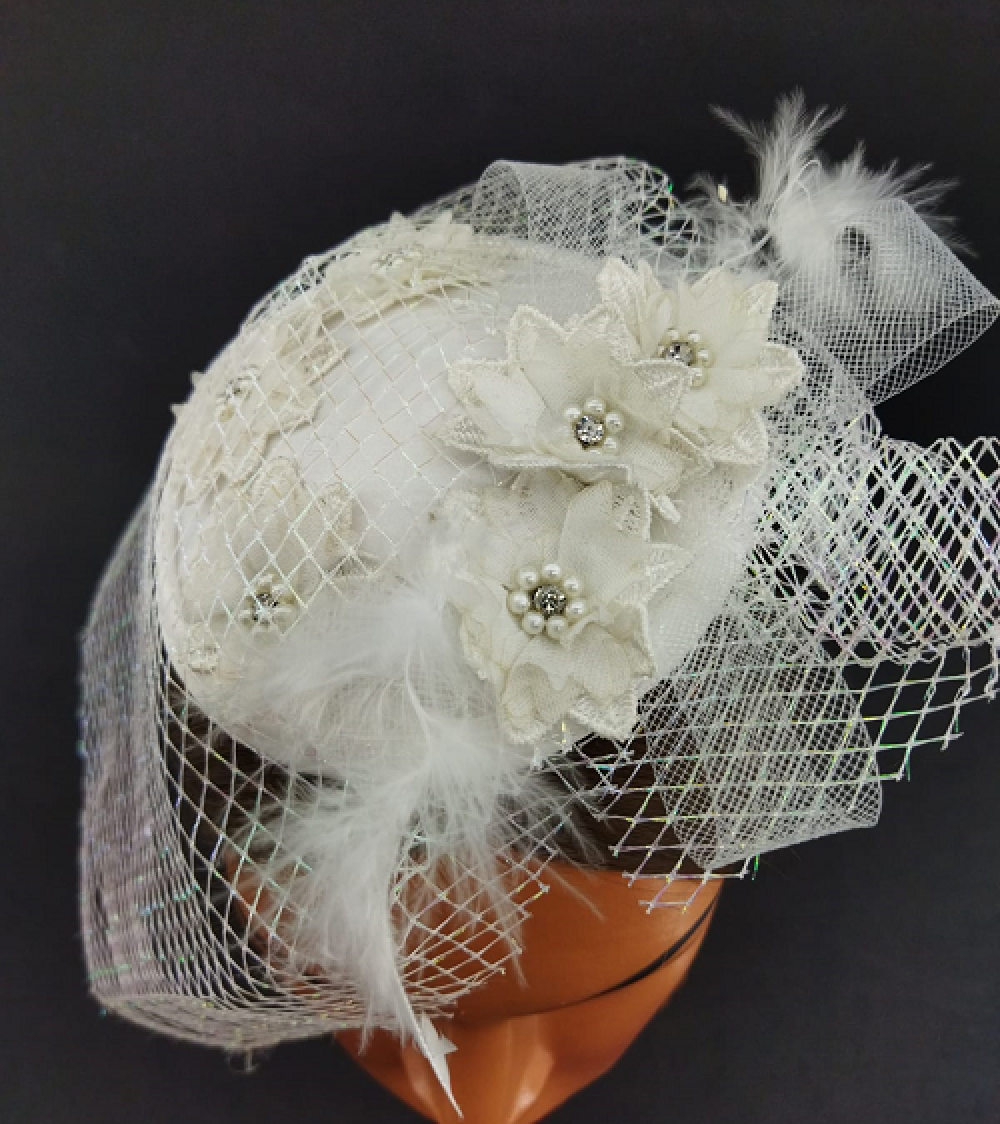 İnci Detaylı Çiçeklere Sahip Tüylü Beyaz Gelin Vualet Şapka Nikah Kepi