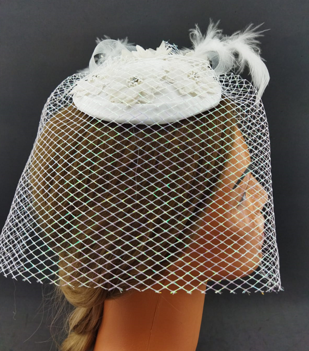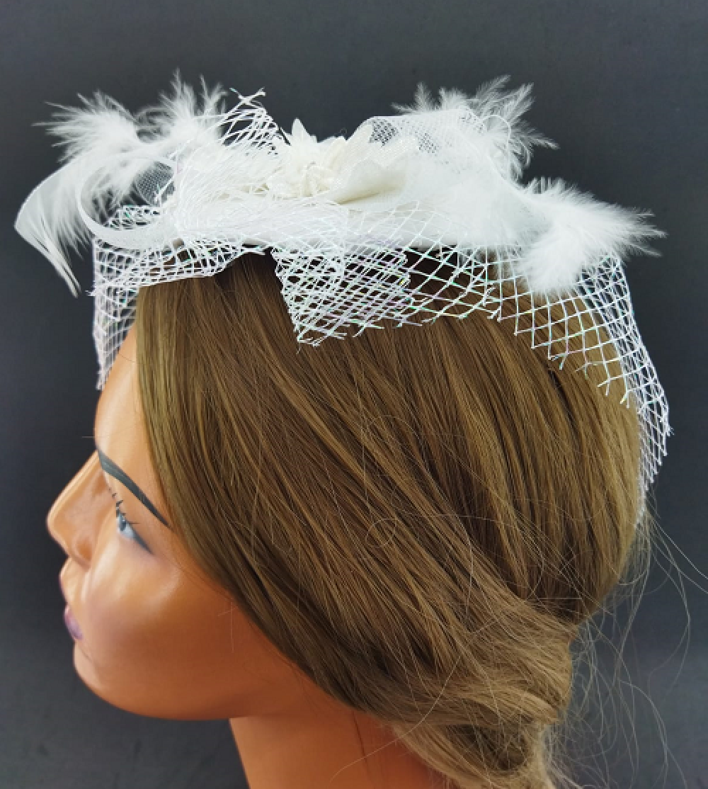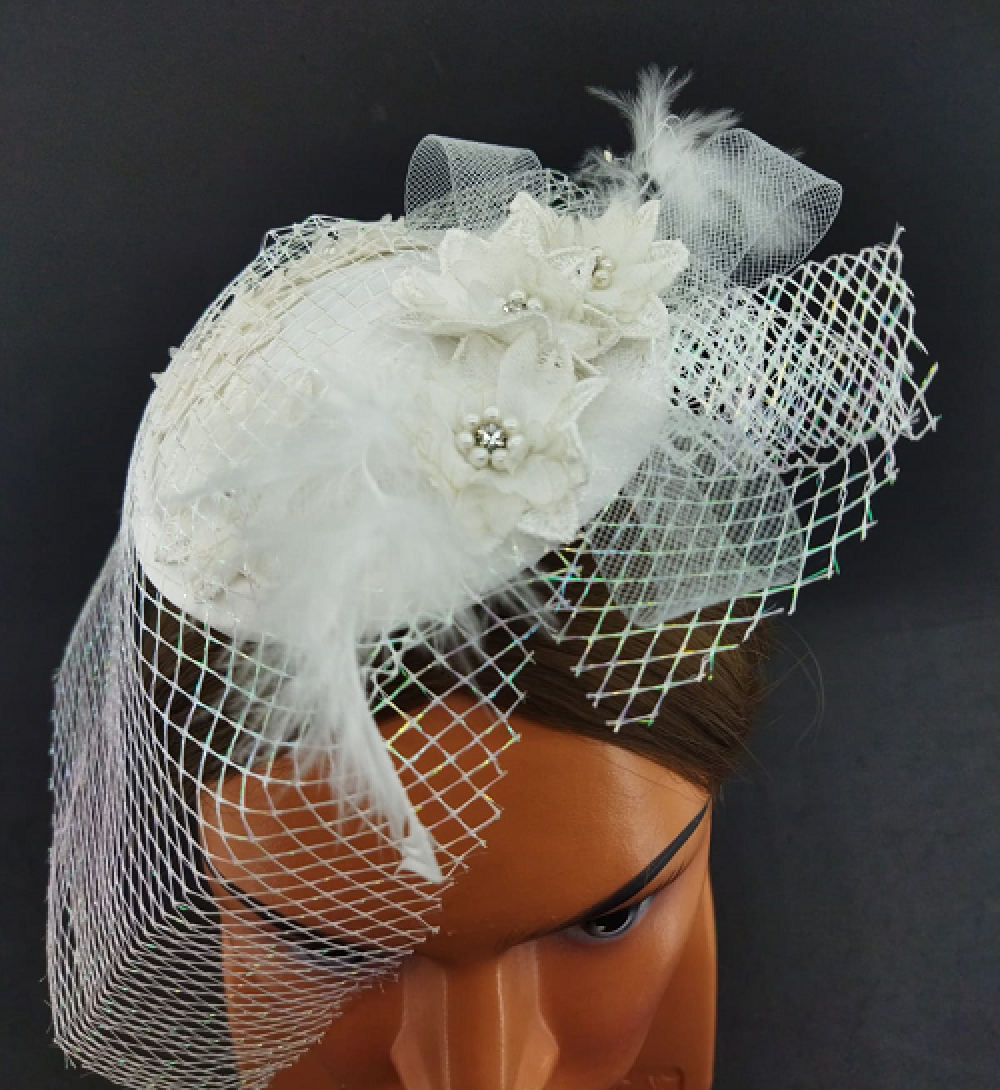 İnci Detaylı Çiçeklere Sahip Tüylü Beyaz Gelin Vualet Şapka Nikah Kepi