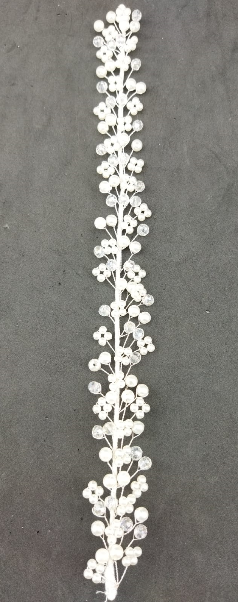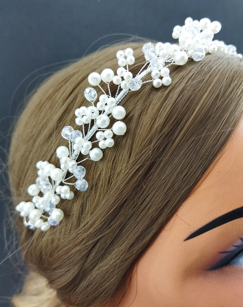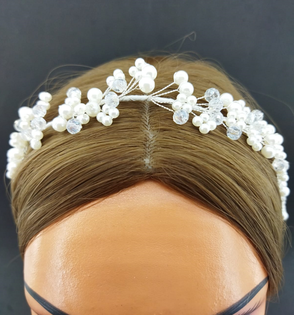 İncilerle Oluşturulmuş Kristal Detaylara Sahip İnce Gelin Tacı