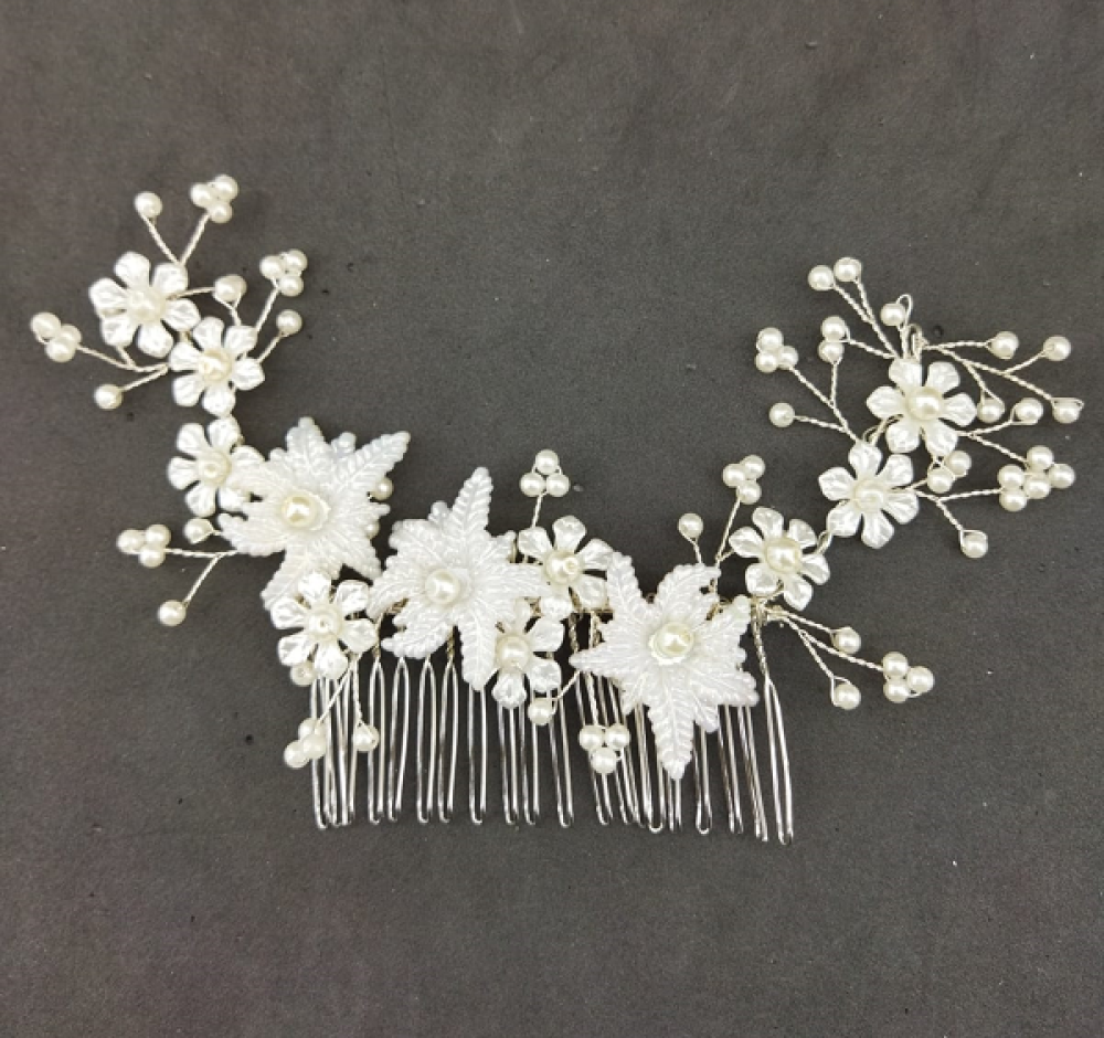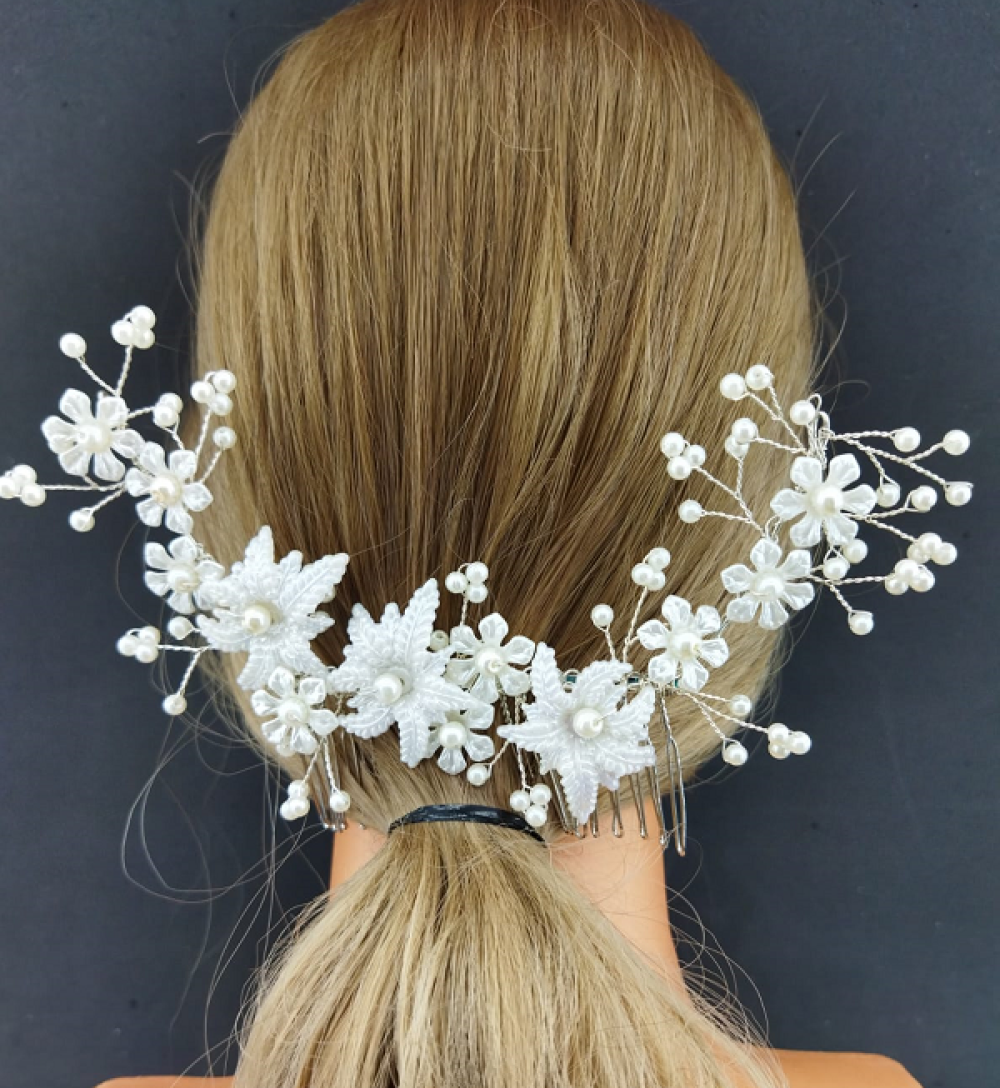 İncili Beyaz Çiçeklerden Oluşan Gelin Tokası
