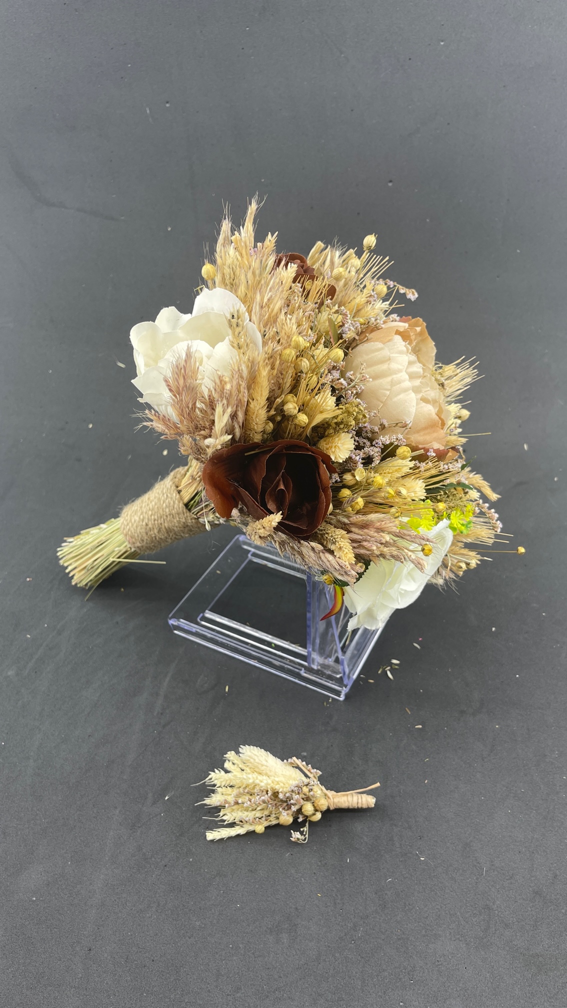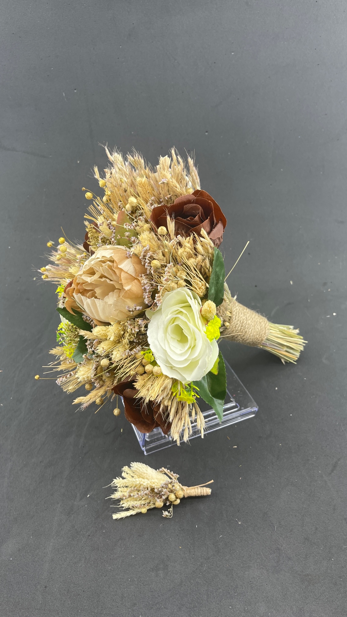 Kahve Bej Renklerde Aranjman Gelin Buketi ve Damat Yaka Çiçeği
