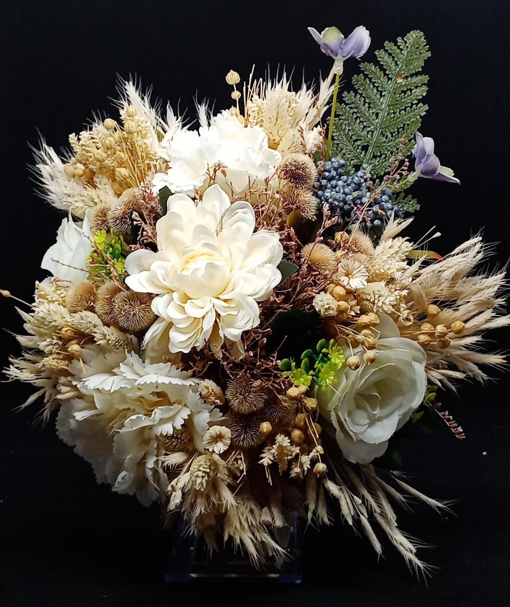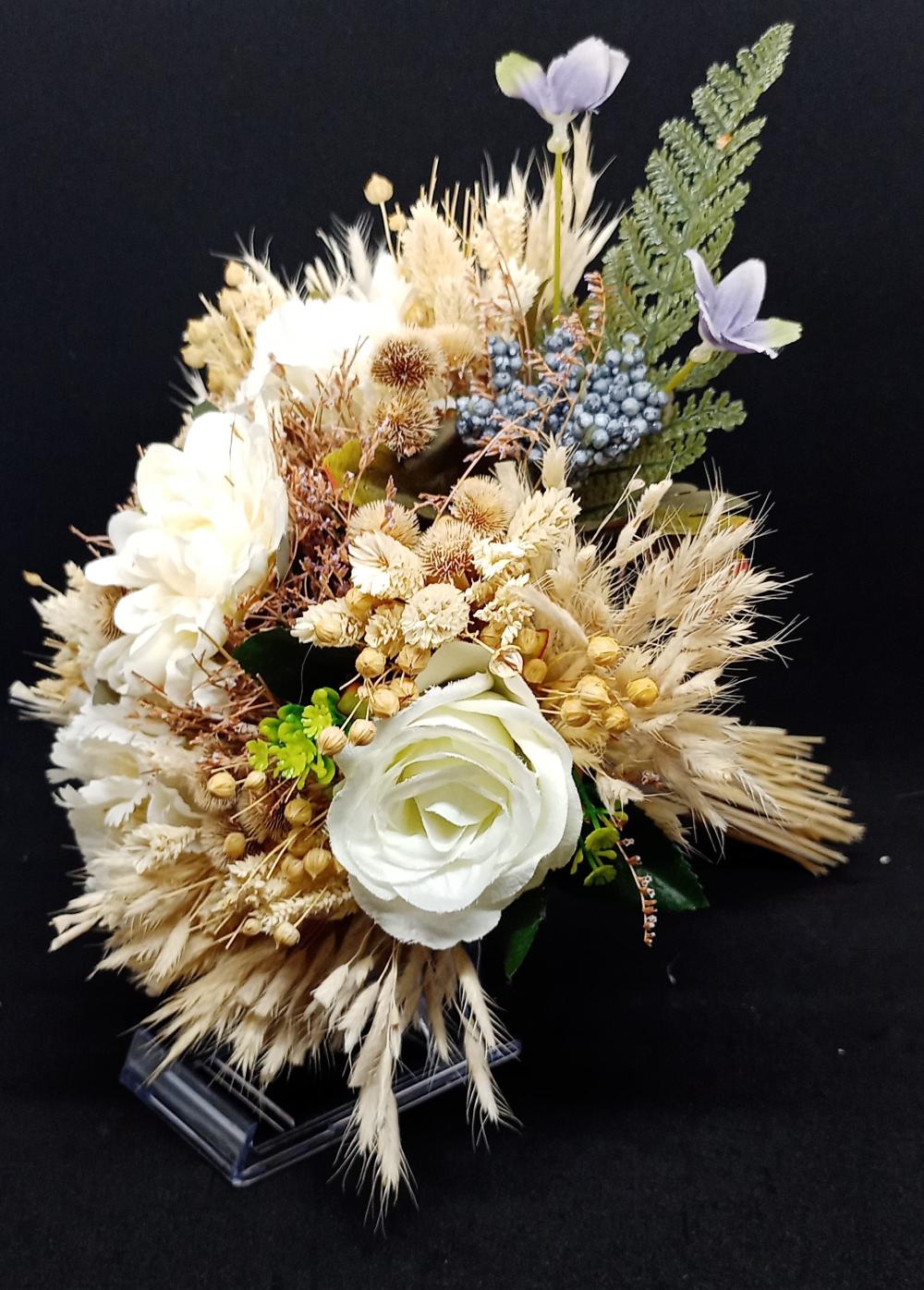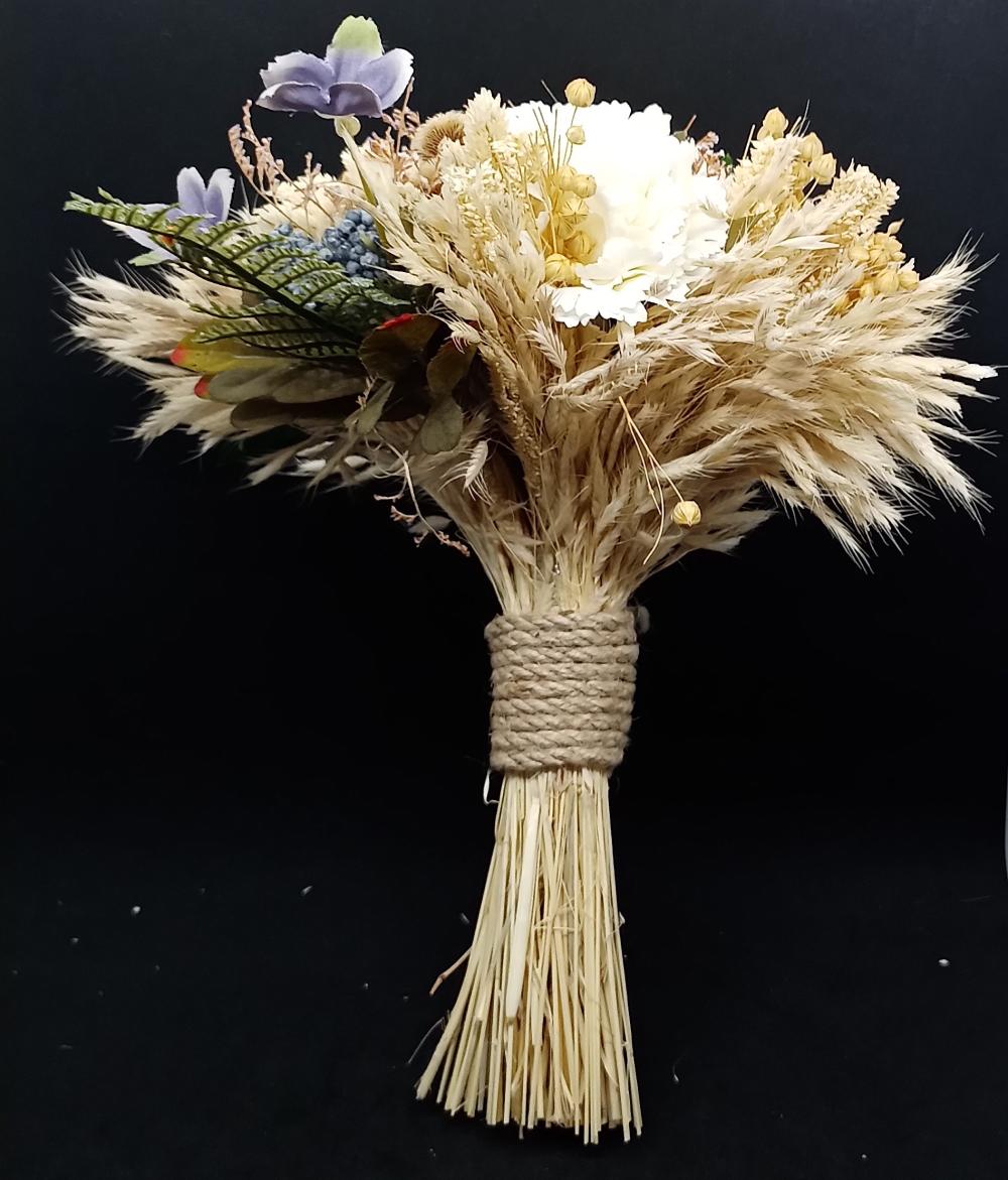 Krem rengi sapa sahip kahve rengi otlarla süslenmiş beyaz aranjman yapay gelin buketi.