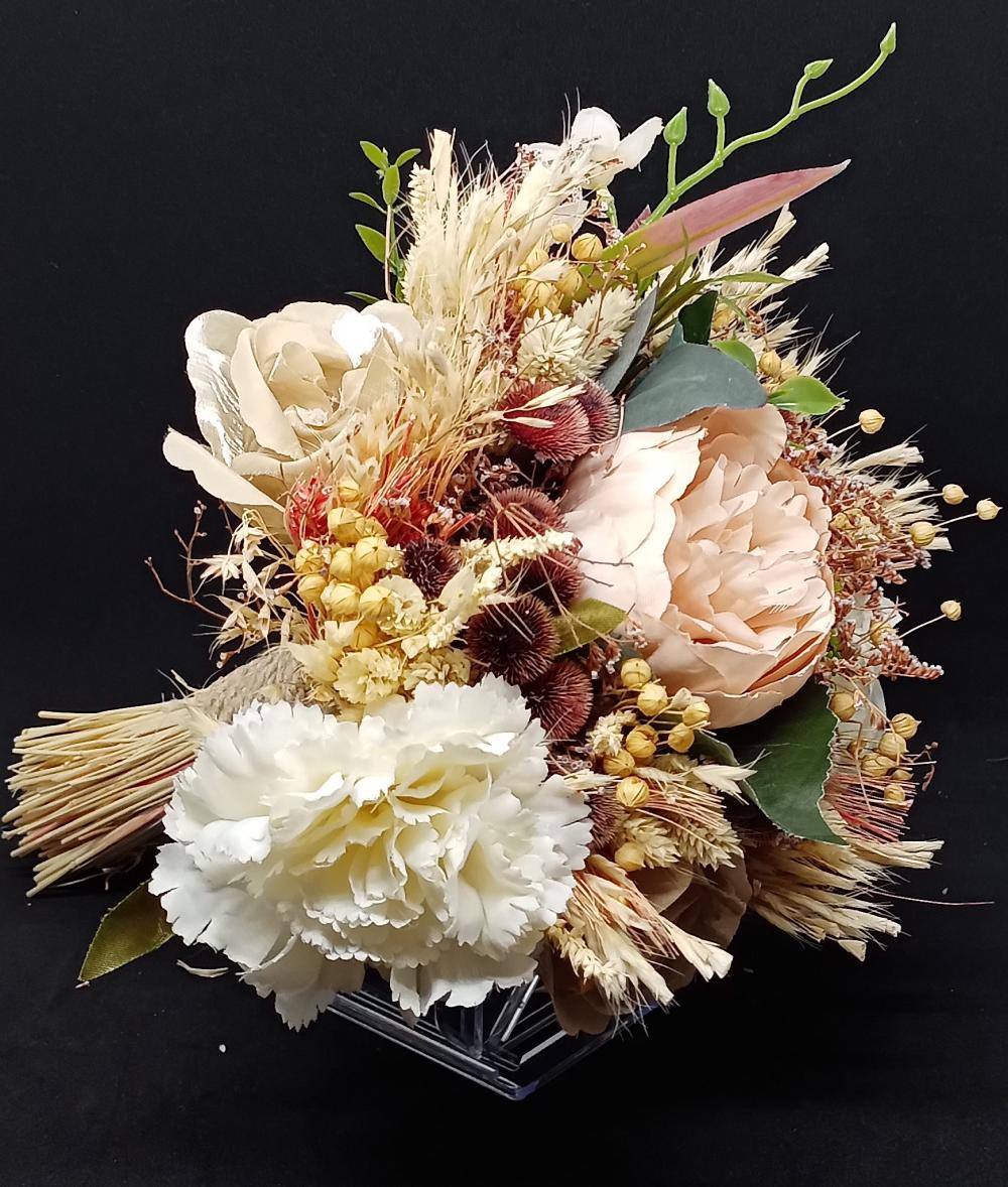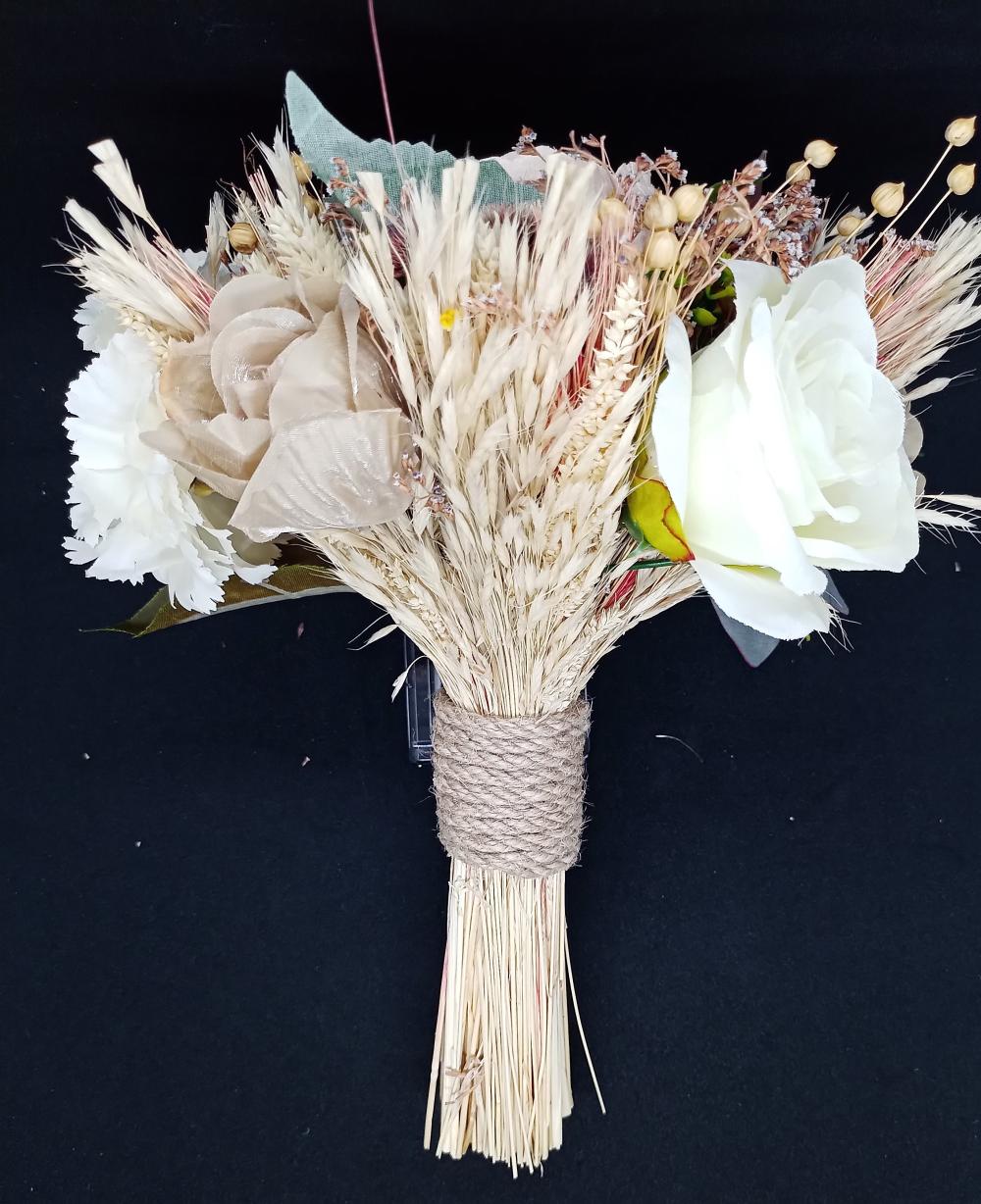 Krem rengi sapa sahip pembe beyaz gül ve karanfil detaylı yapay gelin buketi.