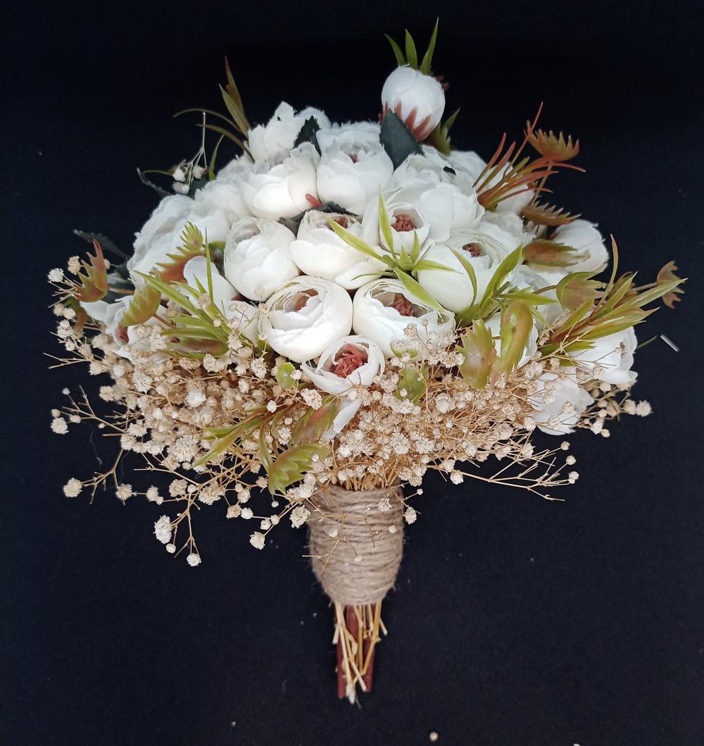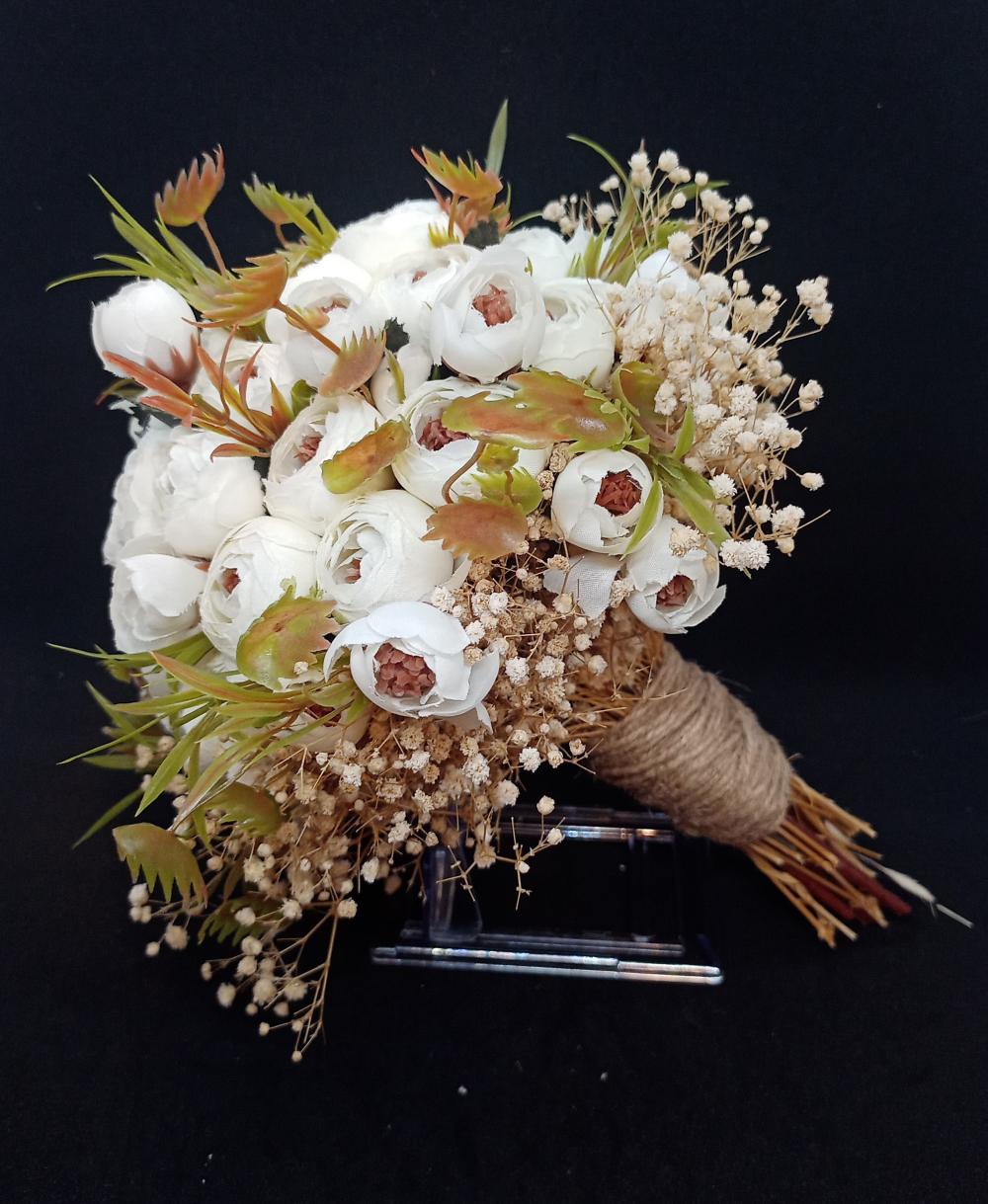 Yeşil detaylara sahip kahve rengi saplı kahve ve krem tonlarında cipsolarla süslenmiş beyaz şakayık yapay gelin buketi.