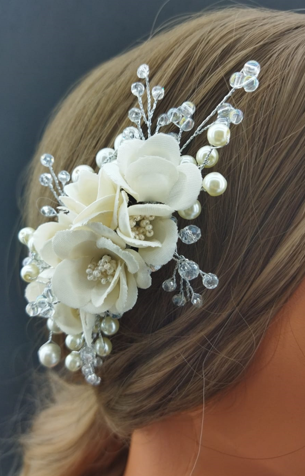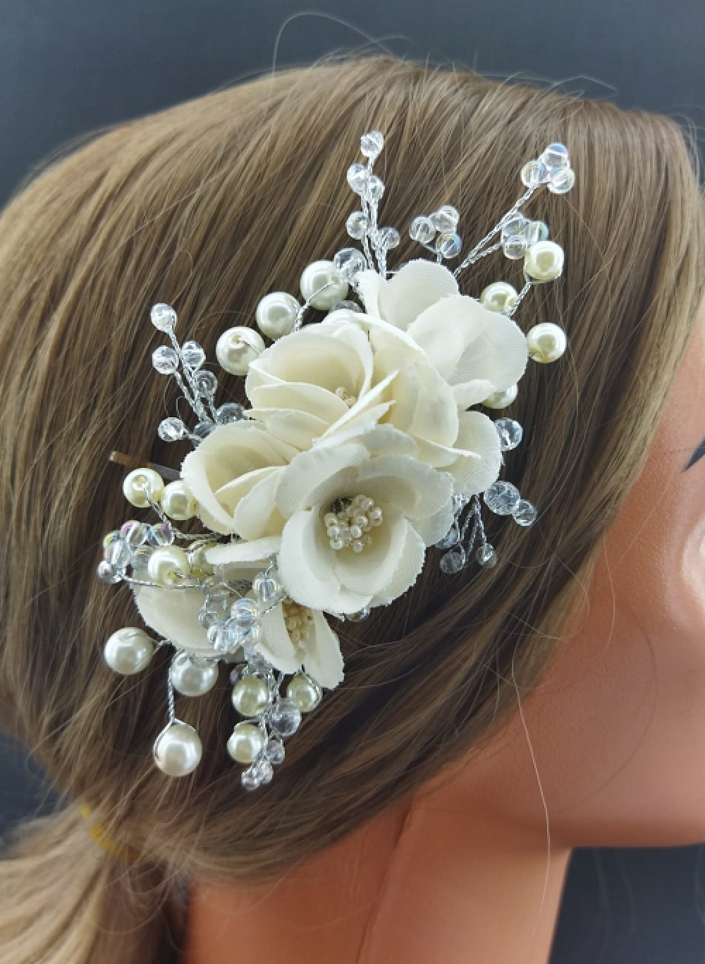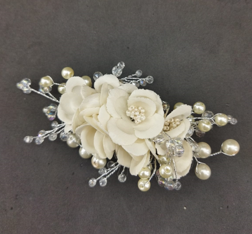 Kır Beyaz Güllerle Süslenmiş İnci Ve Kristal Detayları Olan Gelin Tokası