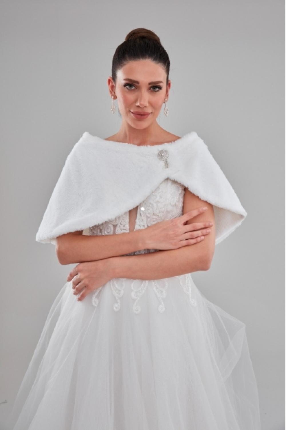 Kısa Beyaz Broş Detaylı Gelin Etol Kürk Bolero