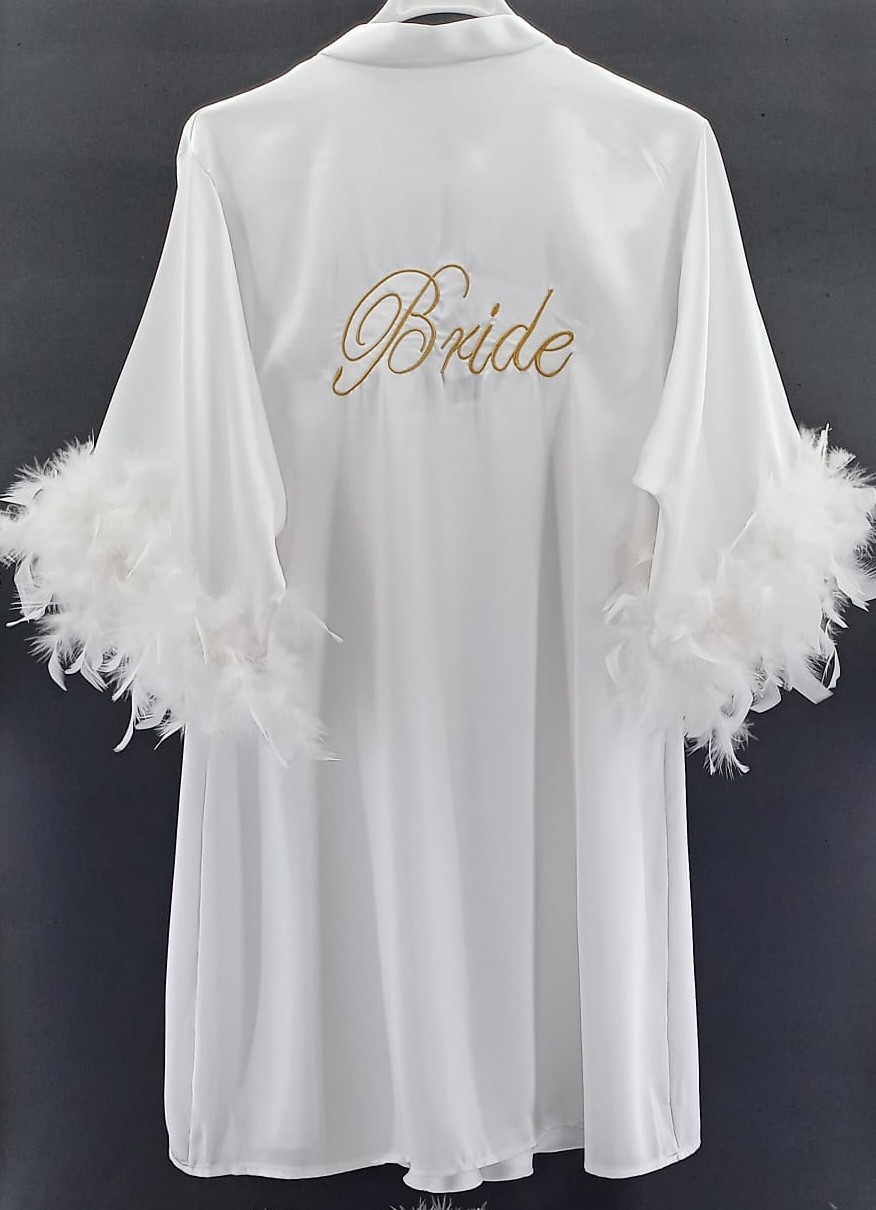 Kişiye Özel İsim Yazdırmalı Gold Nakış İşlemeli Tüylü Model Bride Sabahlık
