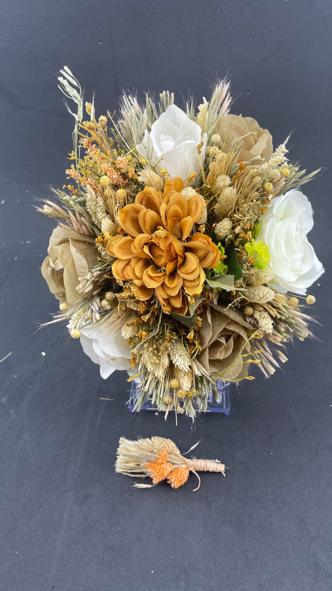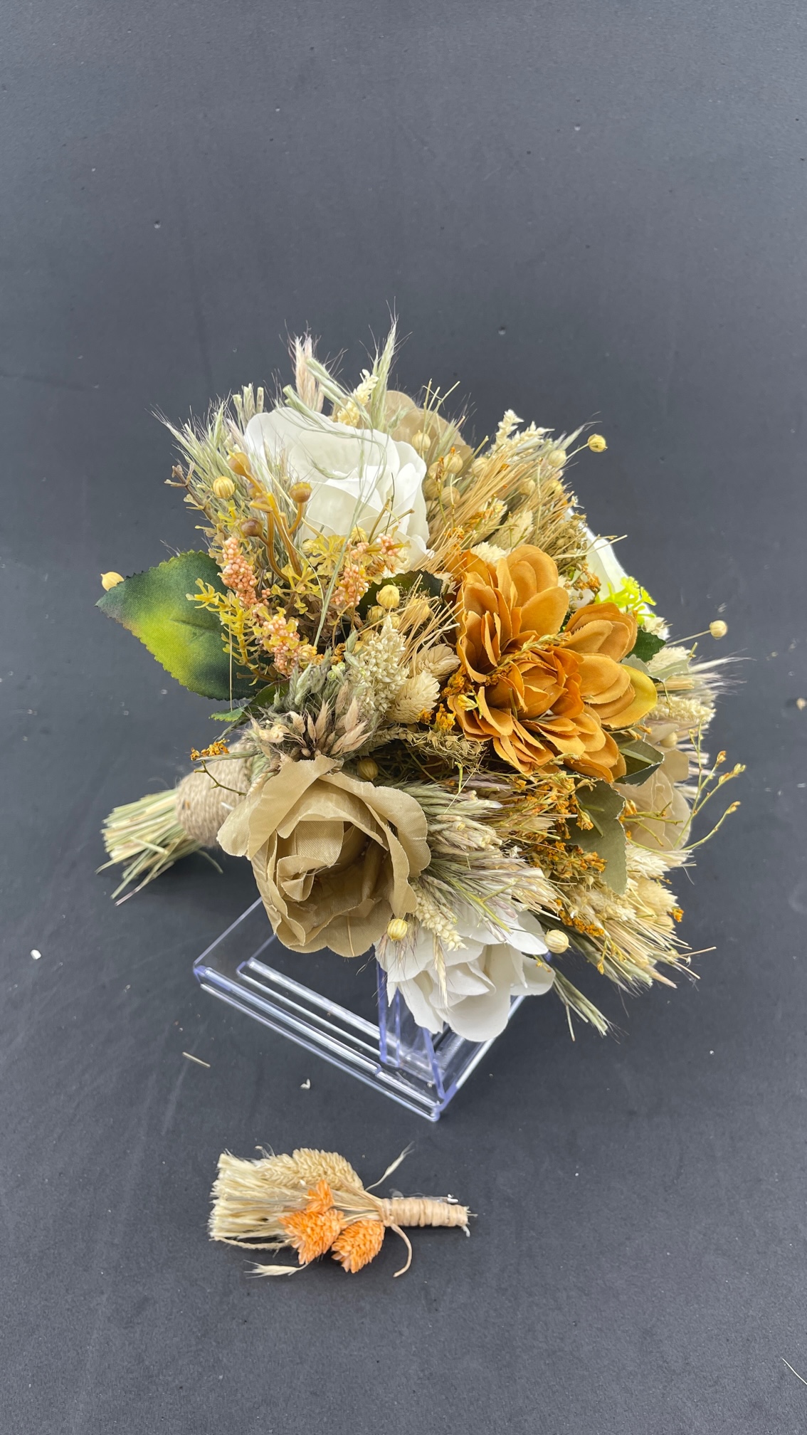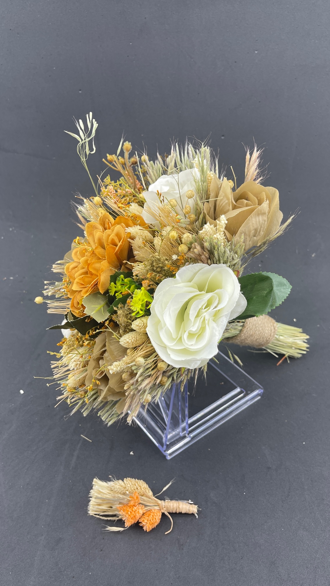 Krem Cipsolarla Yeşil Yapraklarla Süslenmiş Aranjman Gelin Buketi Ve Damat Yaka Çiçeği