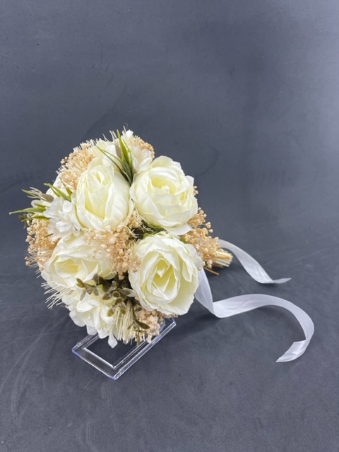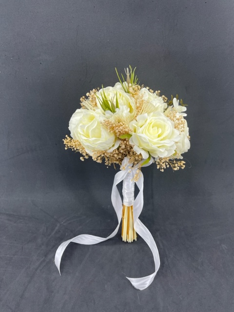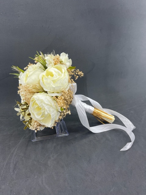 Krem Cipsolarla Yeşil Yapraklarla Süslenmiş Şakayık Ve Gül Gelin Buketi