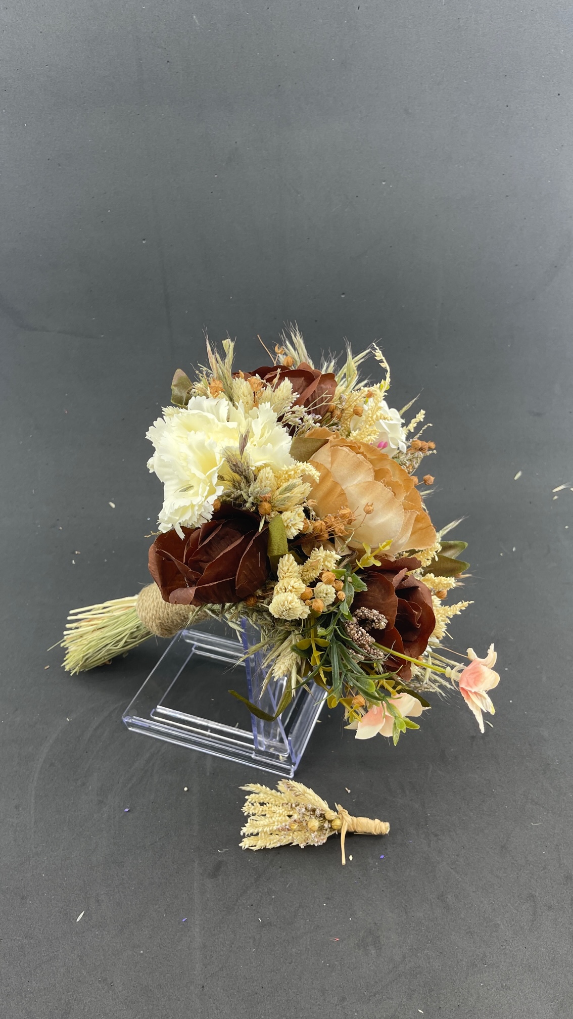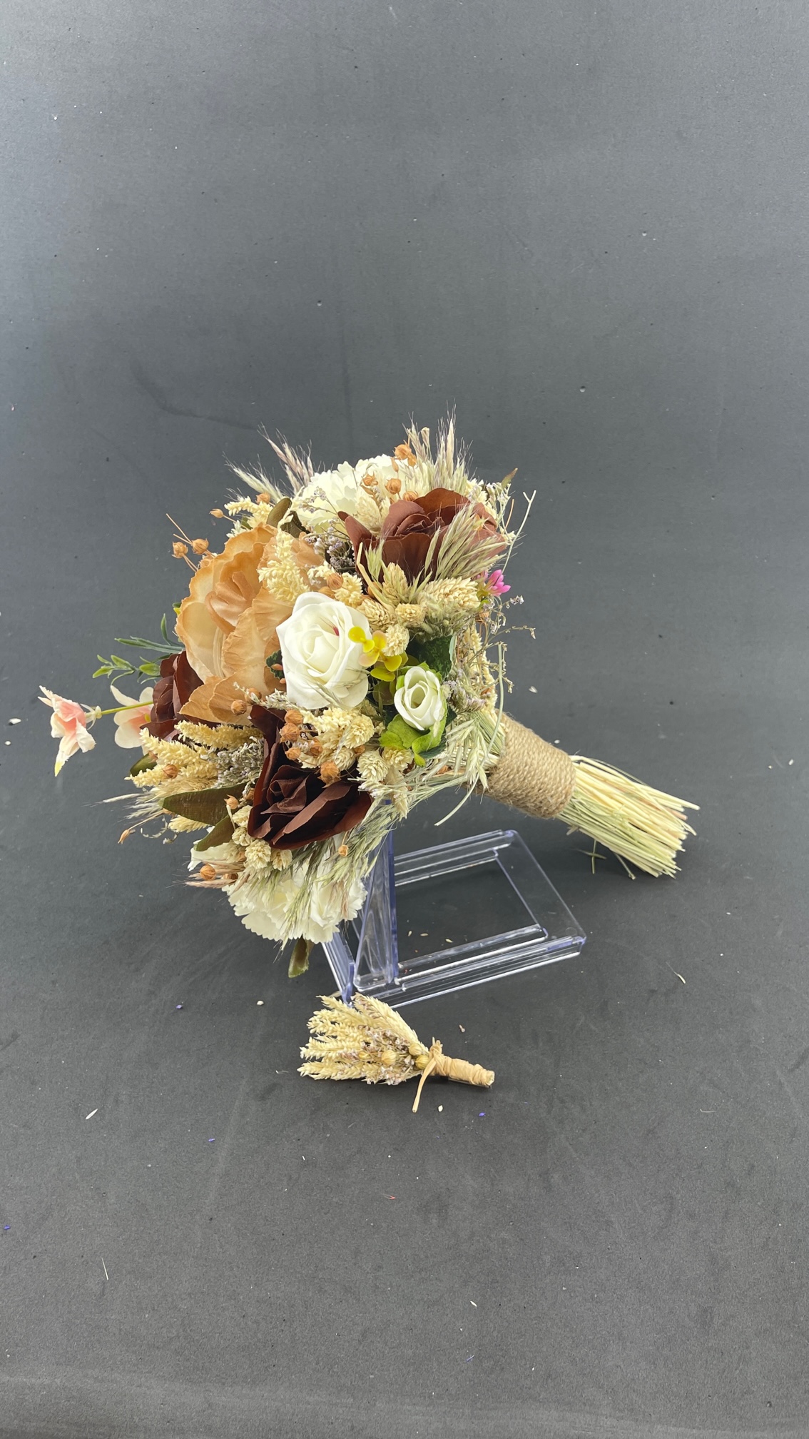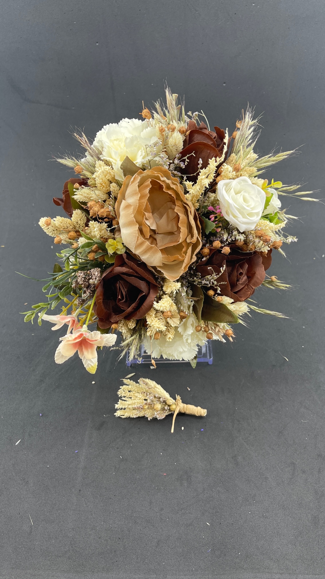 Krem Kahve Bej Renklerde Aranjman Gelin Buketi ve Damat Yaka Çiçeği