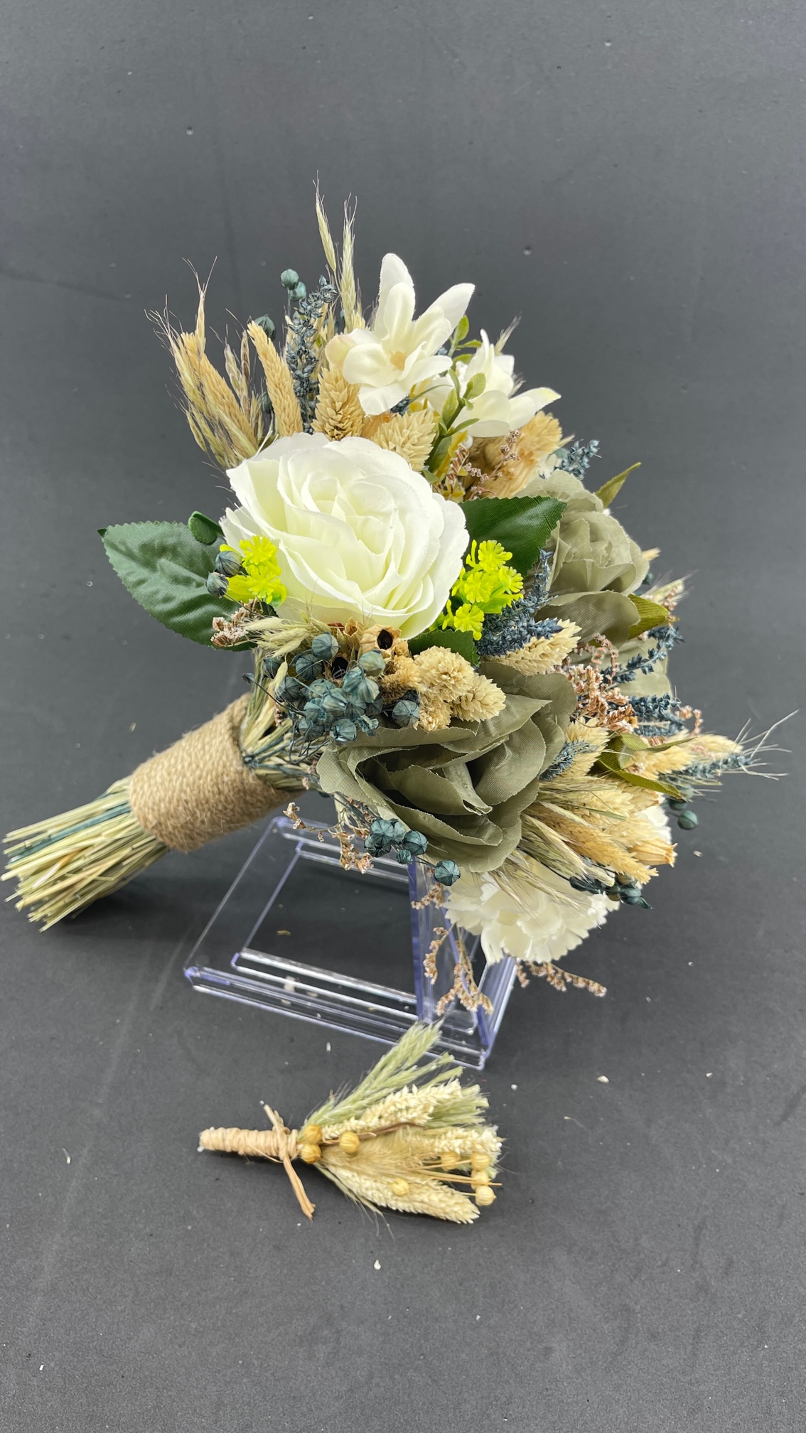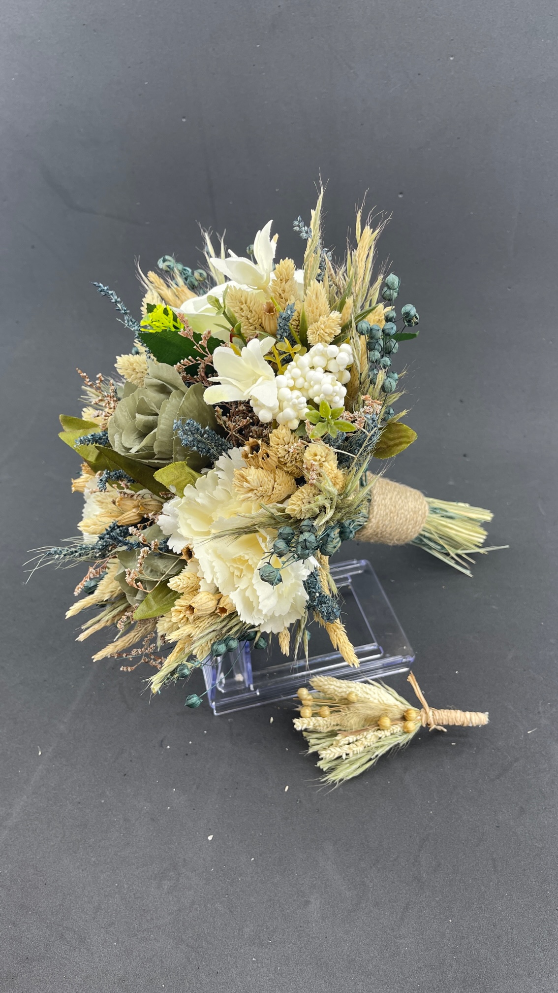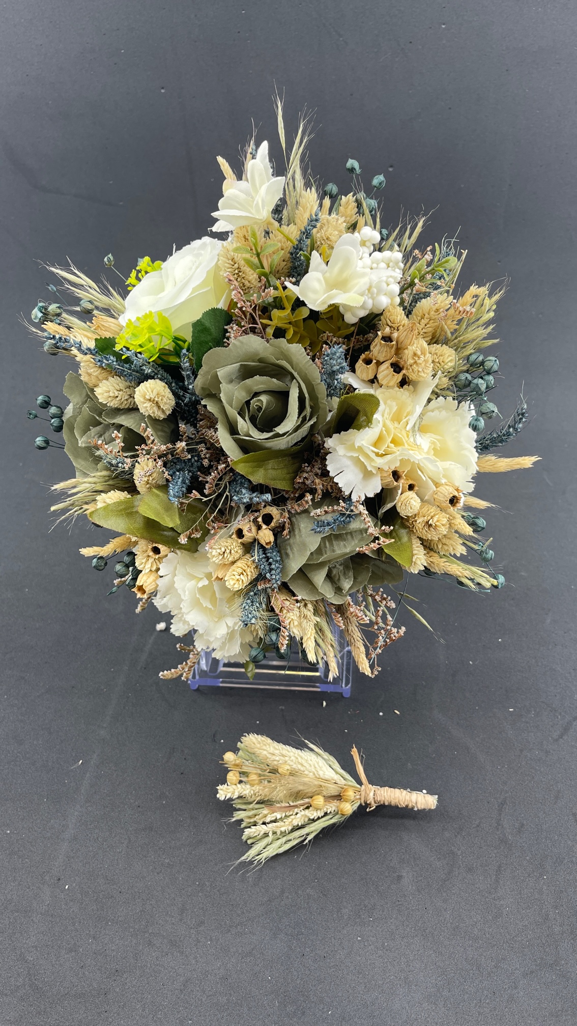 Krem Yeşil Tonlarda Aranjman Gelin Buketi Ve Damat Yaka Çiçeği