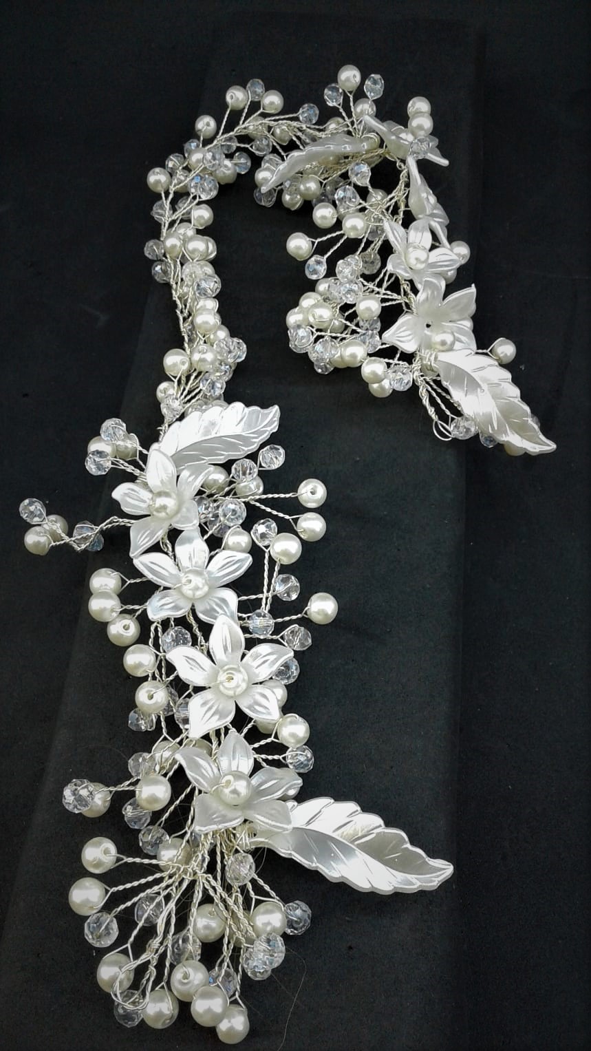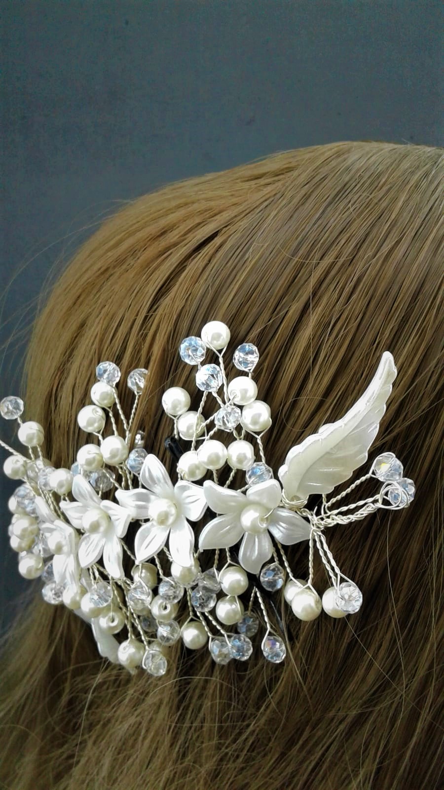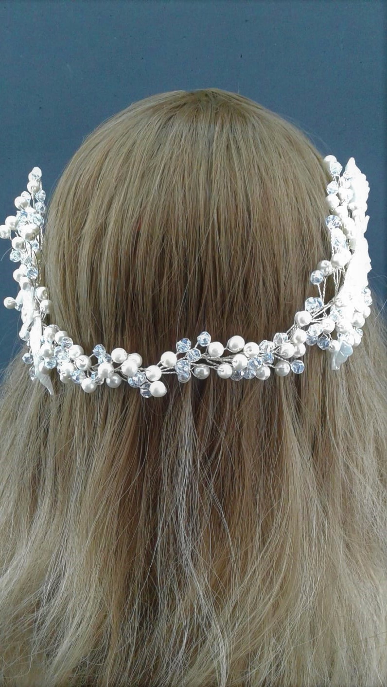 Kristal Boncuk Ve İnci İşlemeli Sedef Çiçek Detaylara Sahip Helen Tac