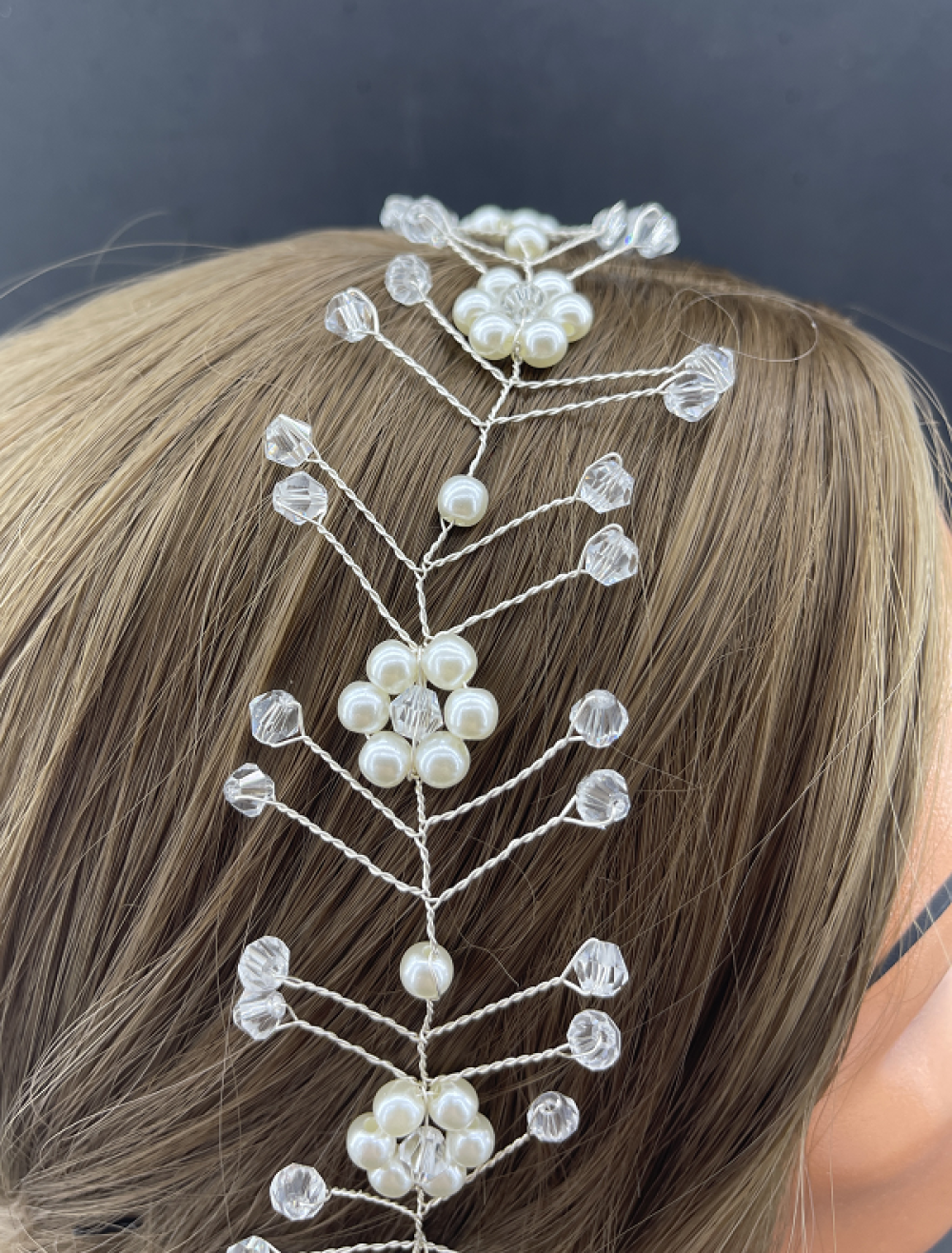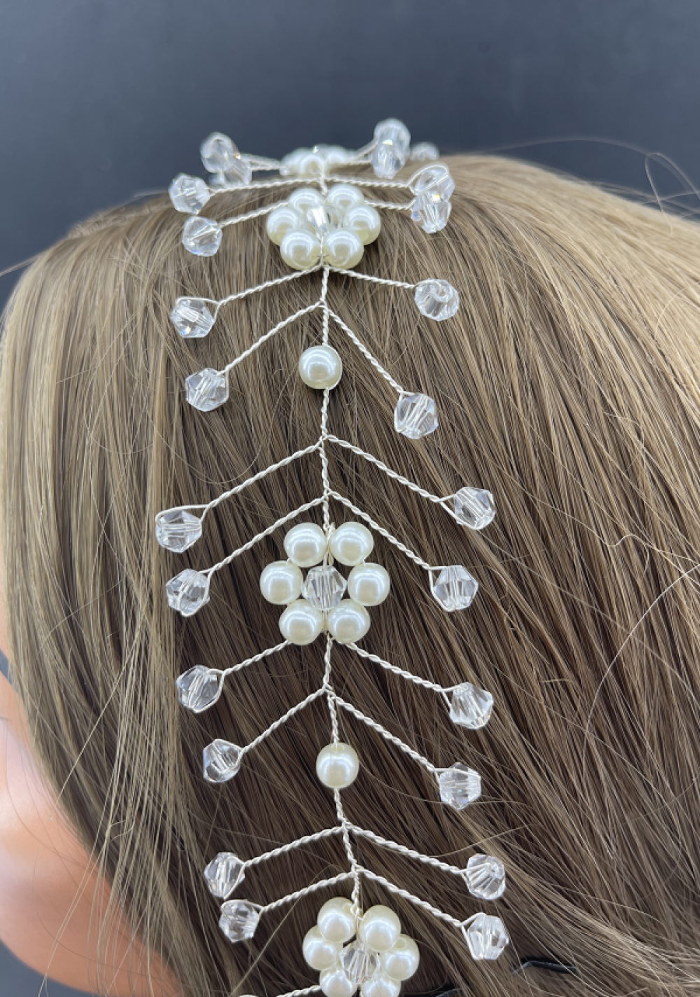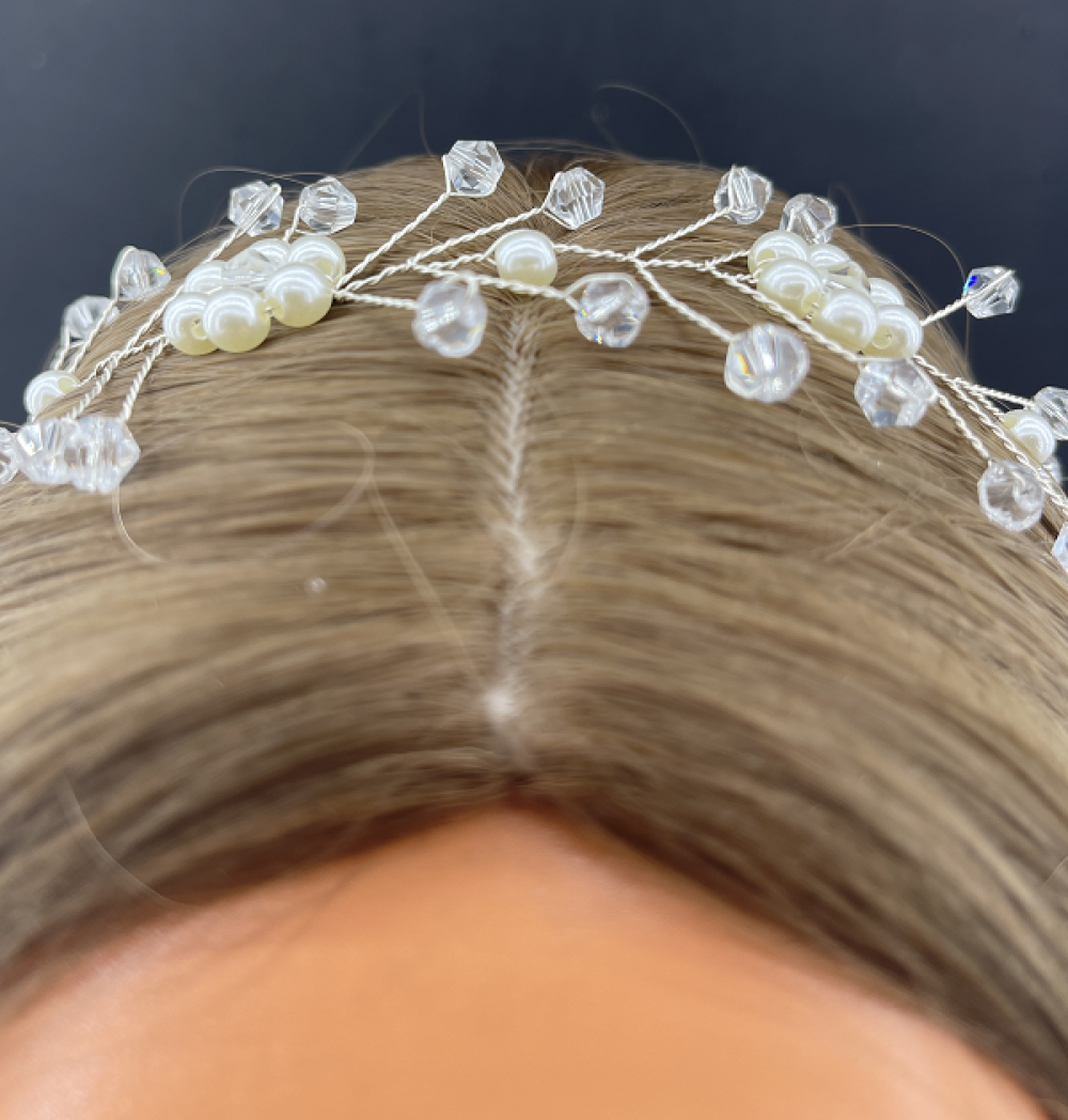 Kristal Detaylı Top İncilerle Çiçek Deseni Verilmiş Gelin Tacı