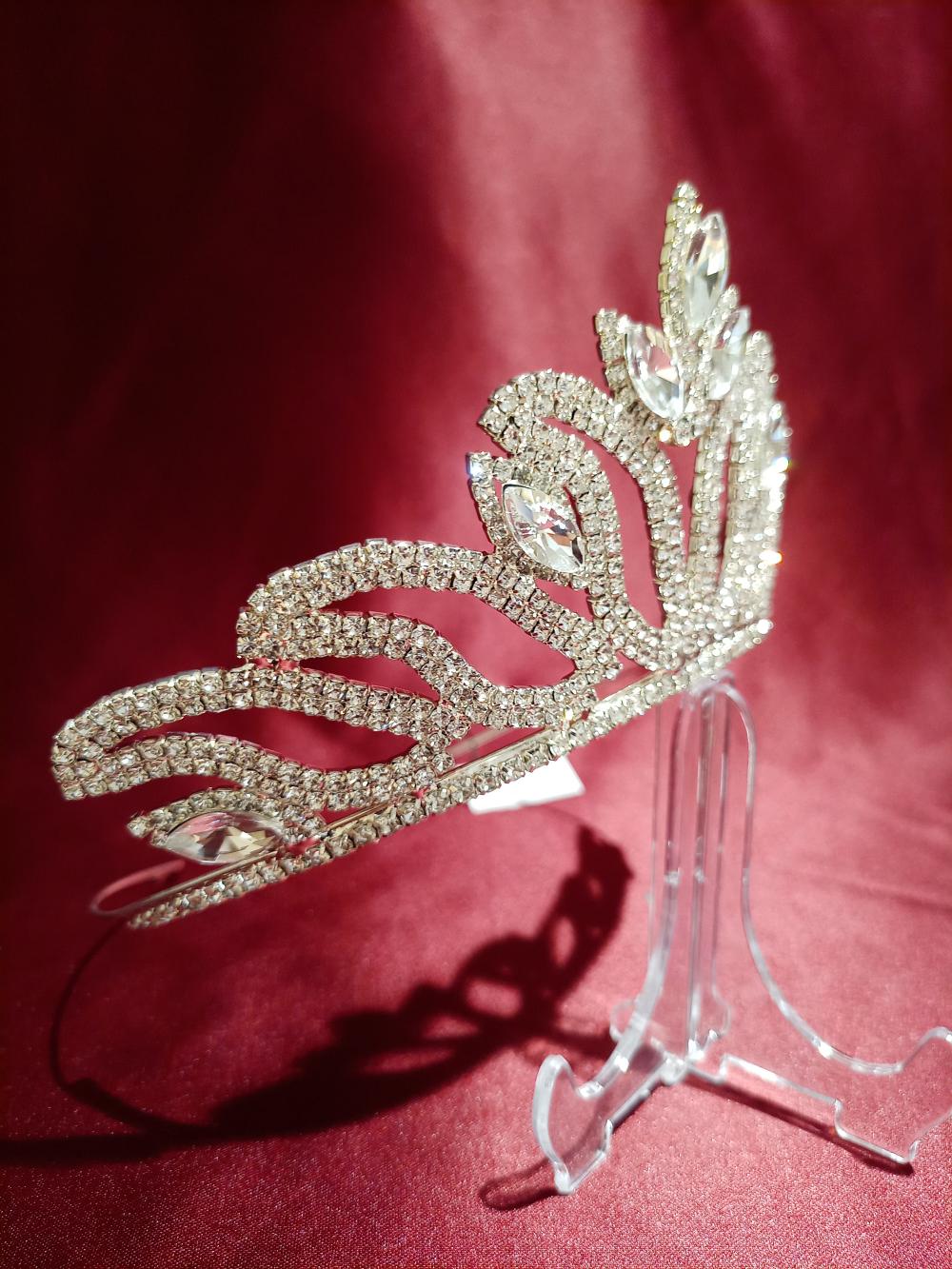 Kristal taşlara sahip yaprak modelli yüksek prenses gelin tacı.