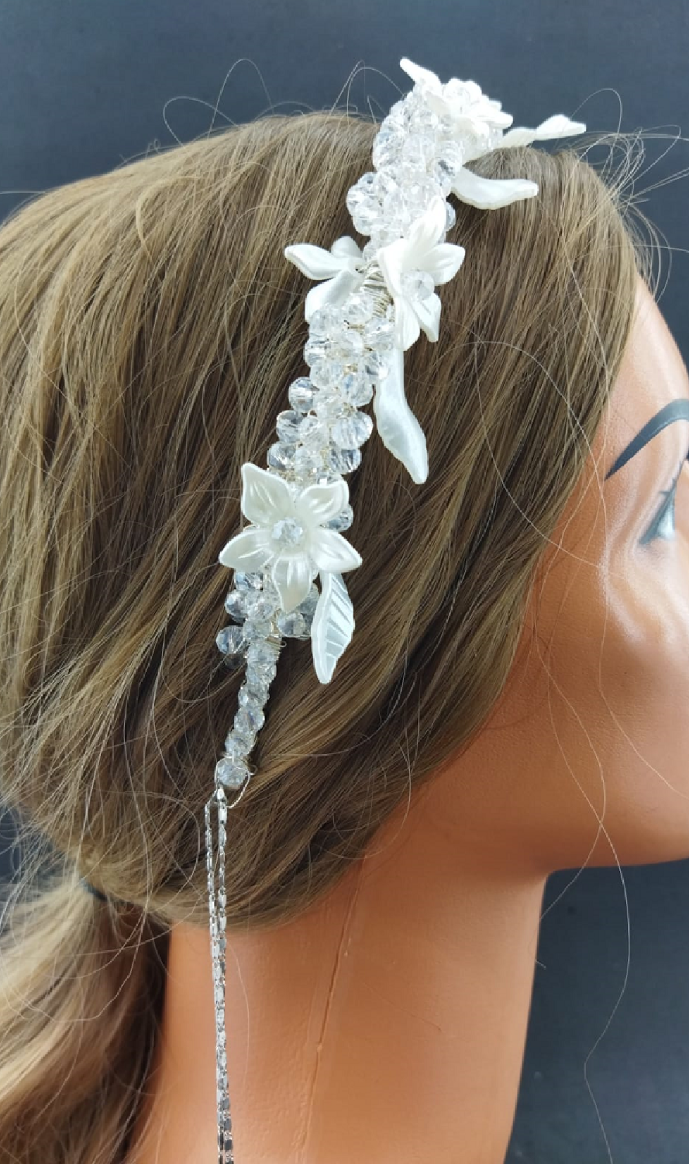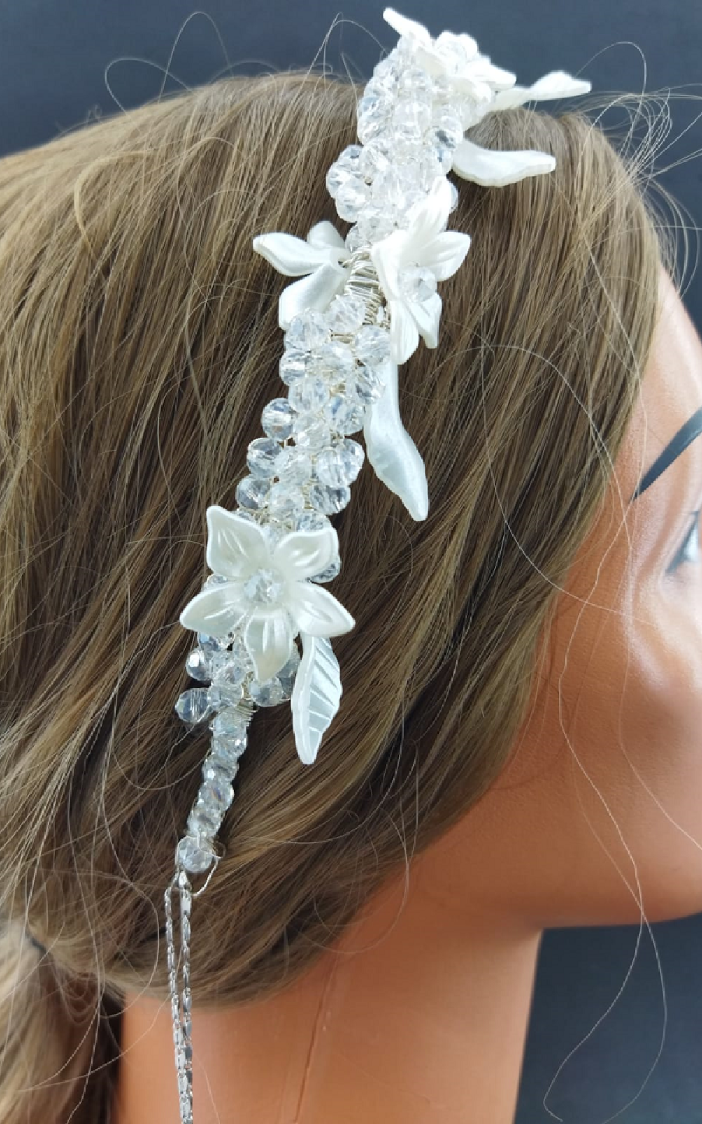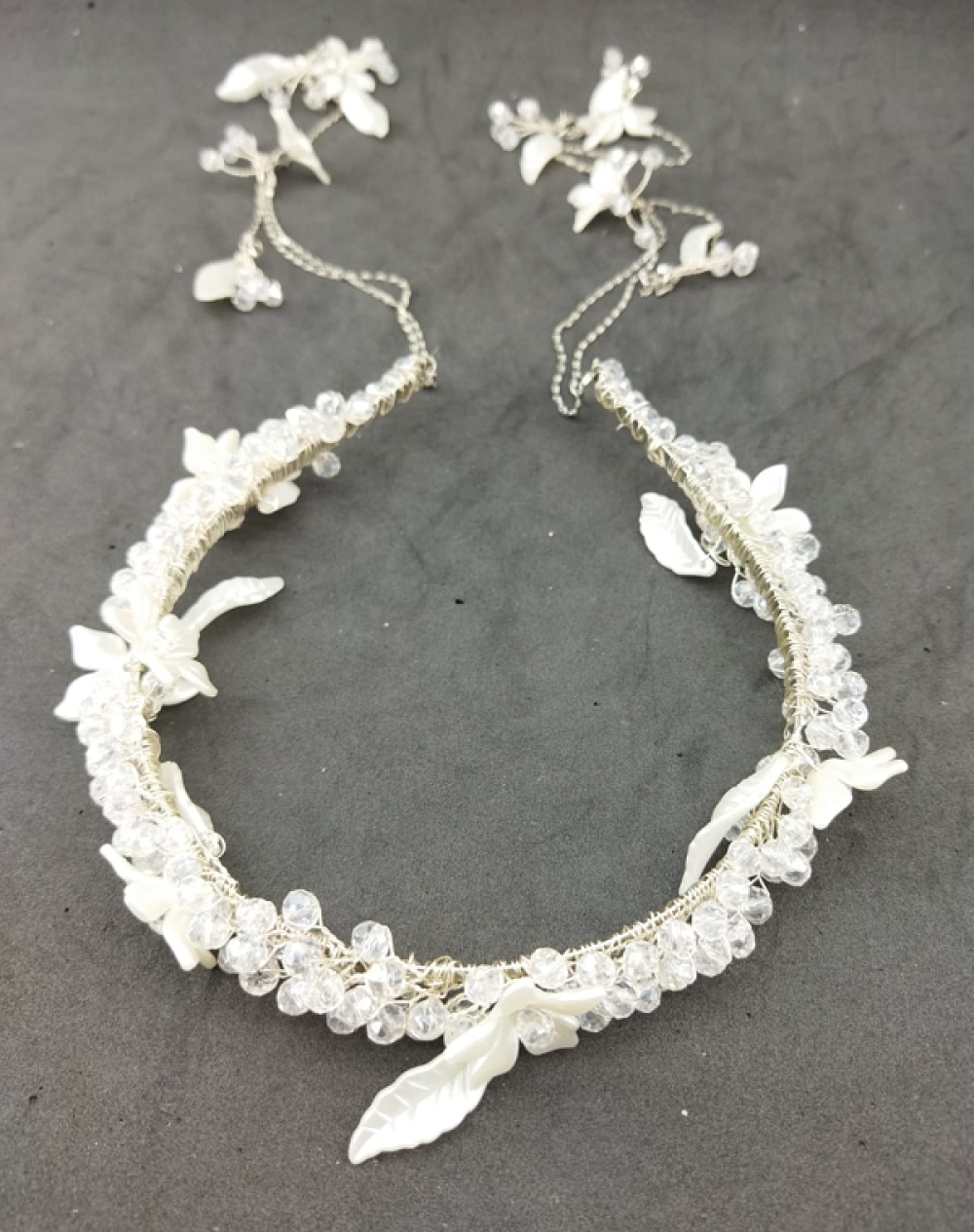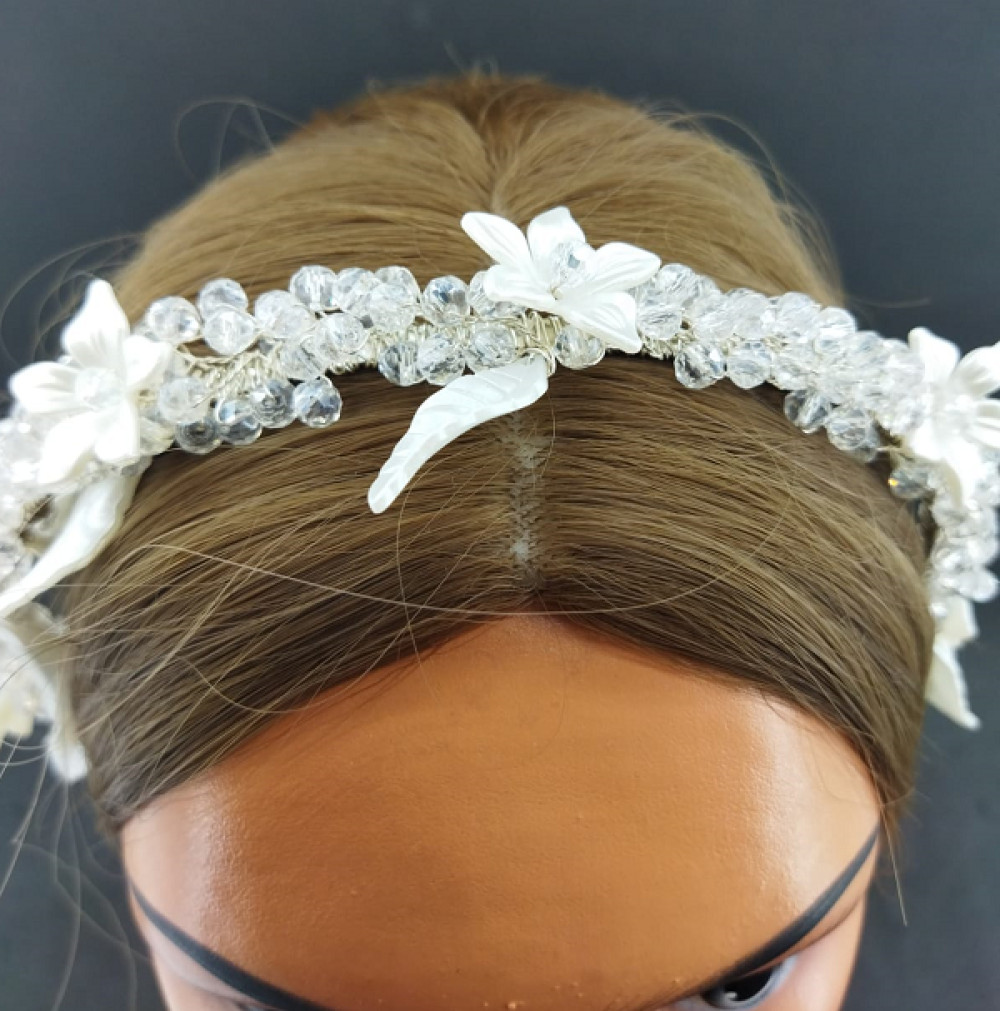 Kristallerle Süslenmiş Beyaz Çiçek Detaylı Gelin Tacı