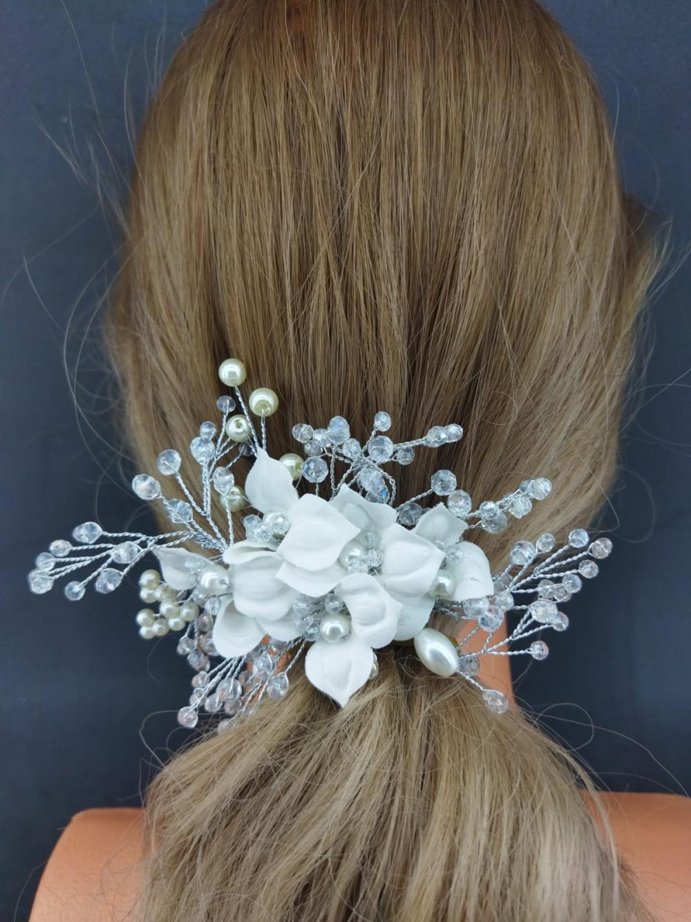 Kristallerle Süslenmiş İnci Detaylı Beyaz Gala Gelin Saç Tokası