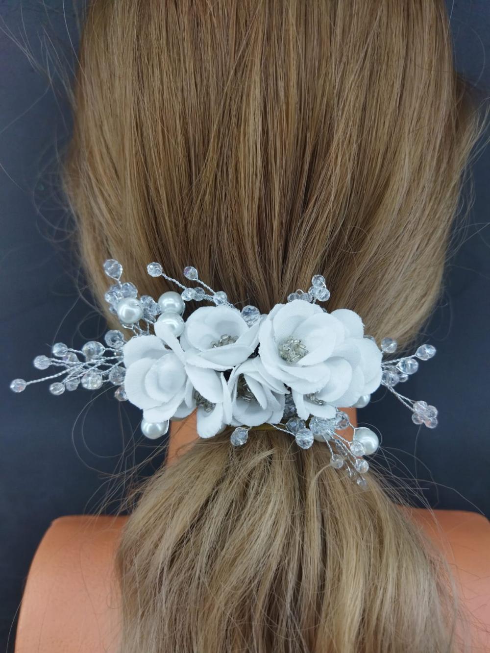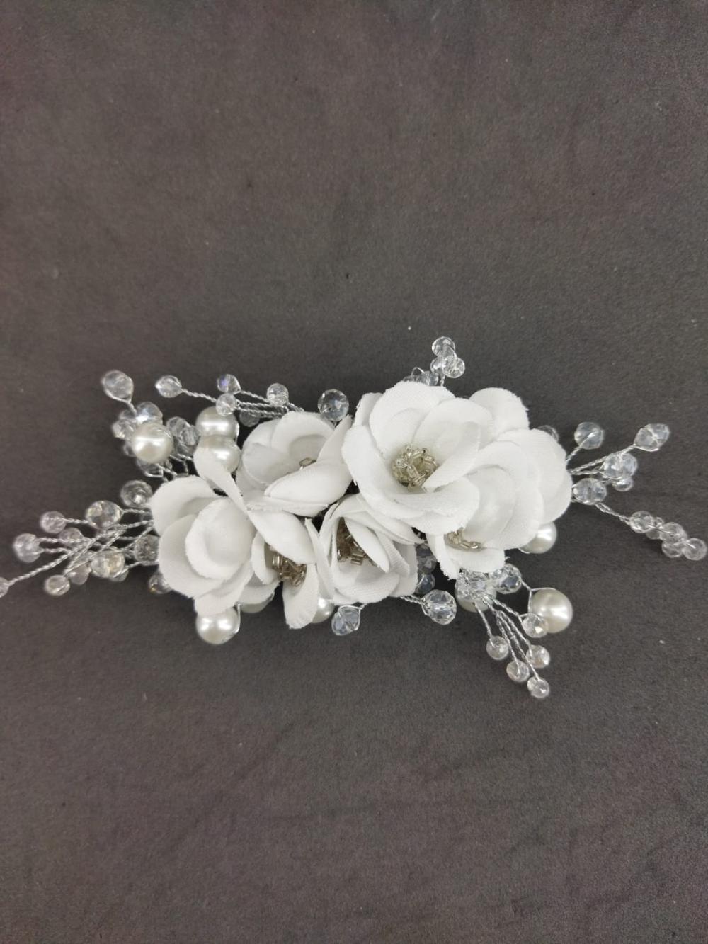 Kristallerle Süslenmiş İnci Detaylı Beyaz Gül Gelin Saç Tokası