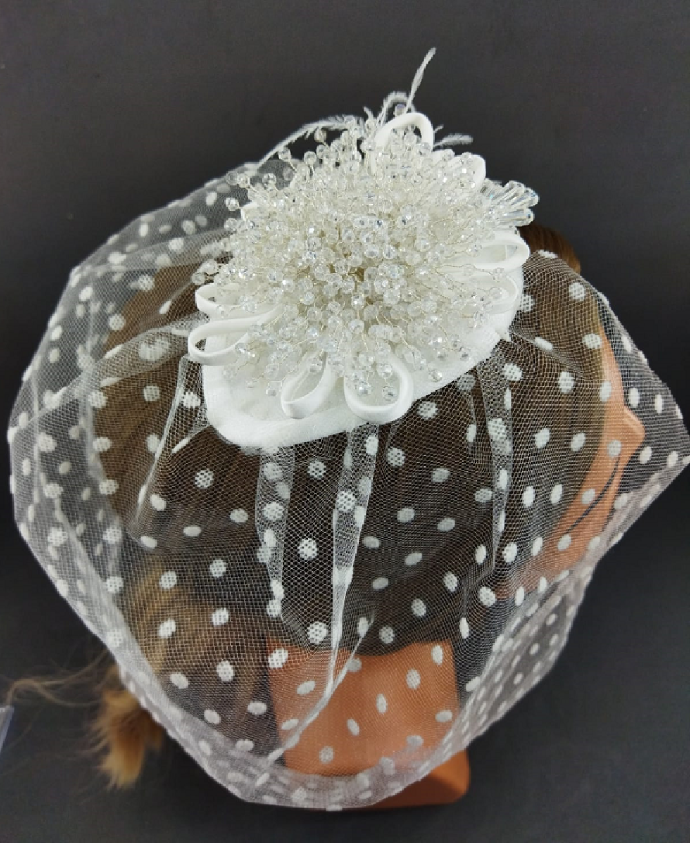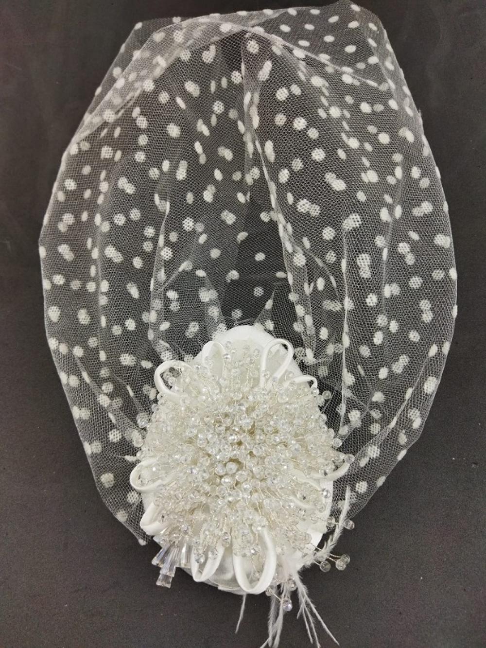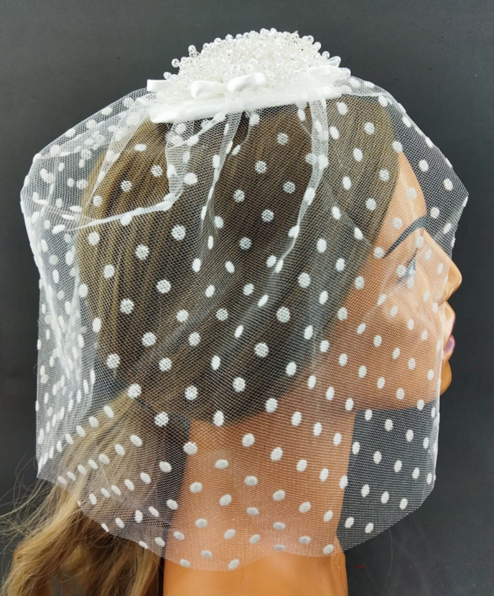 Kristallerle Süslenmiş Puantiyeli Gelin Vualet Şapka Nikah Kepi