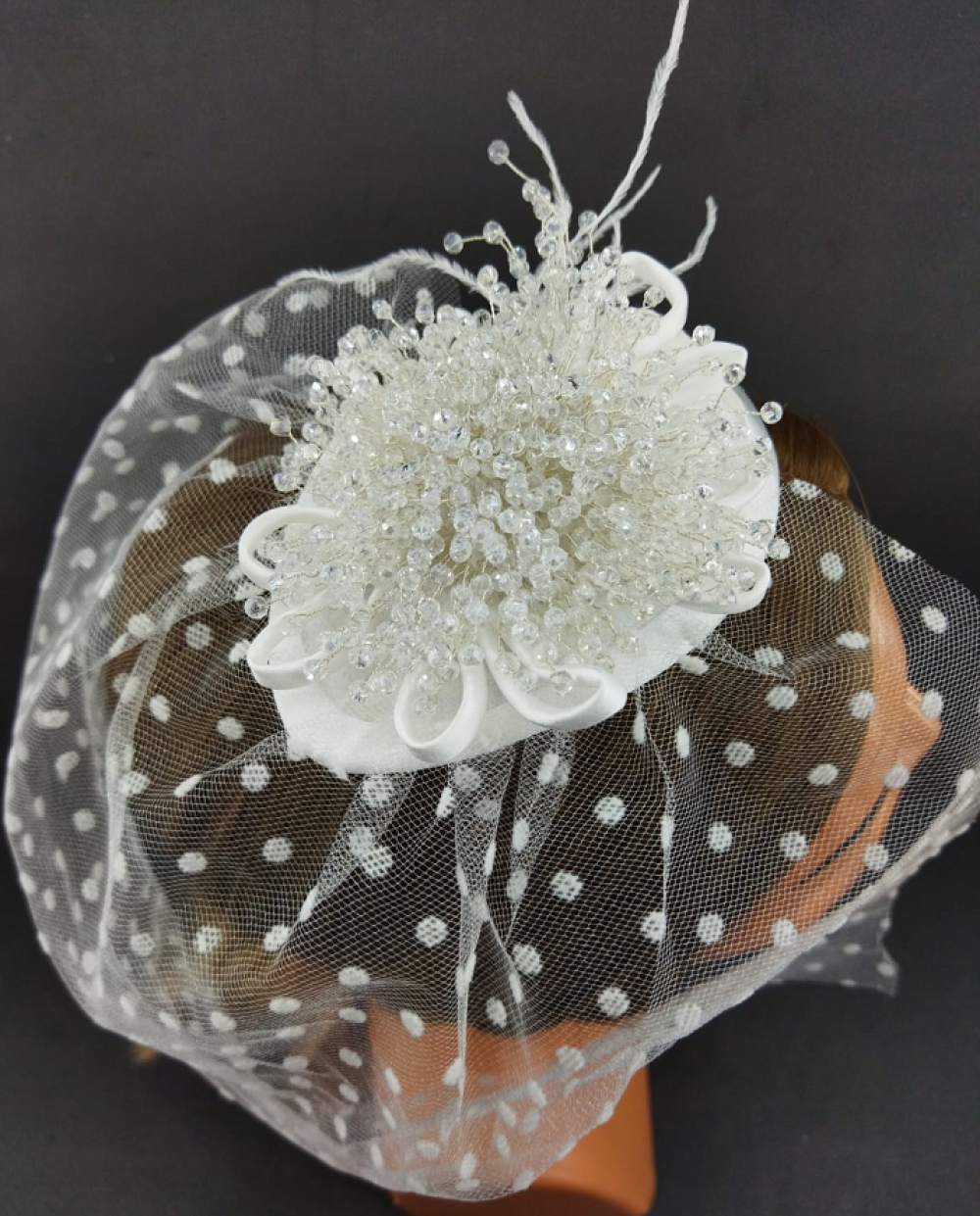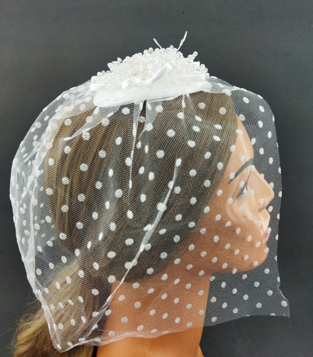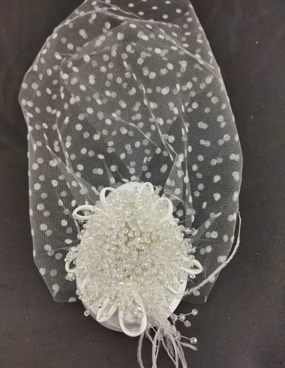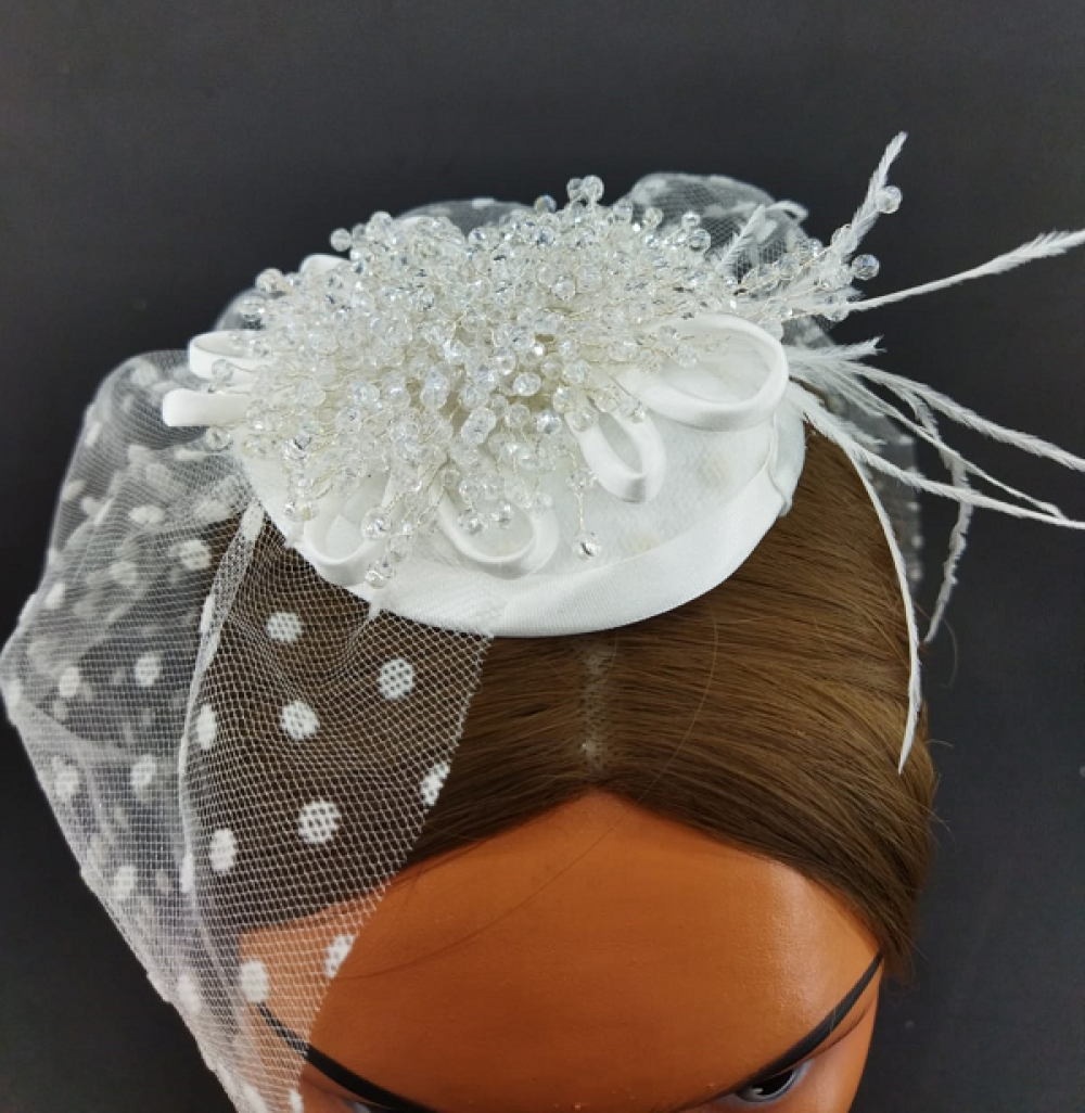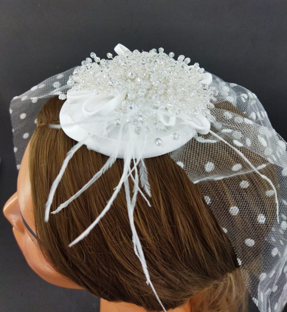 Kristallerle Süslenmiş Tüylü Ve Puantiyeli Gelin Vualet Şapka Nikah Kepi
