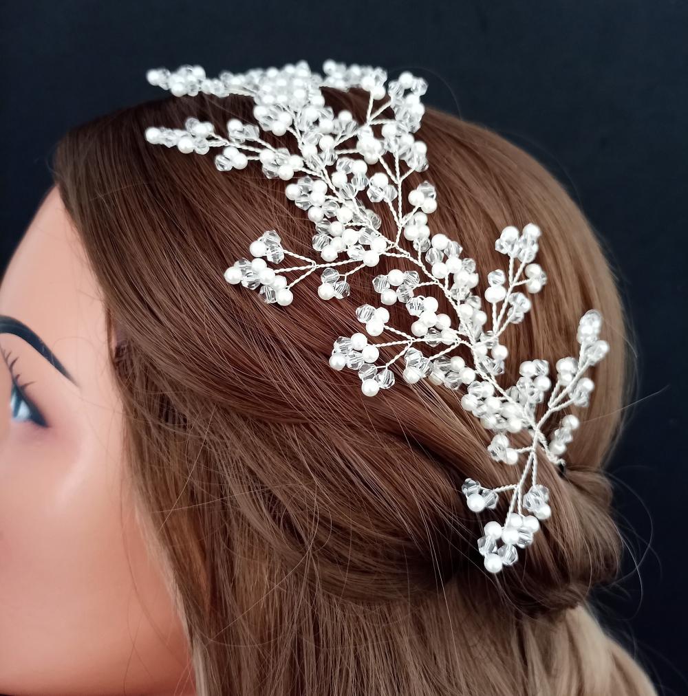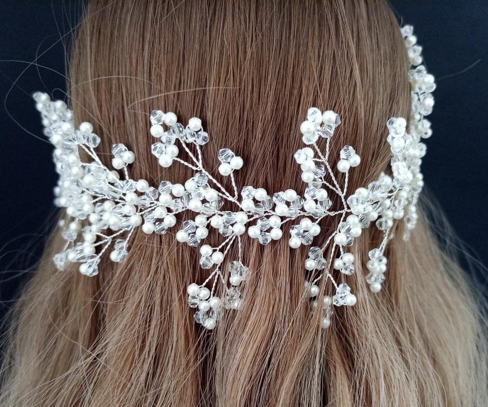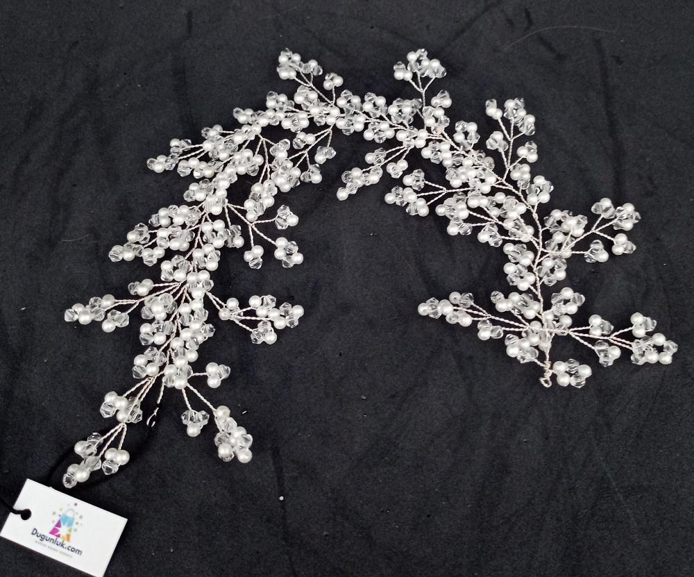Küçük Beyaz İncilerle Süslenmiş Kristal Detayları Olan Gelin Tacı