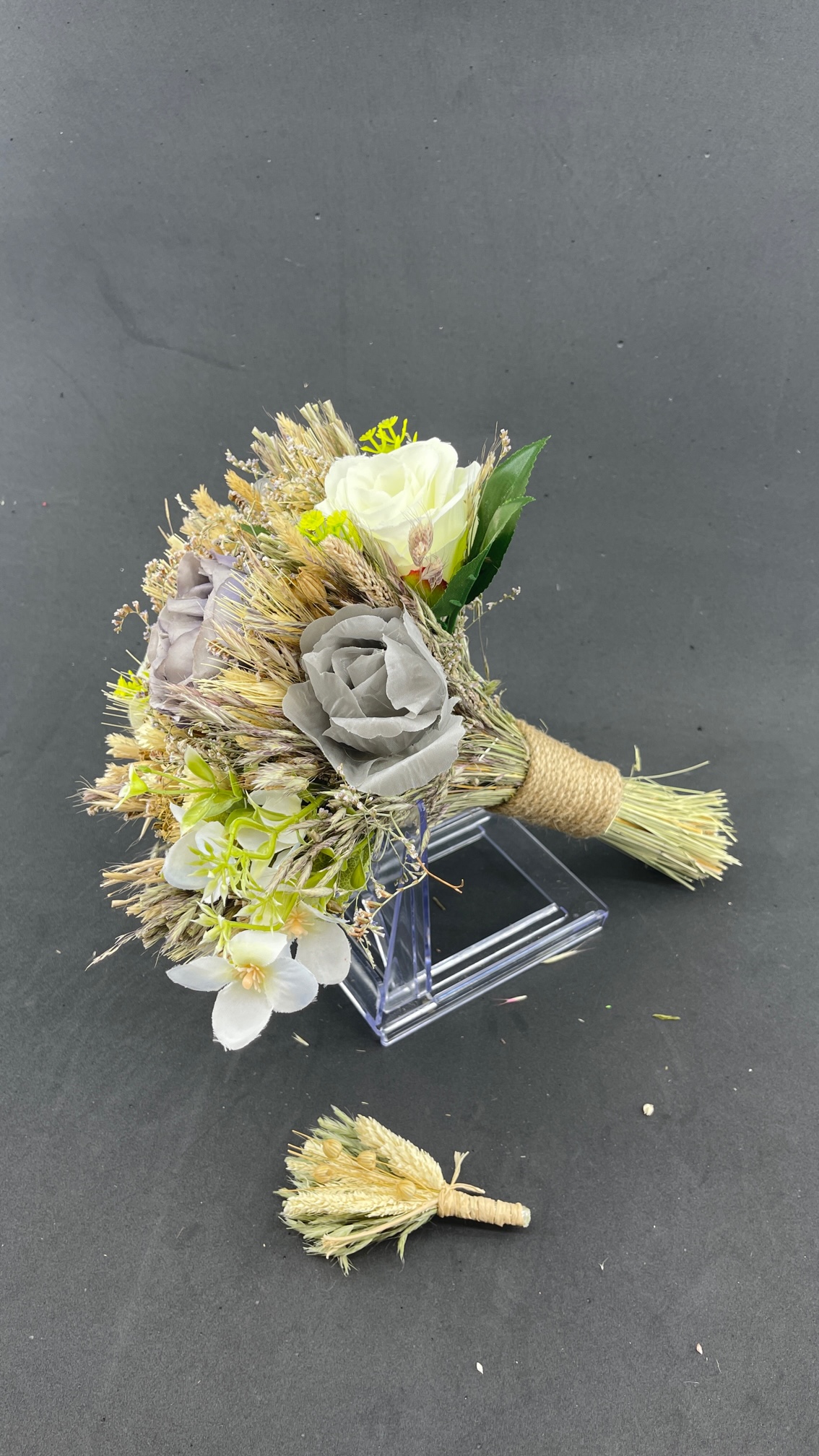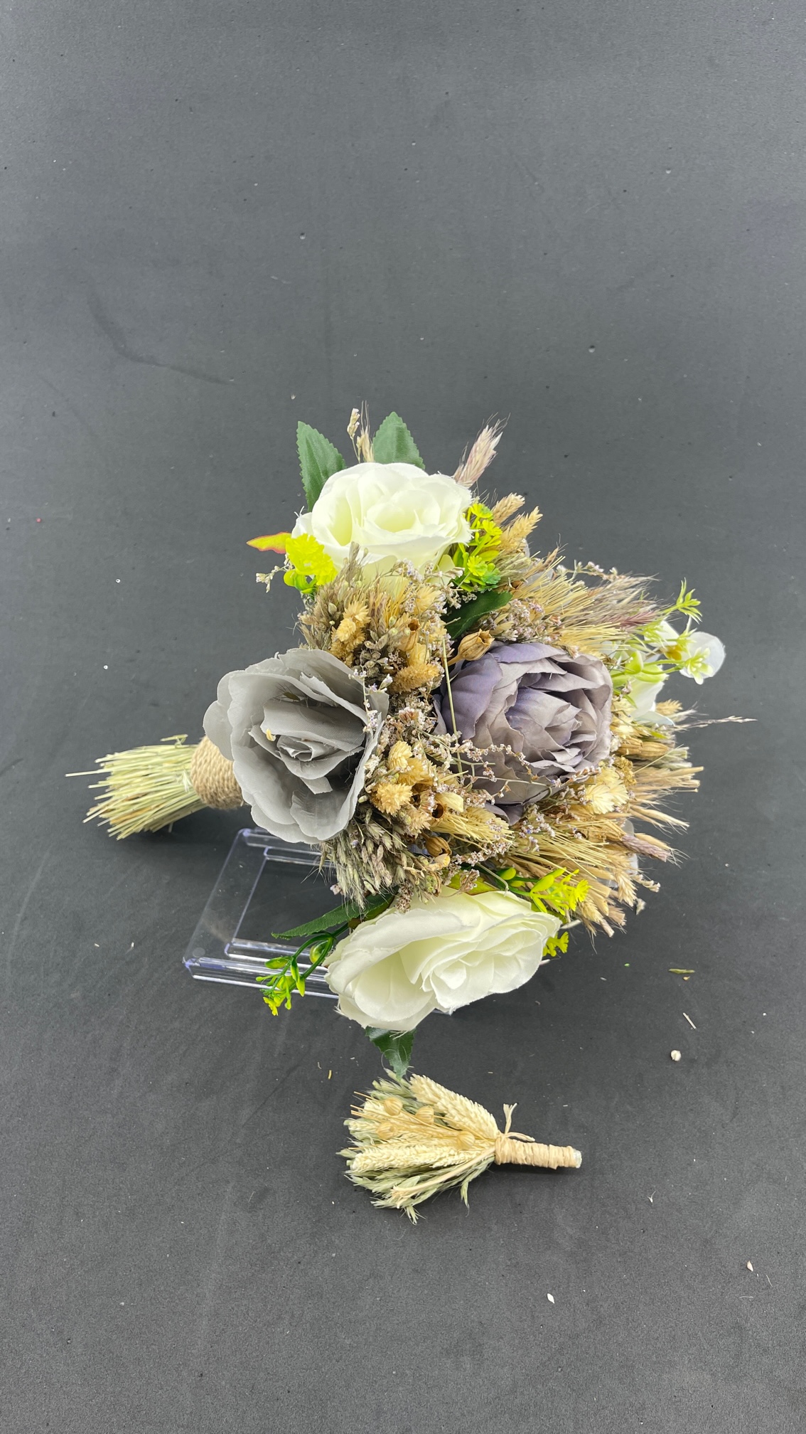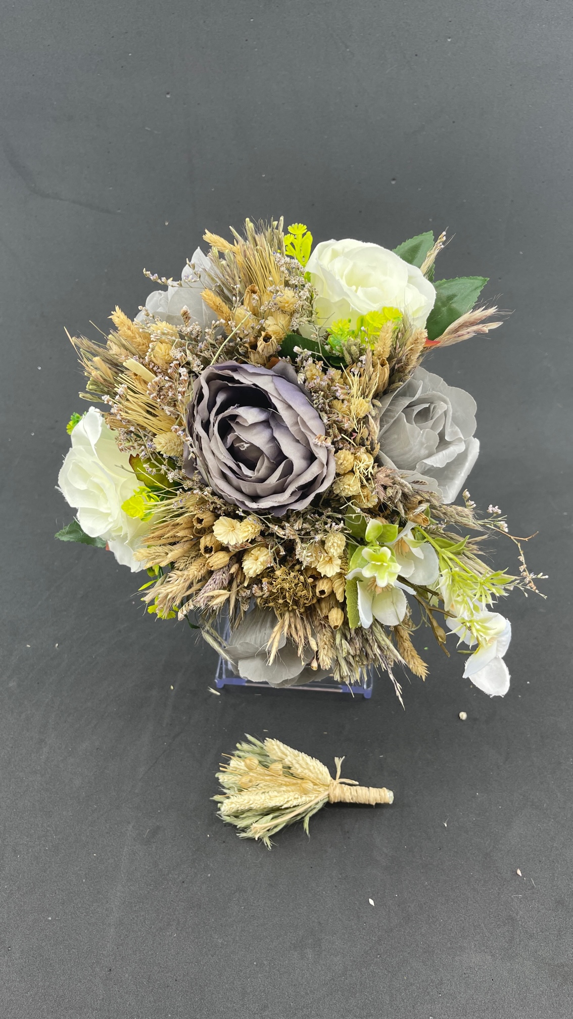 Lila Gri Tonlarda Beyaz Çiçek Detaylı Yapraklı Aranjman Gelin Buketi ve Damat Yaka Çiçeği