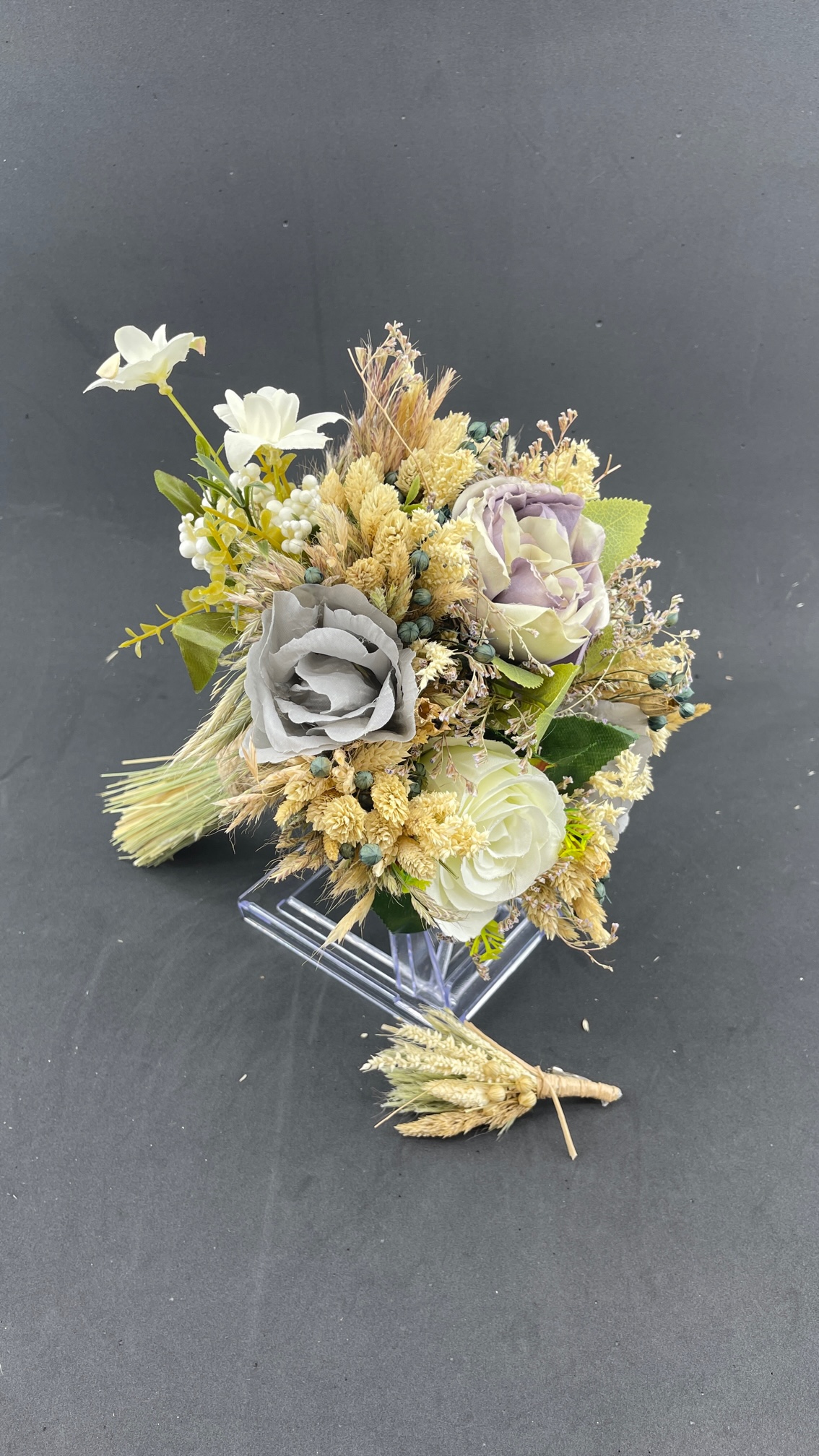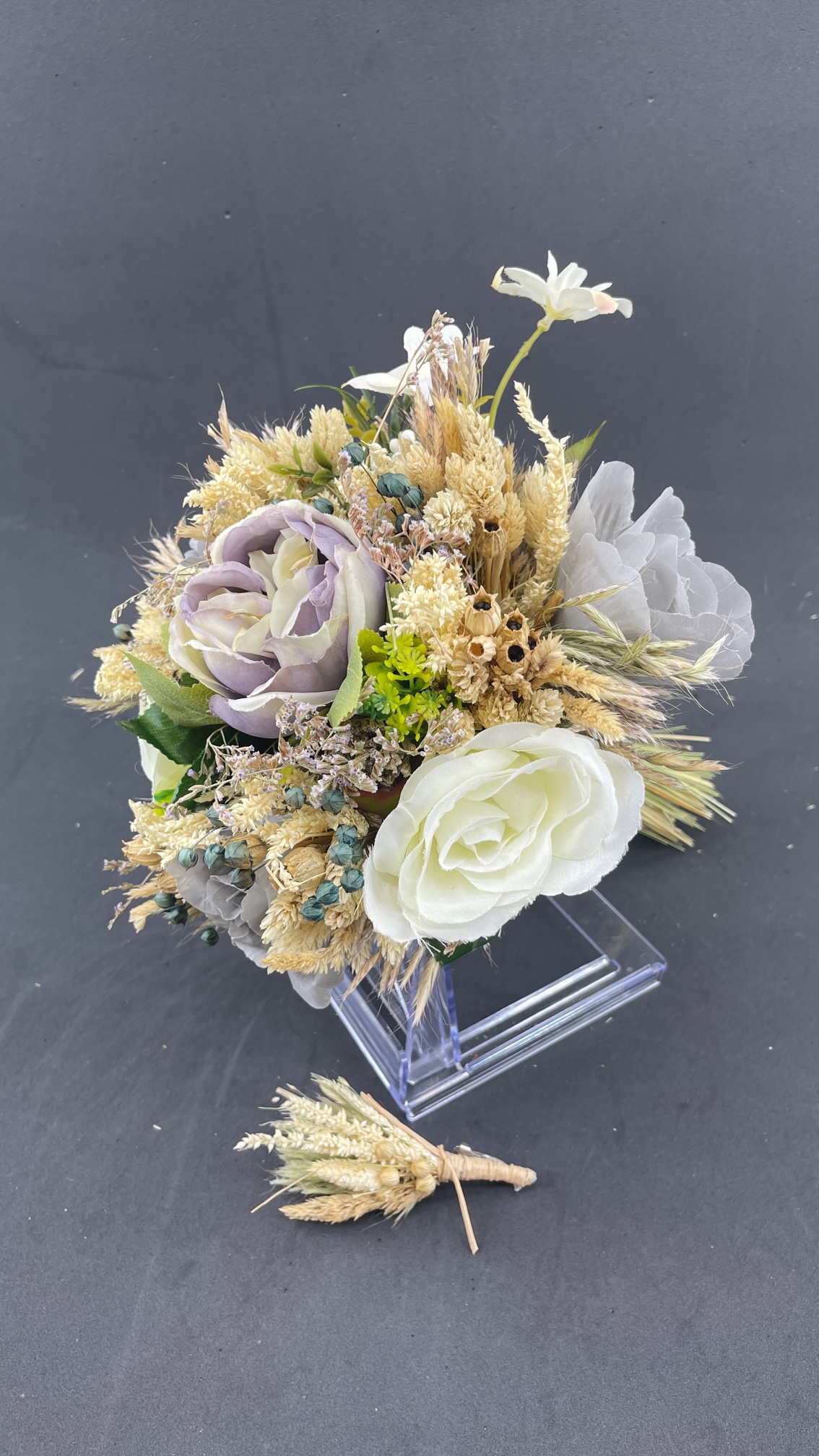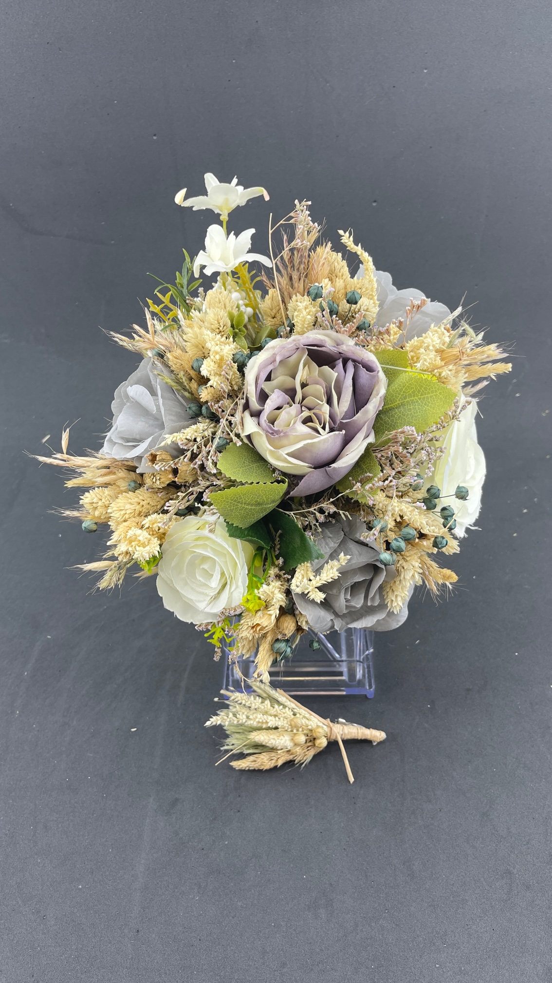 Lila Gri Tonlarda Yeşil Yapraklı Aranjman Gelin Buketi ve Damat Yaka Çiçeği