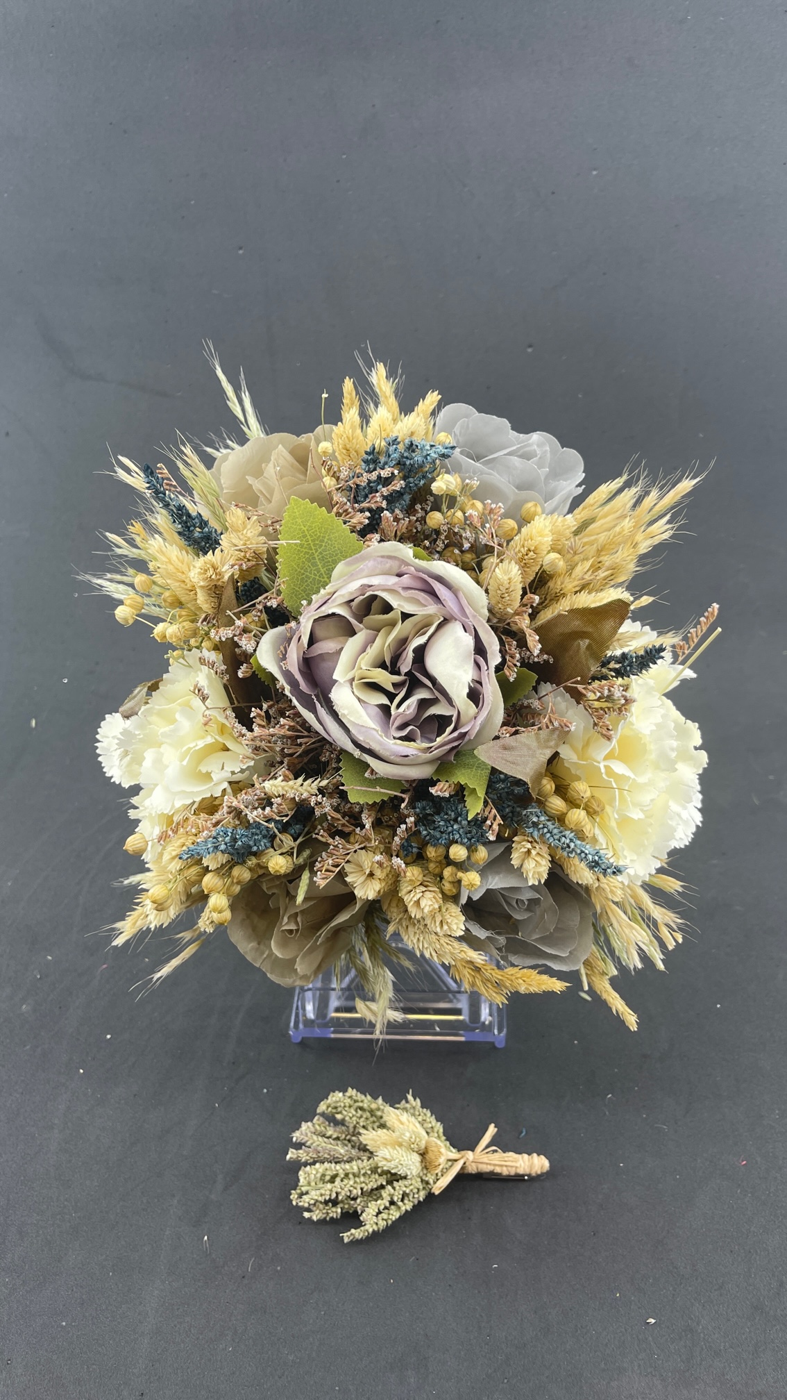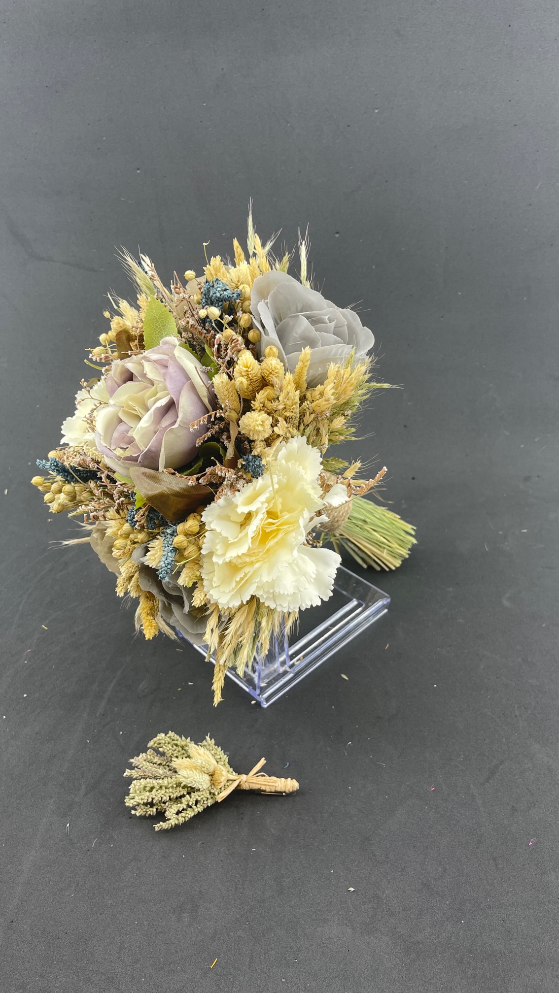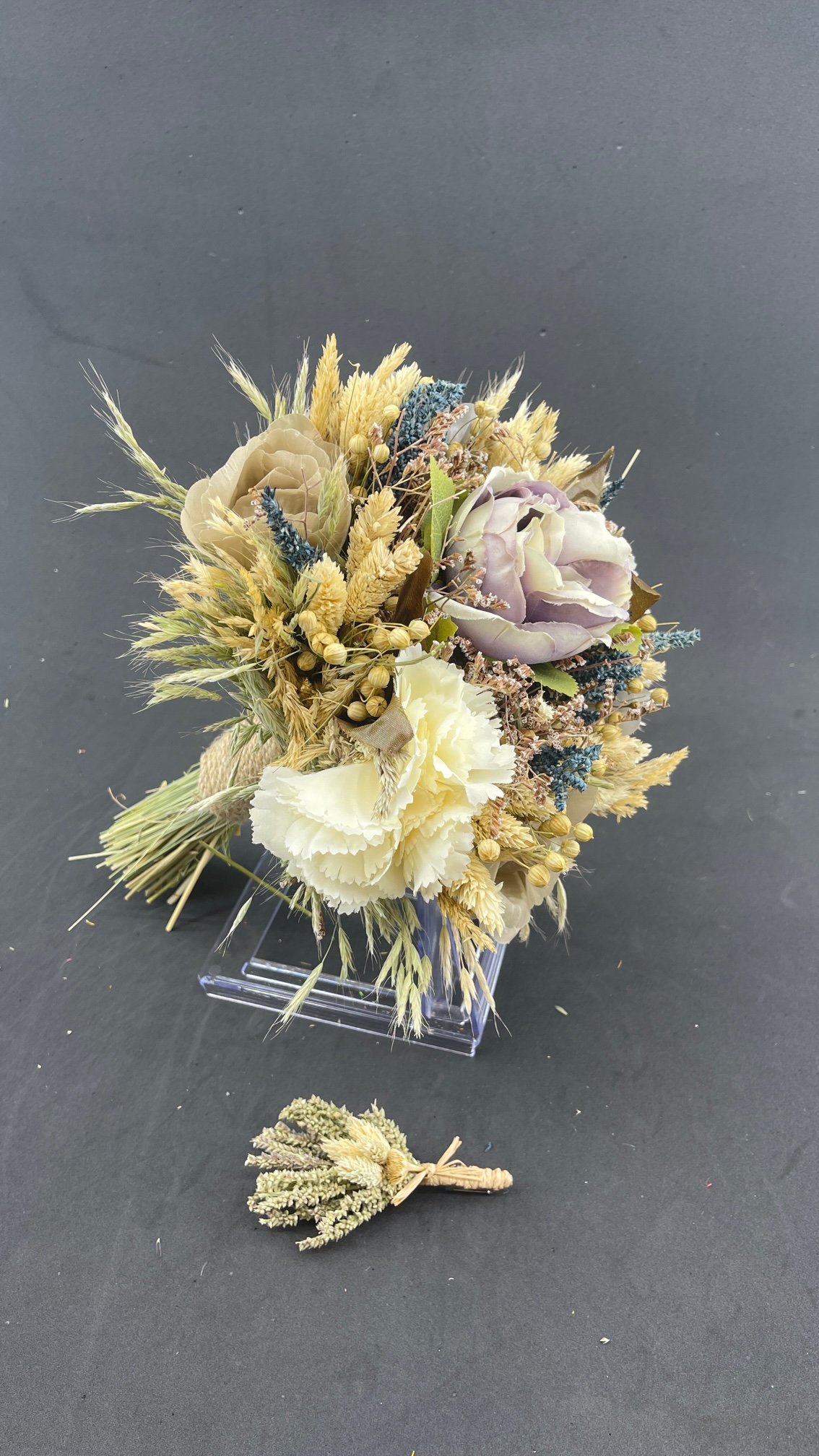 Lila Krem Tonlarda Beyaz Çiçek Detaylı Yapraklı Aranjman Gelin Buketi ve Damat Yaka Çiçeği