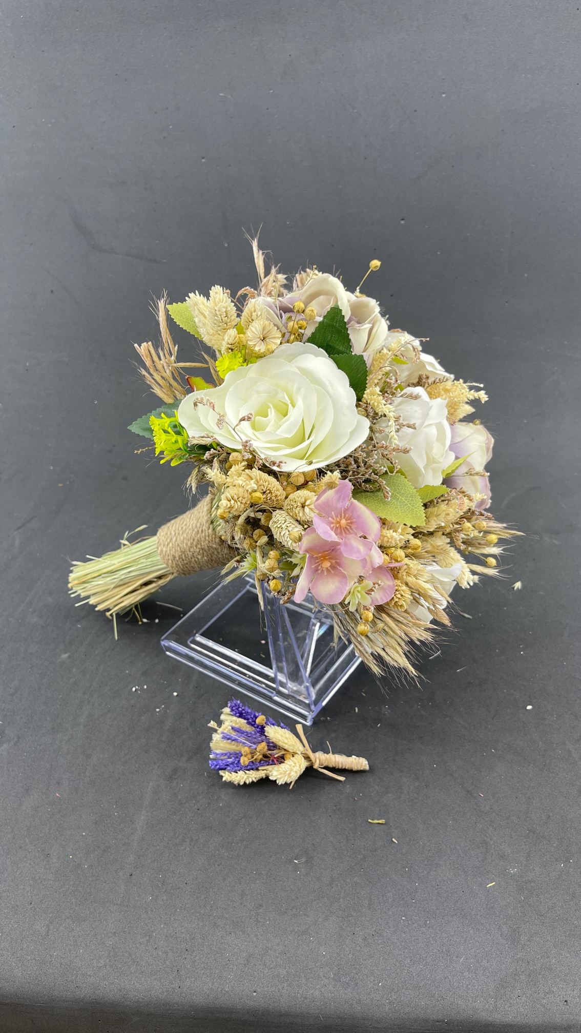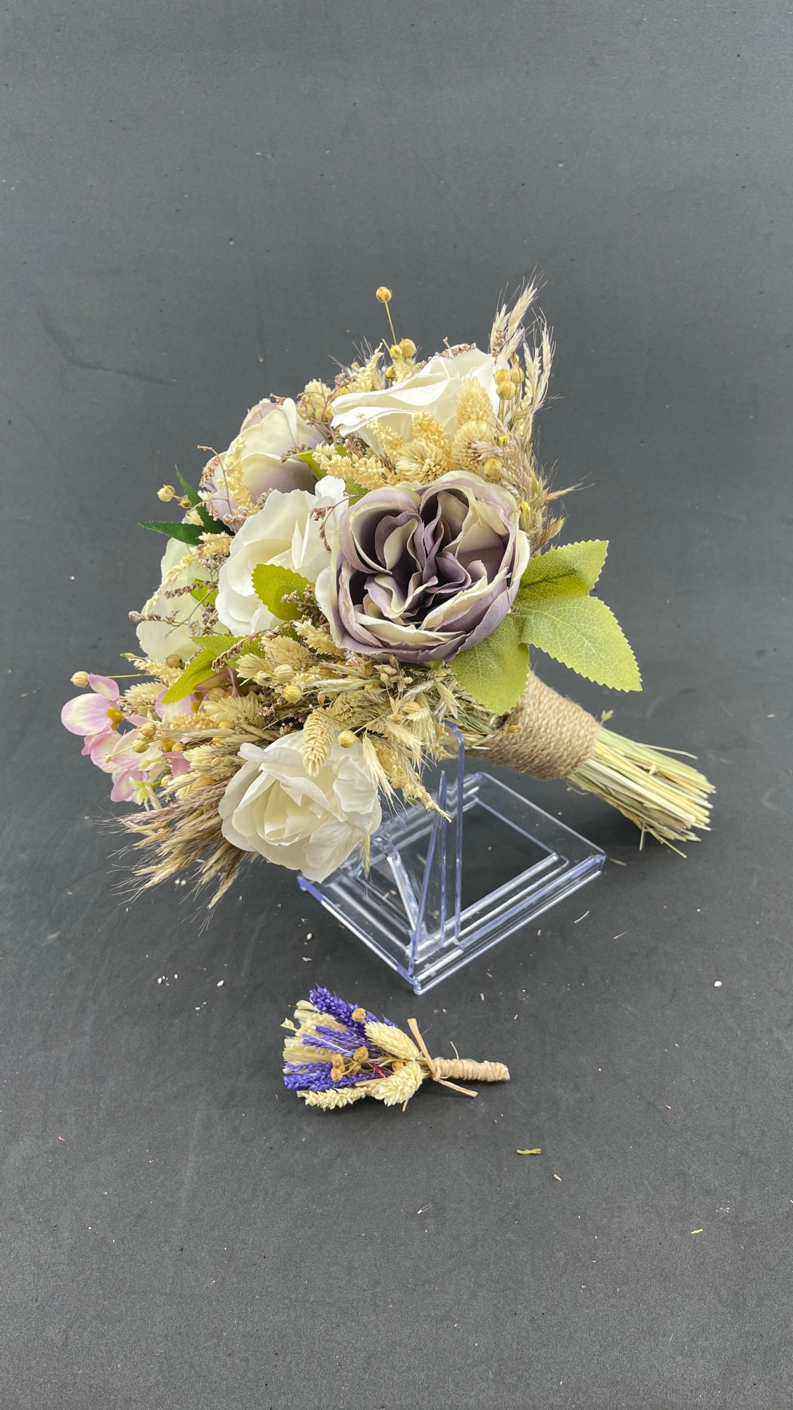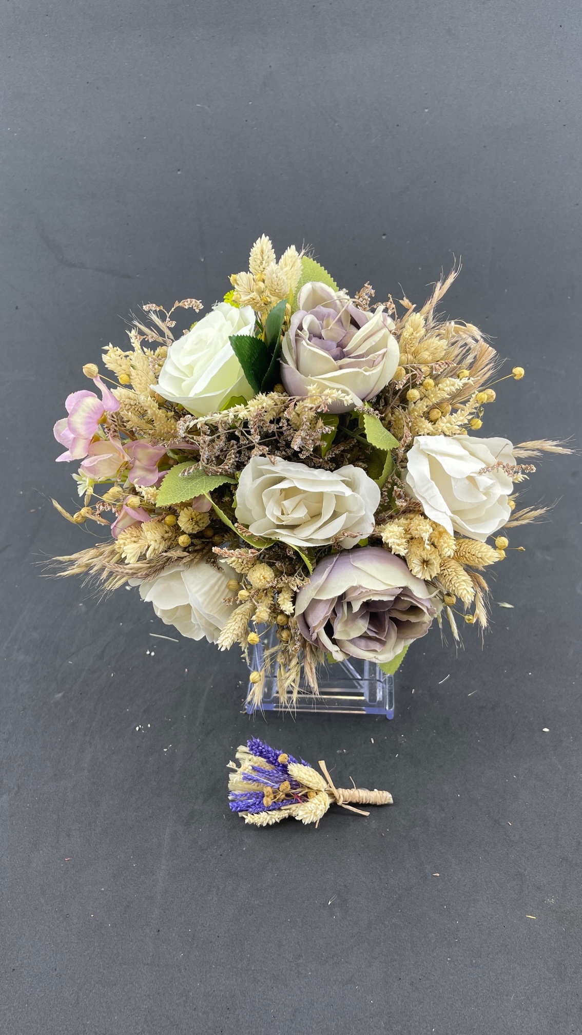 Lila Pembe Mor Tonlarda Beyaz Çiçek Detaylı Aranjman Gelin Buketi ve Damat Yaka Çiçeği