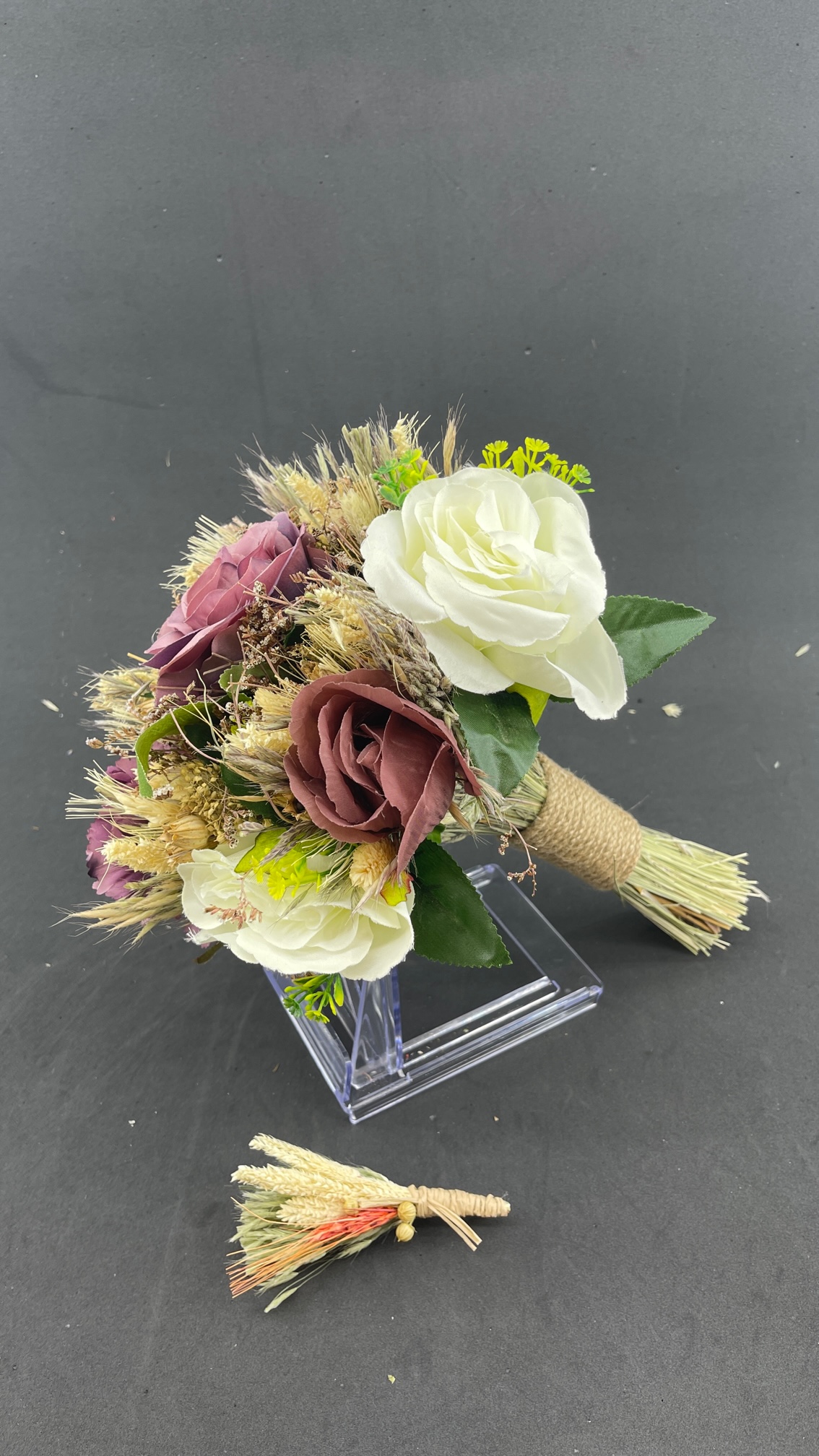 Lila Pembe Mor Tonlarda Krem Güllerle Süslü Gelin Buketi ve Damat Yaka Çiçeği