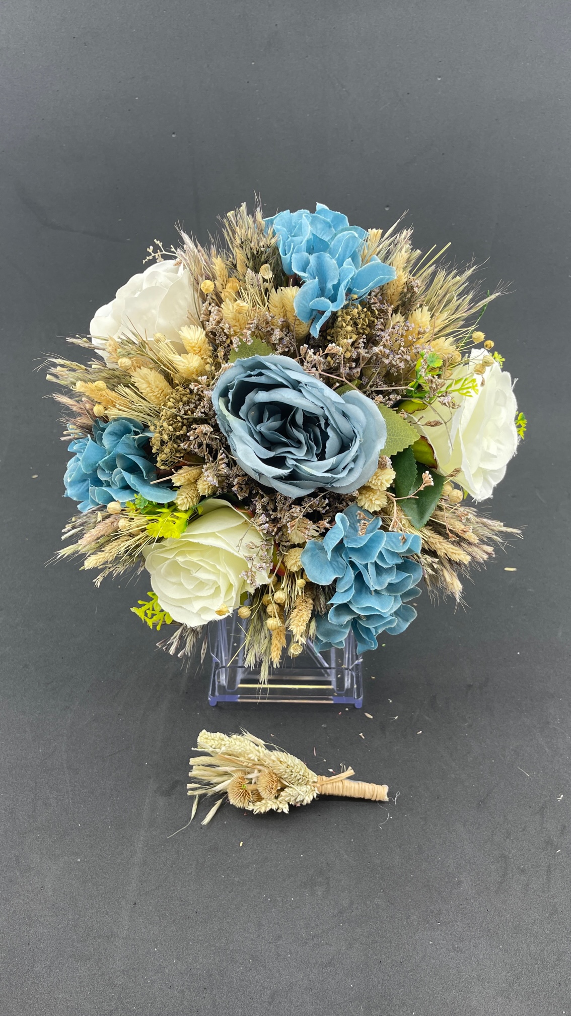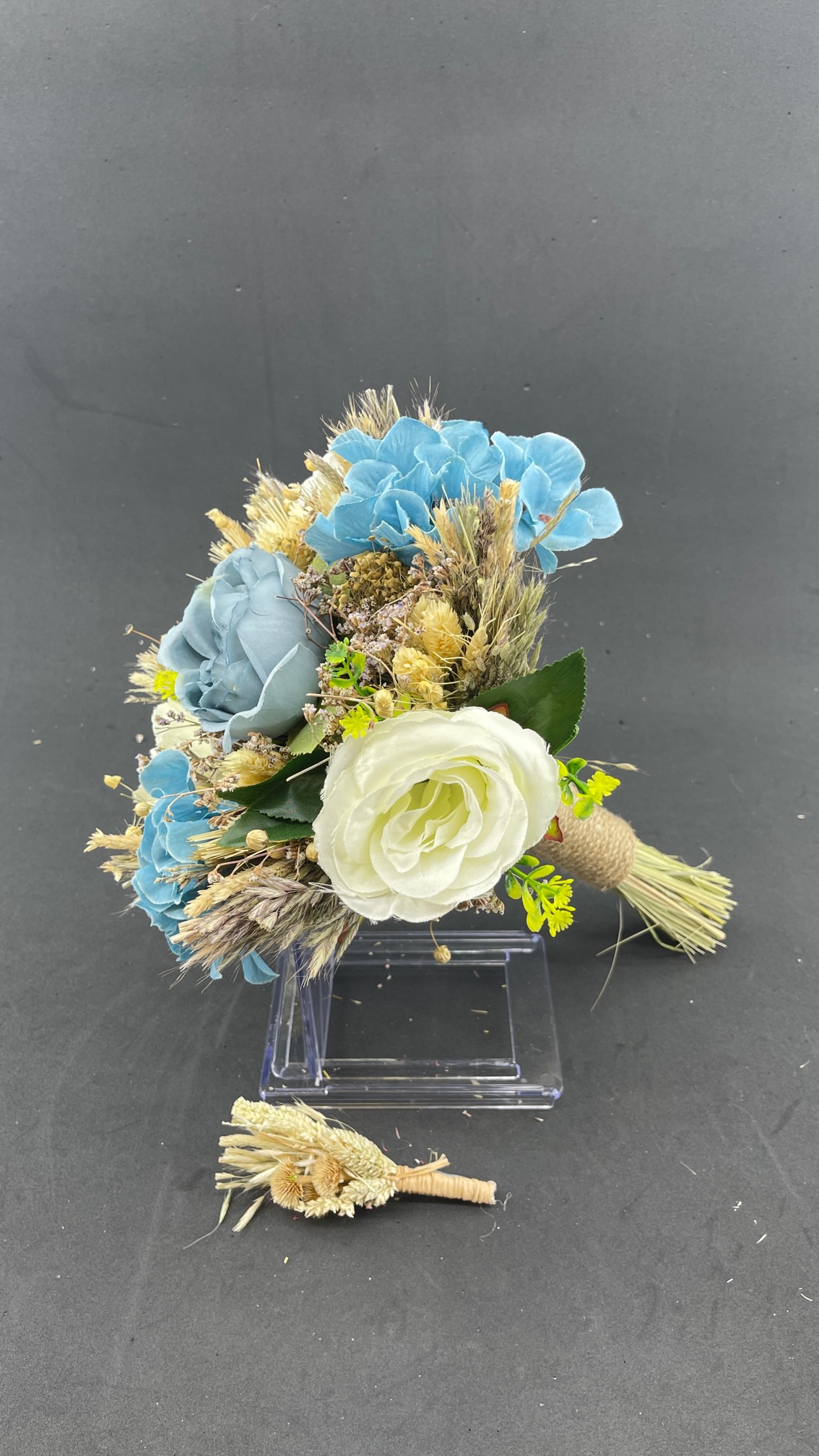 Mavi Çiçek Detaylı Ekru Tonlarda Aranjman Gelin Buketi ve Damat Yaka Çiçeği