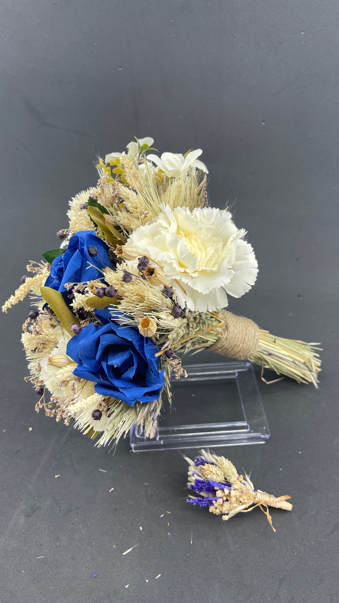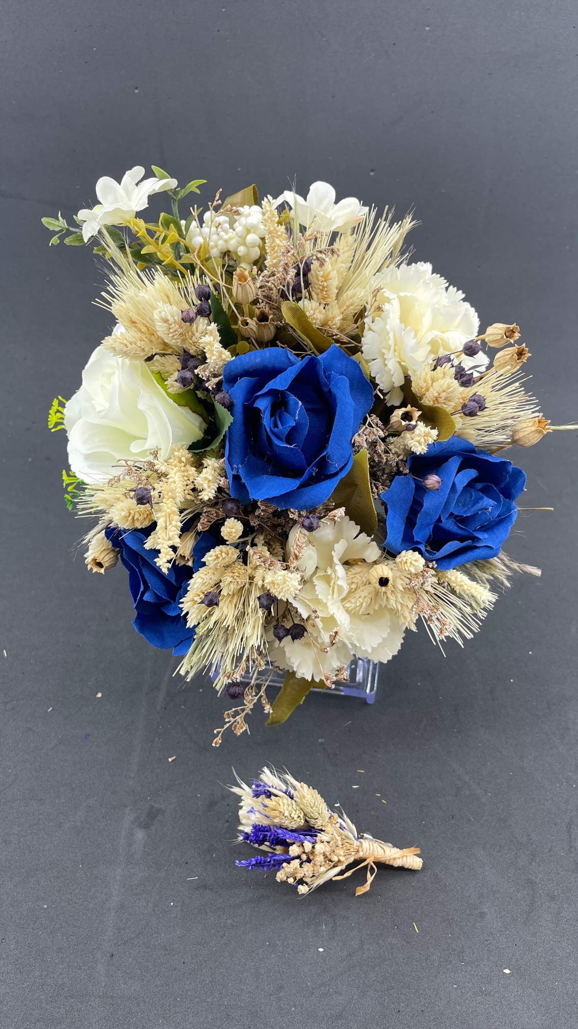 Mavi Gül Detaylı Ekru Tonlarda Aranjman Gelin Buketi ve Damat Yaka Çiçeği