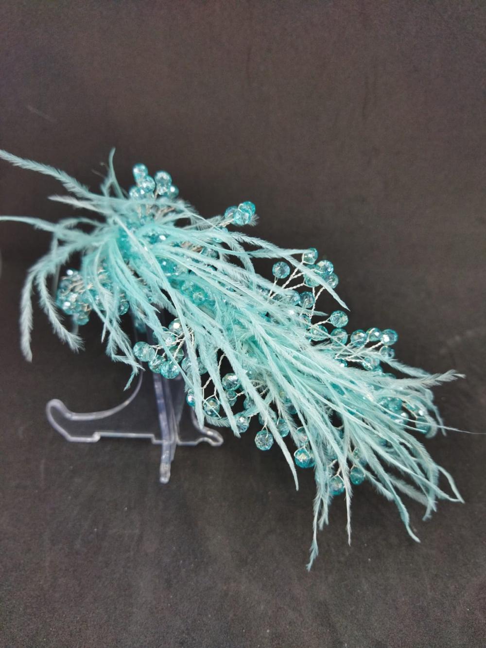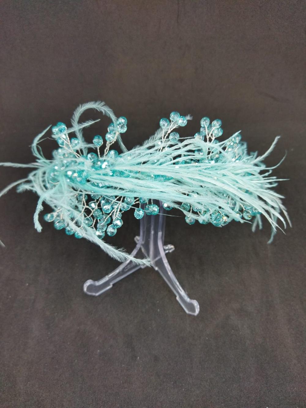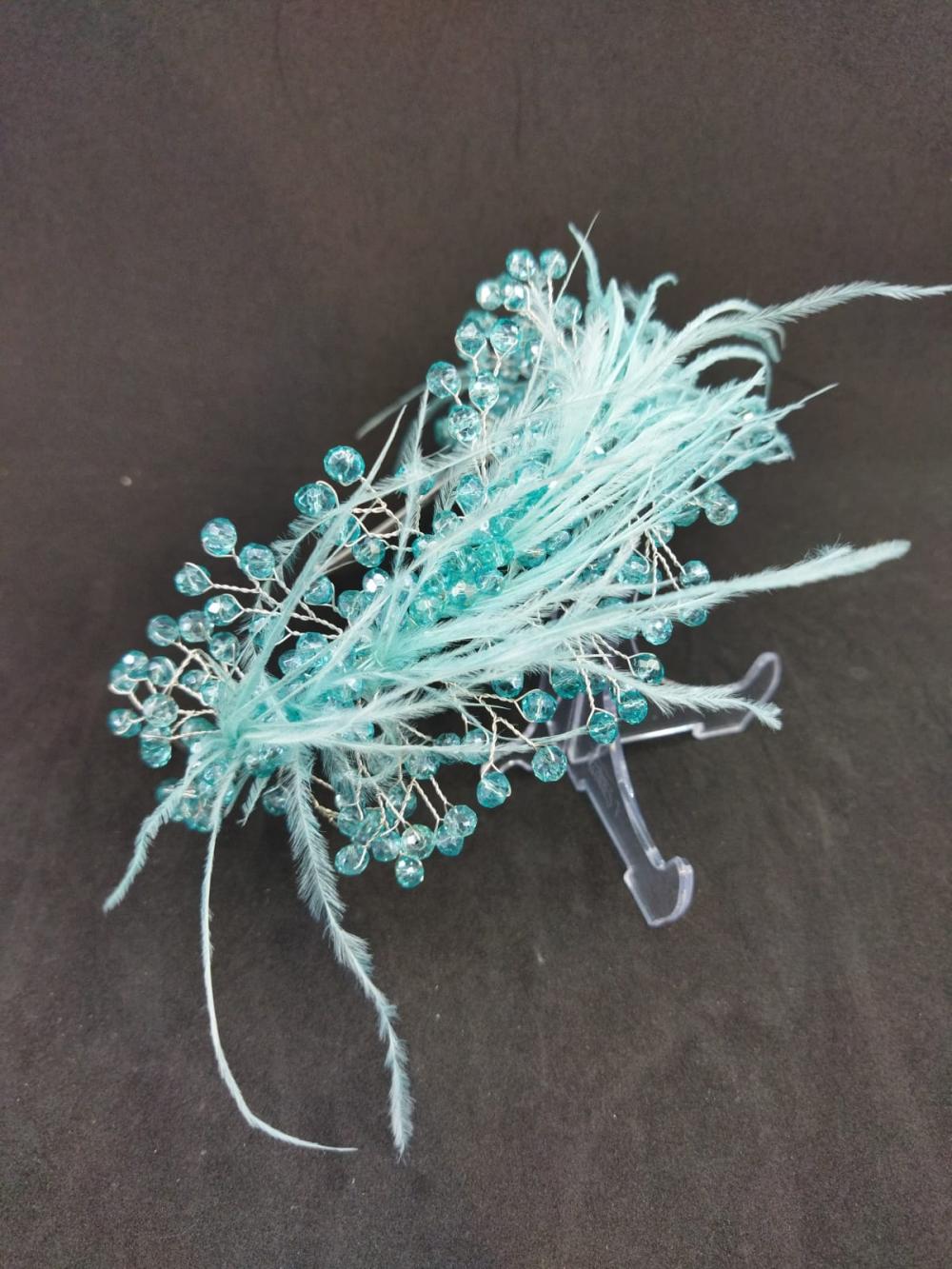 Mavi Kristallerle Süslenmiş Tüy Detayları Olan Gelin Tacı