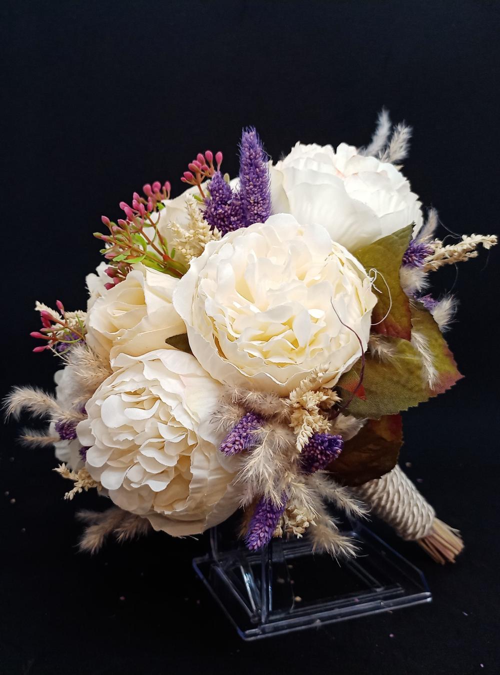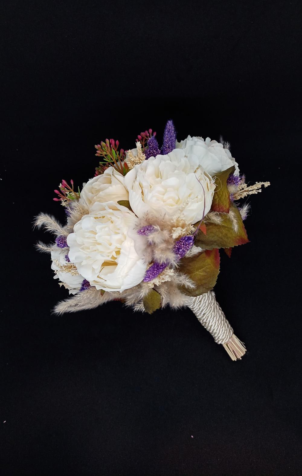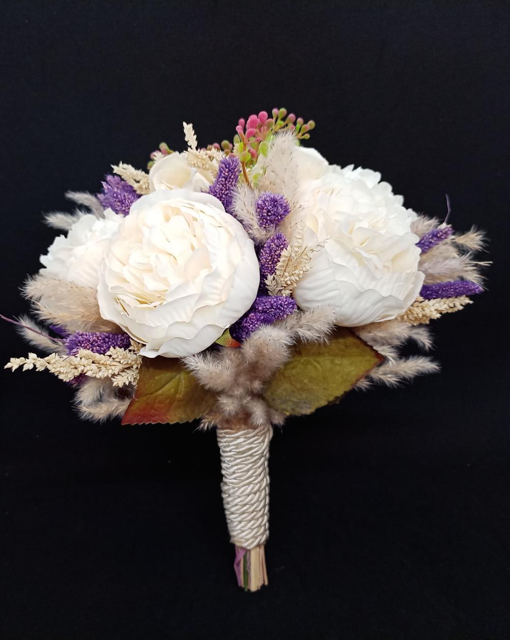 Mor Çiçeklerle Süslenmiş Beyaz Şakayık Gelin Buketi