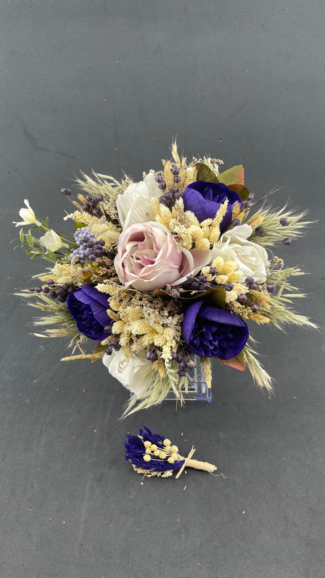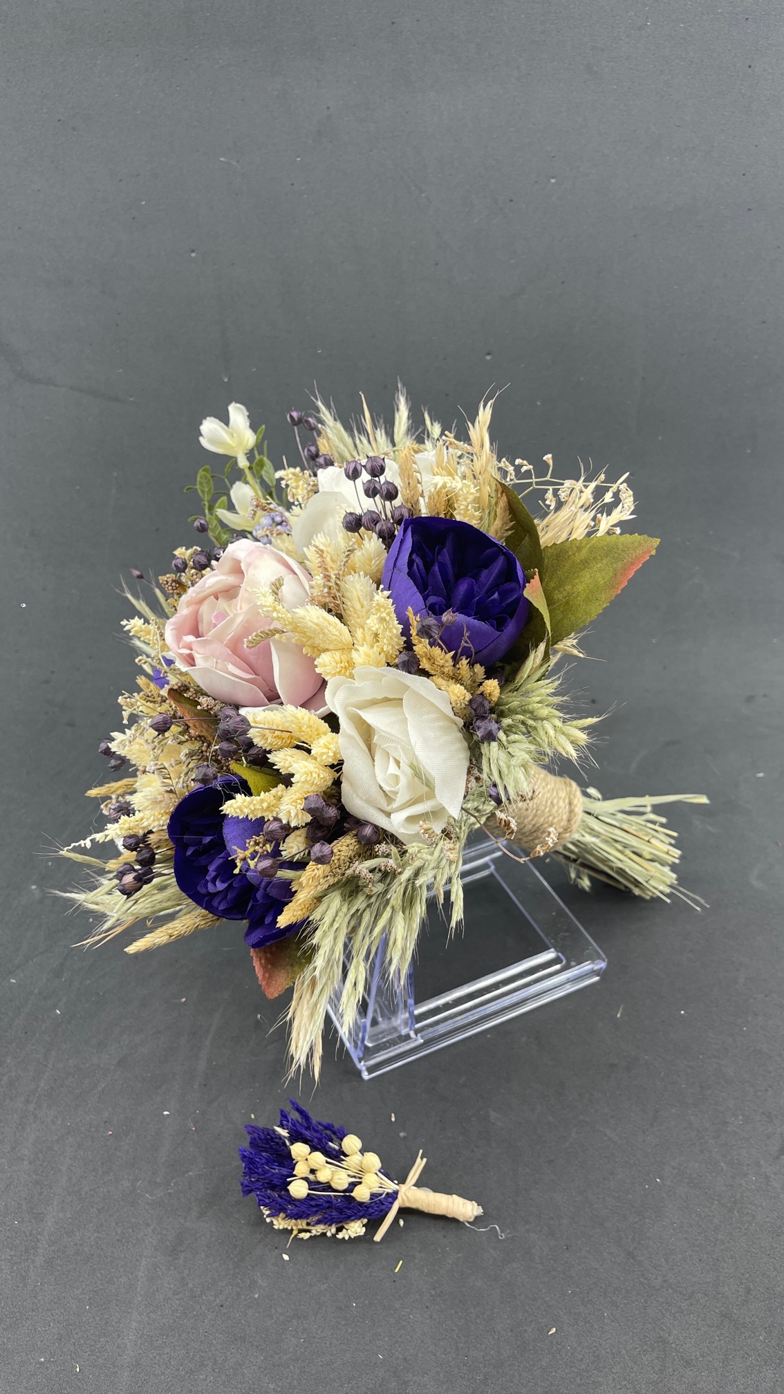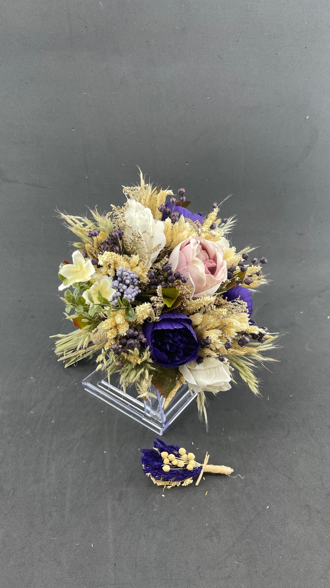 Mor Pembe Renklerde Şık Aranjman Gelin Buketi Ve Damat Yaka Çiçeği