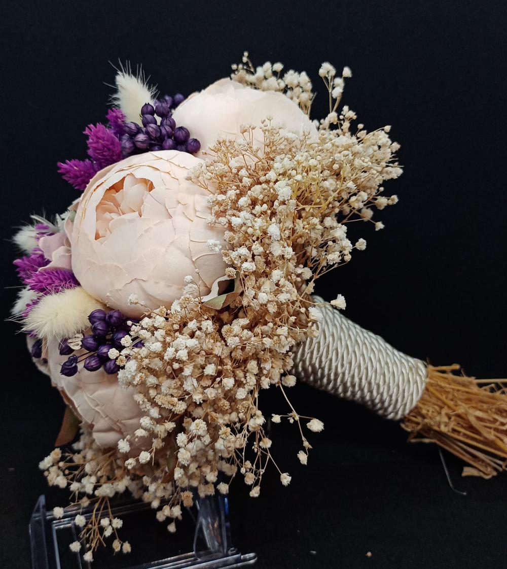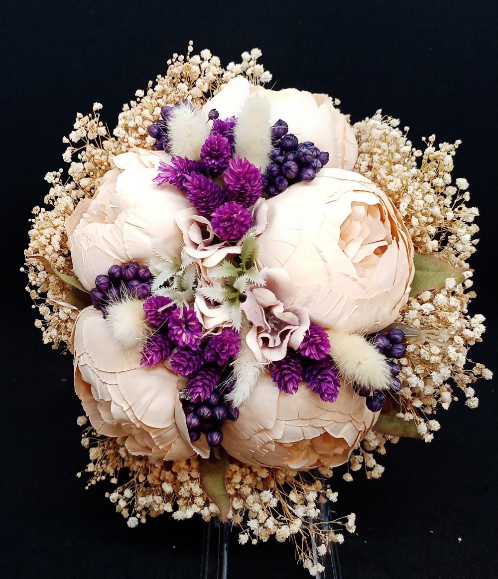 Mor Tonlarında Detaylara Sahip Pembe Şakayık Gelin Buketi