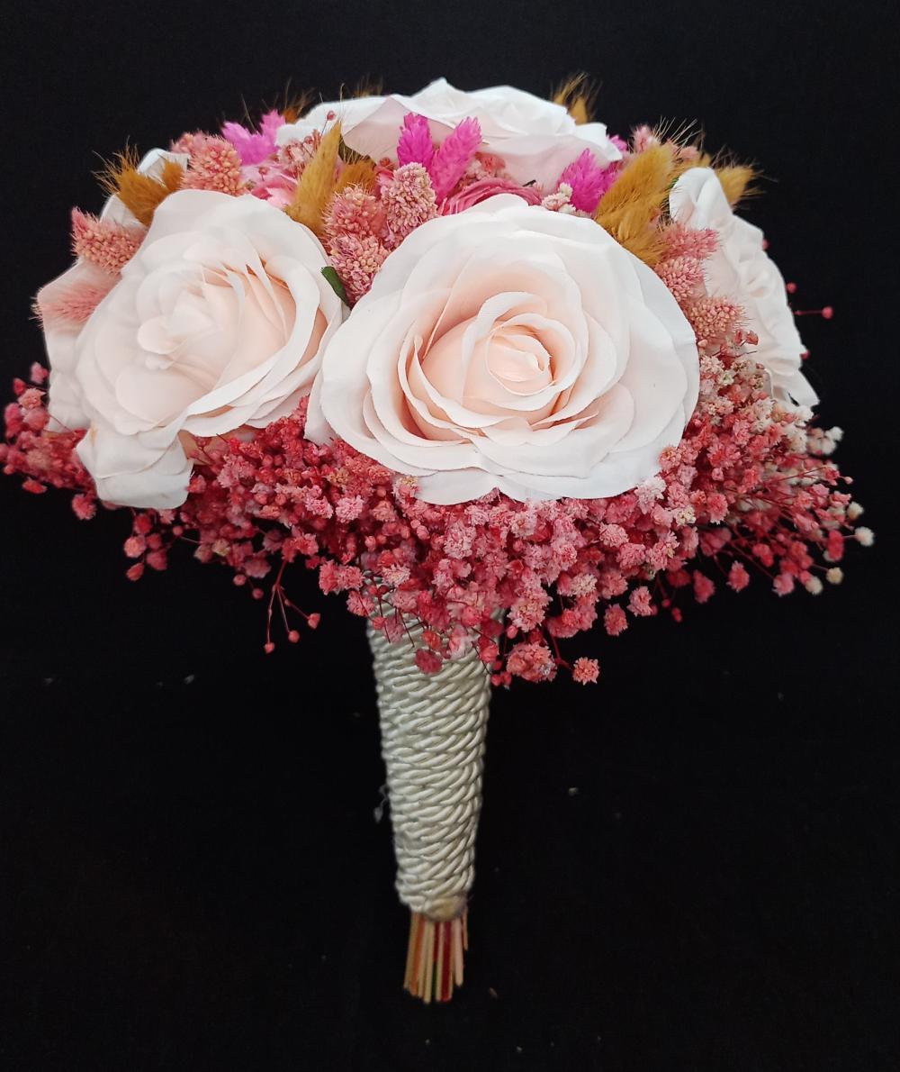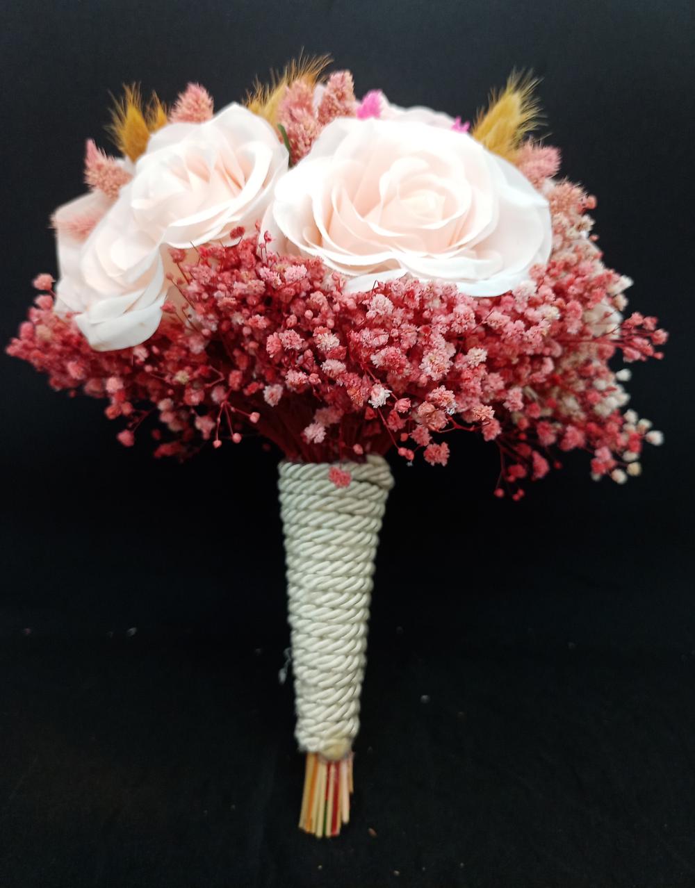 Hasır krem renkli sapa sahip pembe yapay cipsolarla süslenmiş açık pembe gül gelin buketi.