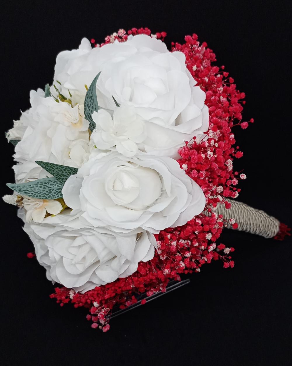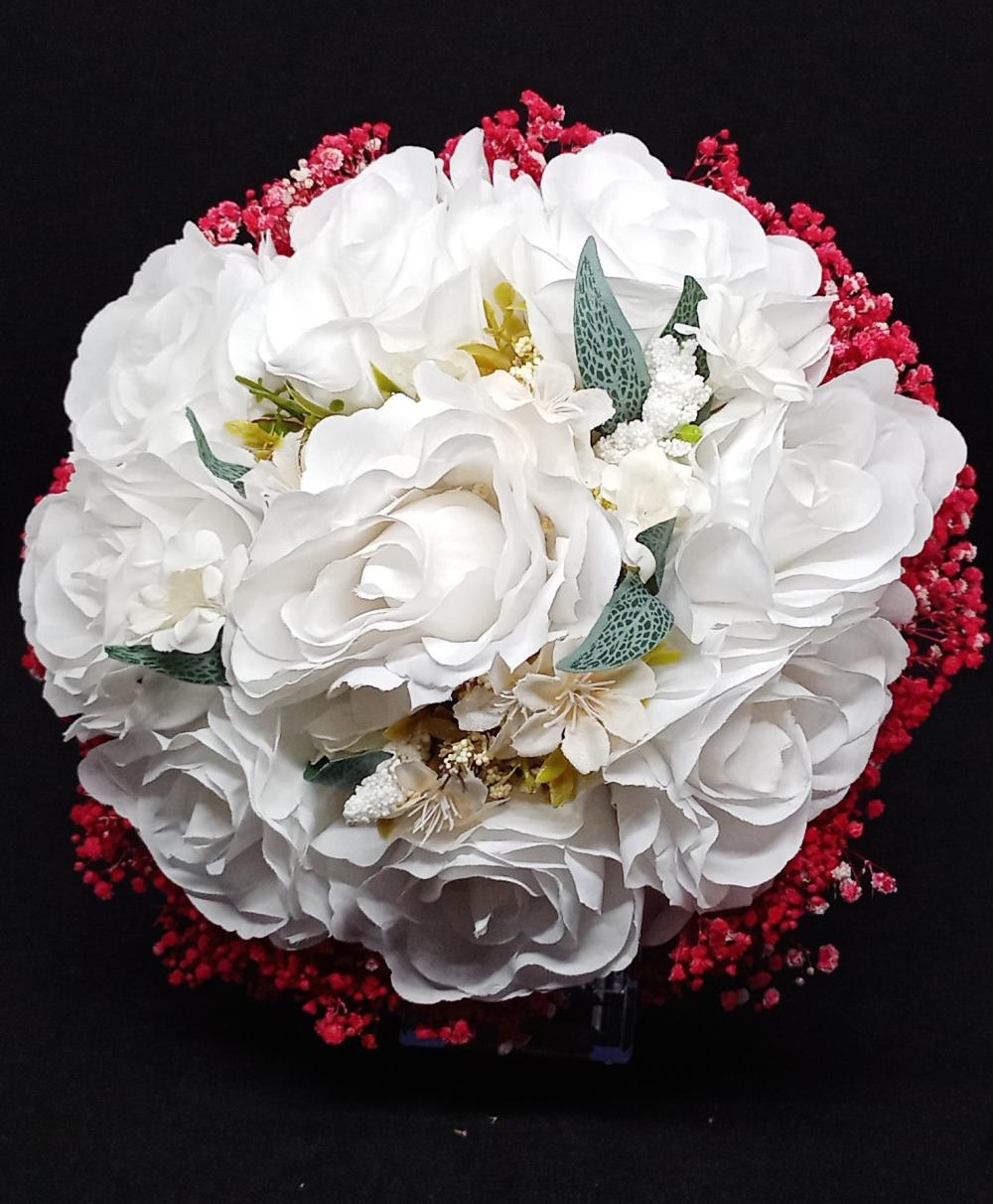 Pembe Cipsolarla Süslenmiş Beyaz Gül Gelin Buketi