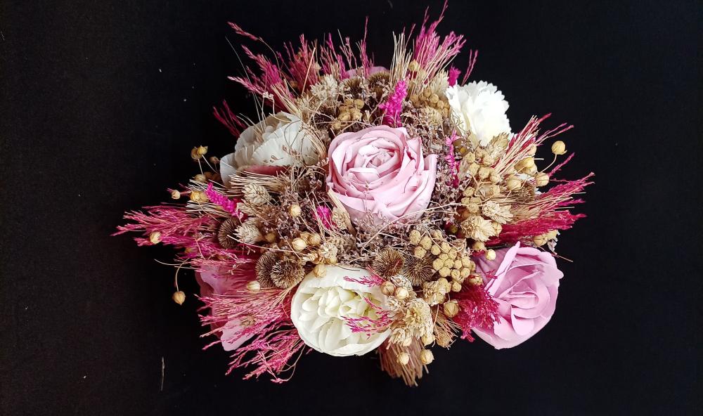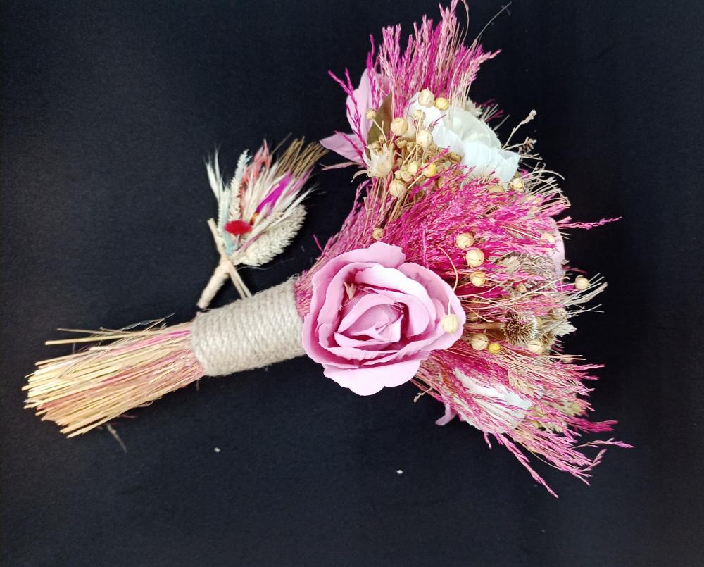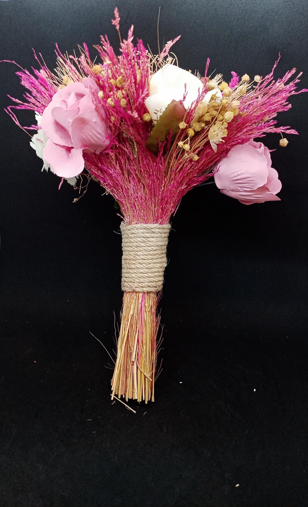 Pembe Cipsolarla Süslenmiş Beyaz Ve Pembe Gül Gelin Buketi