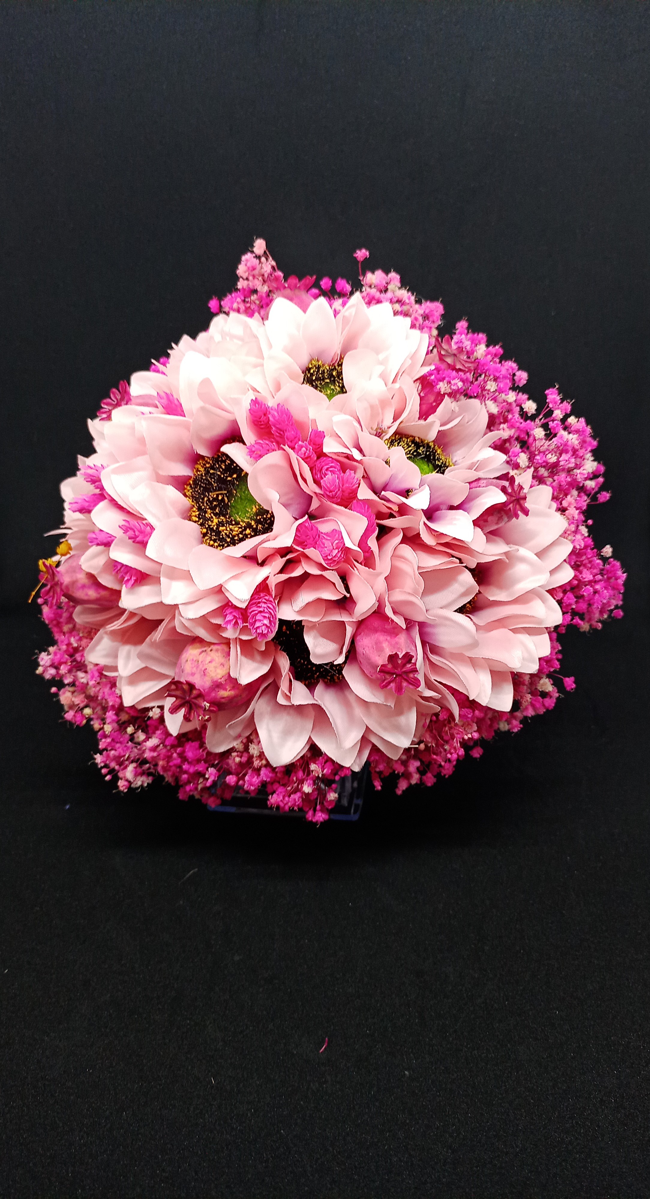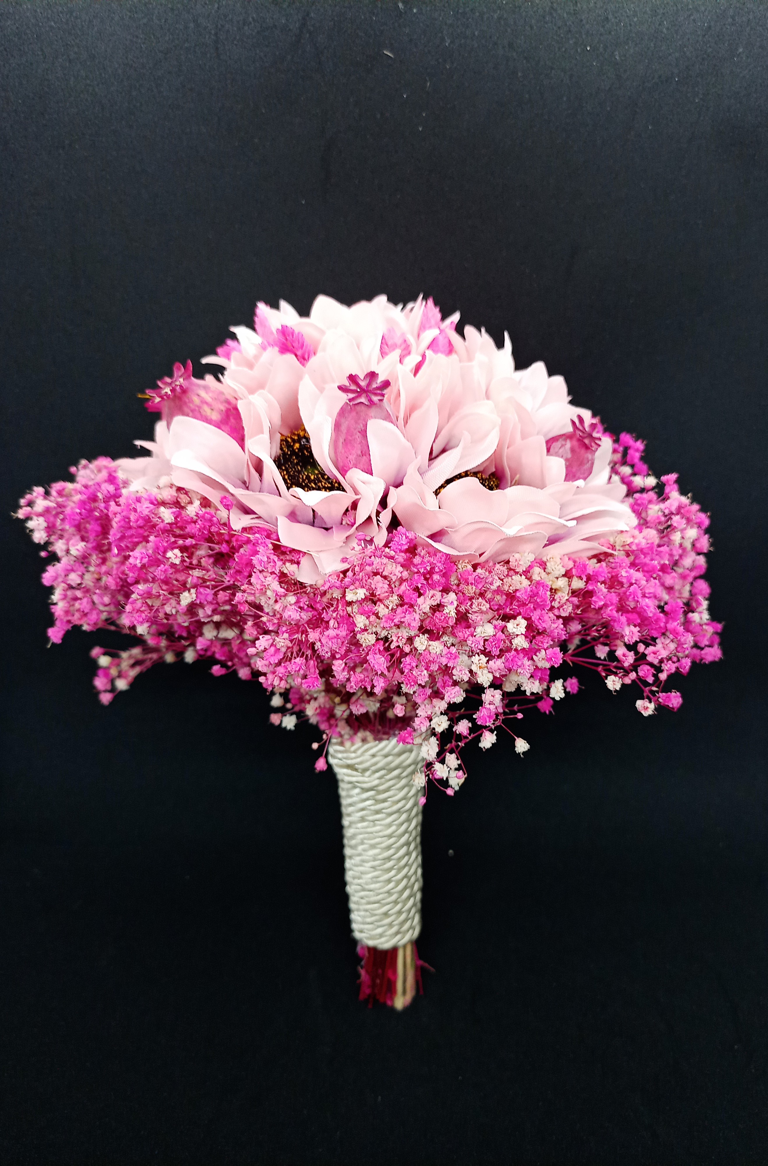 Pembe Cipsolarla Süslenmiş Pembe Günebakan Gelin Buketi .