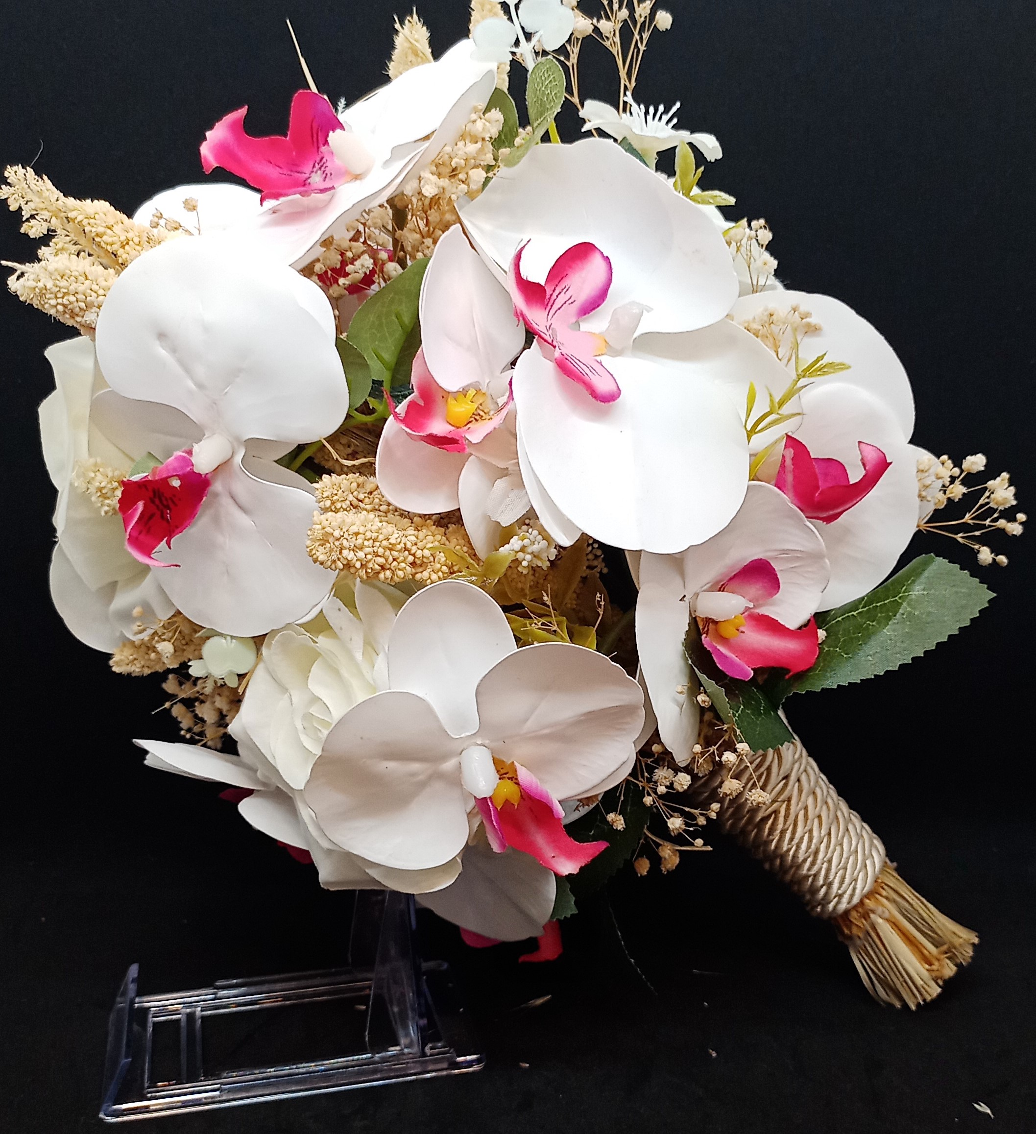 Pembe Detayları Olan Beyaz Orkide Gelin Buketi .