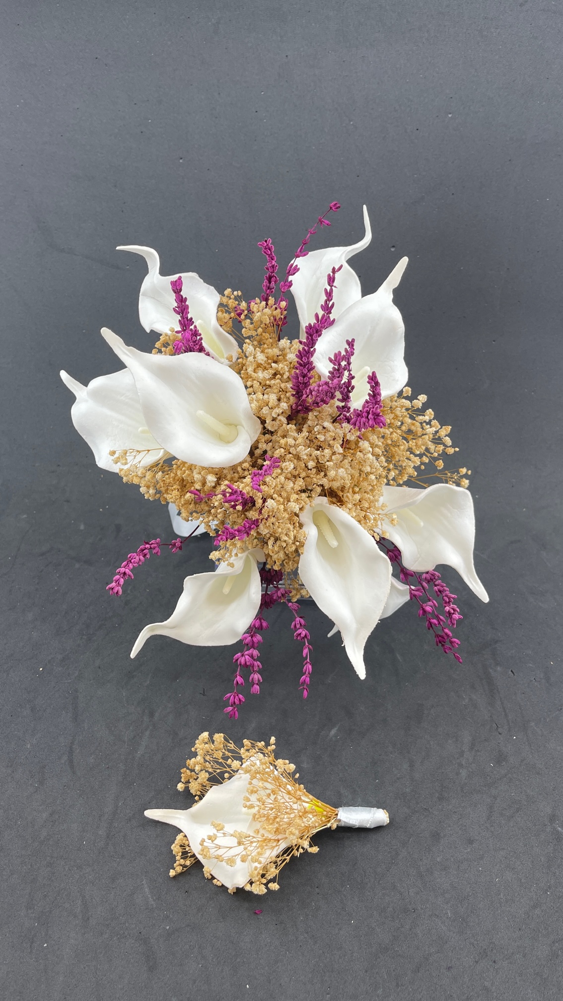 Pembe Mor Kır Çiçekleriyle Süslü Beyaz Gala Gelin Çiçeği Buketi ve Damat Yaka Çiçeği