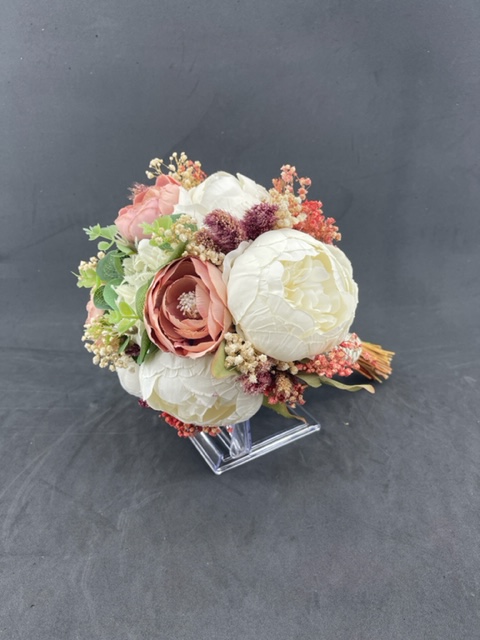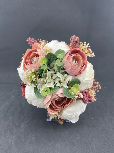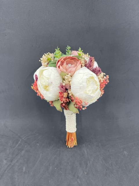 Pembe Mor ve Krem Tonlarda Yeşil Okaliptus Yaprak Detaylı Aranjman Gelin Buketi