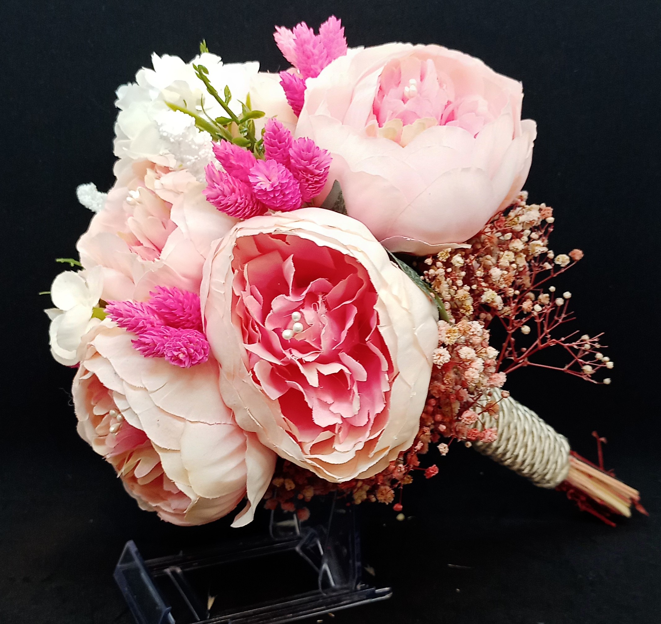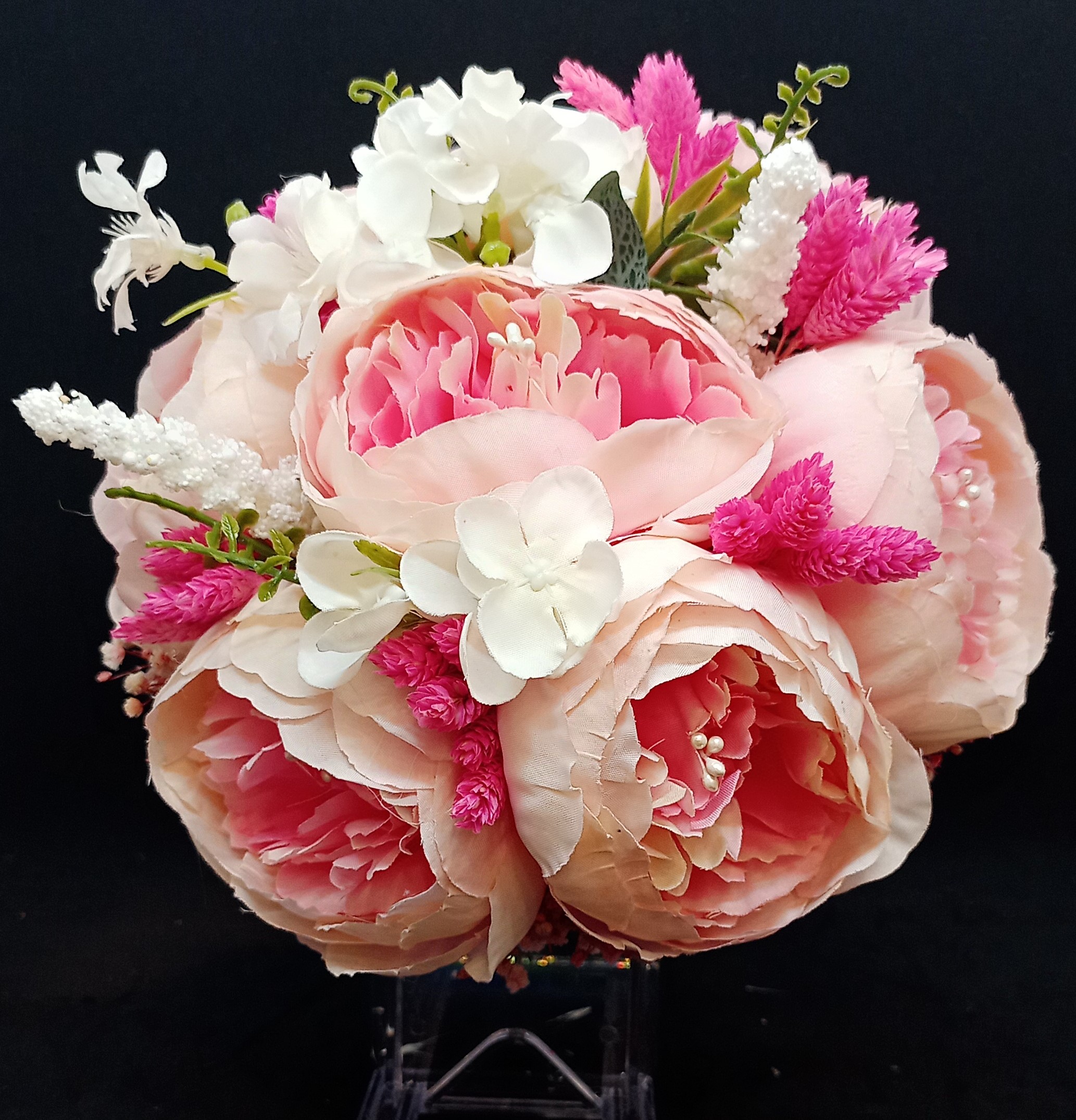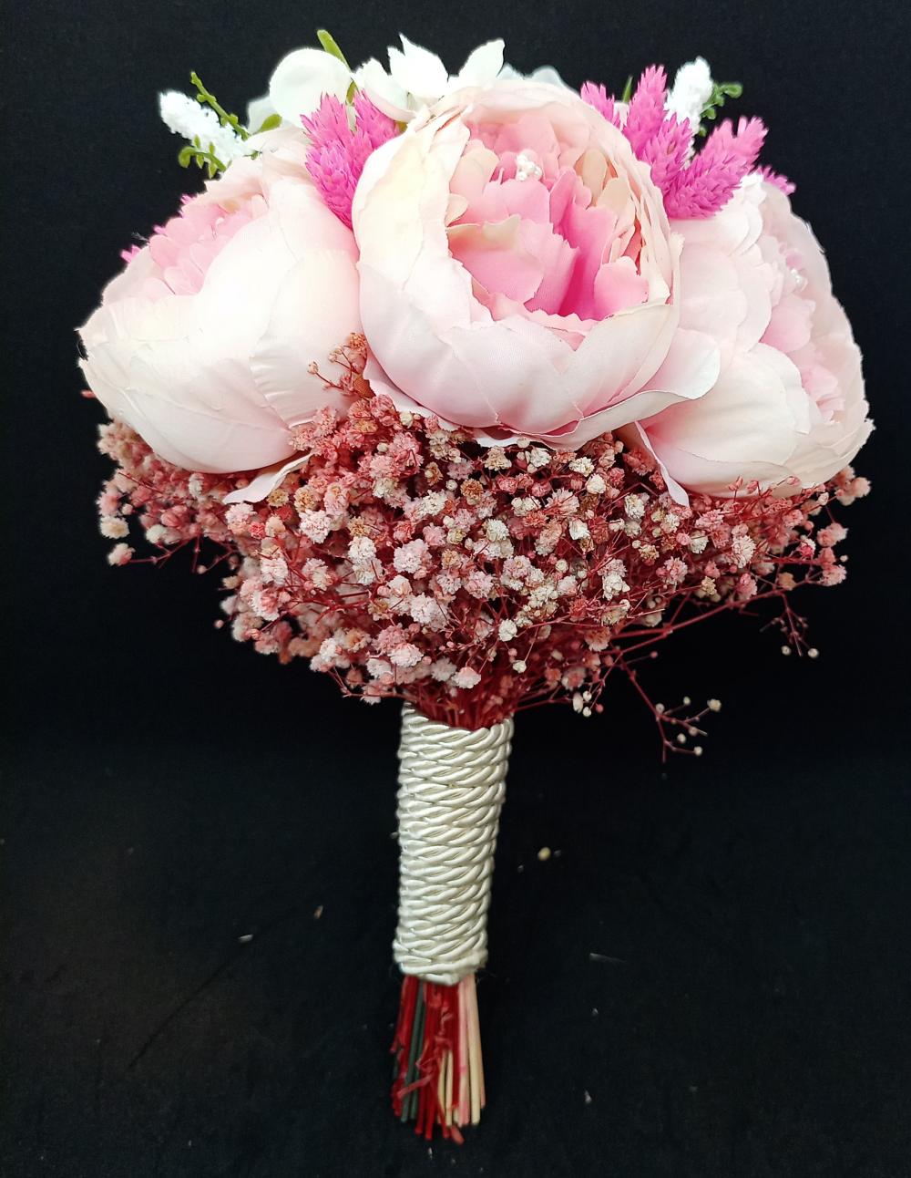 Pembe beyaz cipsolarla süslenmiş pembe şakayık yapay gelin buketi.