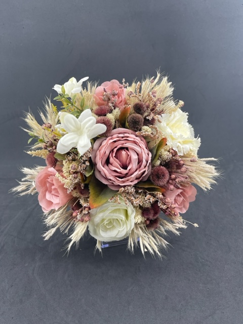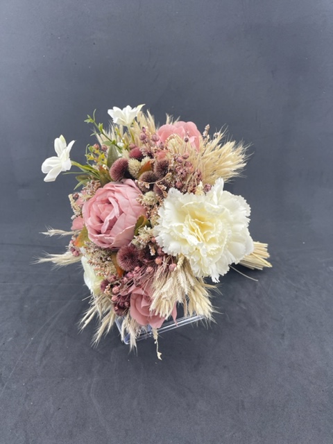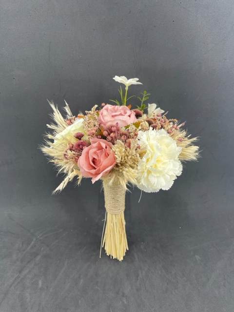 Pembe Tonlarda Krem Başaklar ve Cipsolarla Süslü Gül Karanfil Şakayık Aranjman Gelin Buketi
