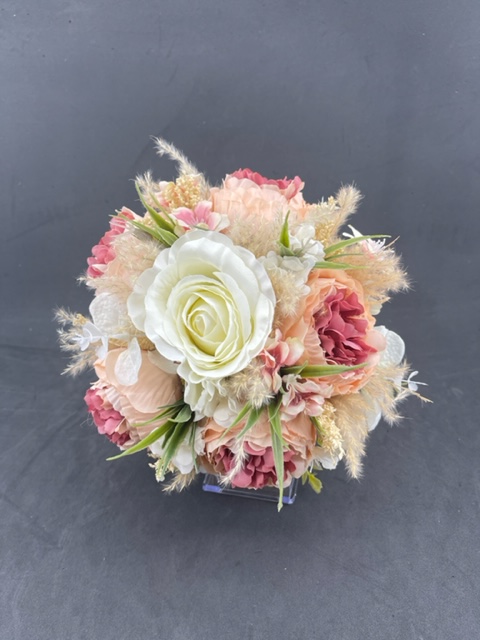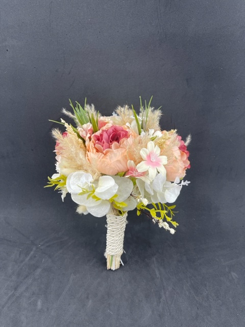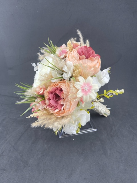 Pembe Tonlarda Yeşil Yaprak Tüy Ve Çiçeklerle Süslü Şakayık Orkide Gül Aranjman Gelin Buketi