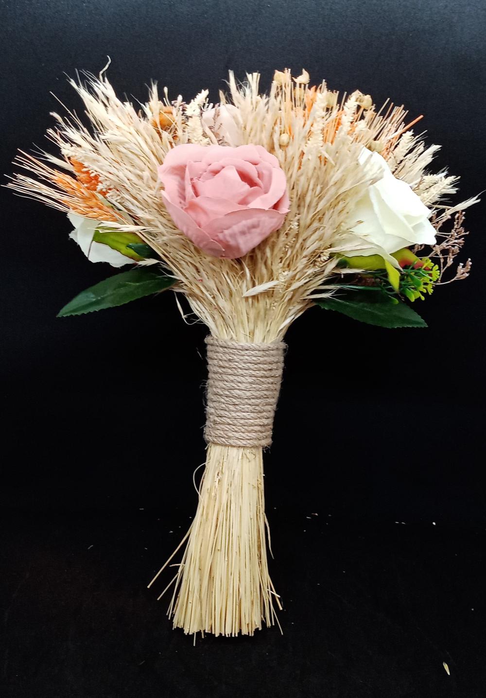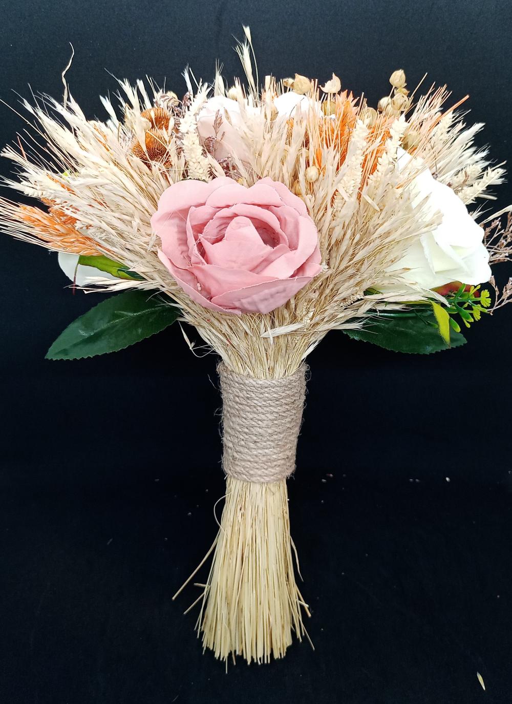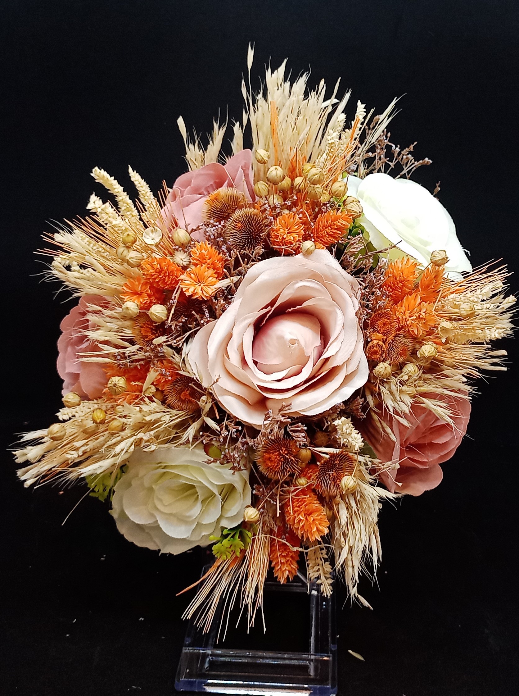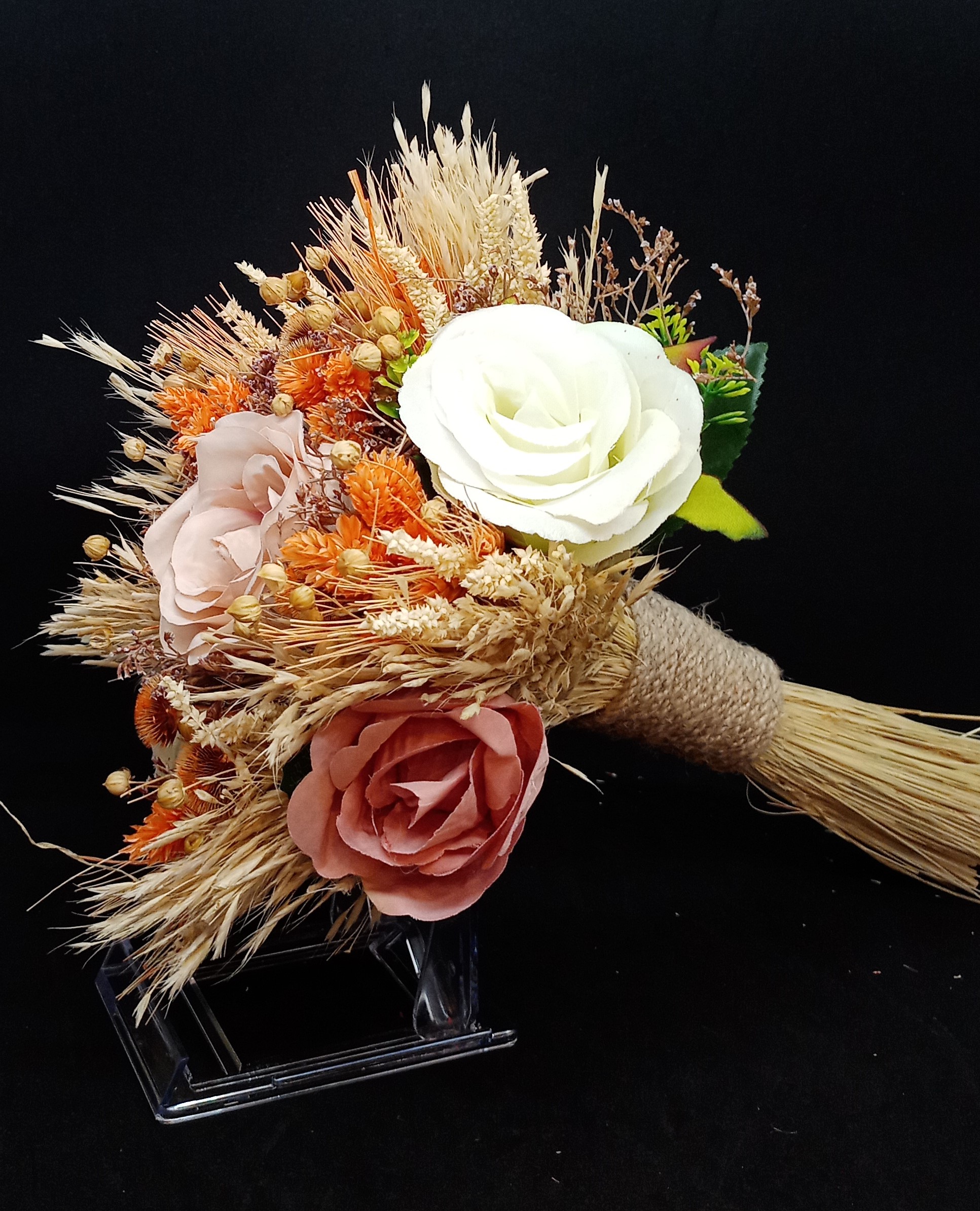 Turuncu detaylara sahip pembe beyaz gül yapay gelin buketi.
