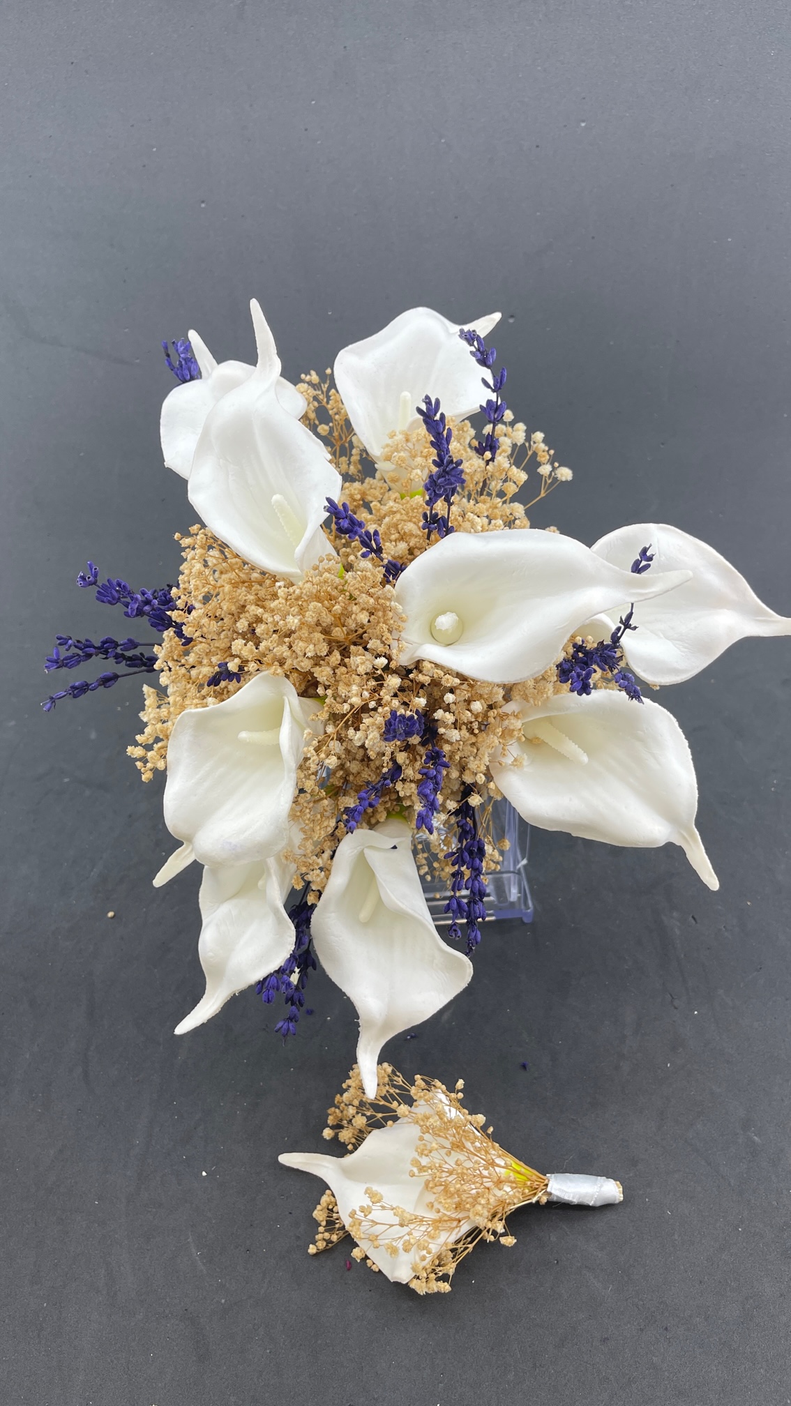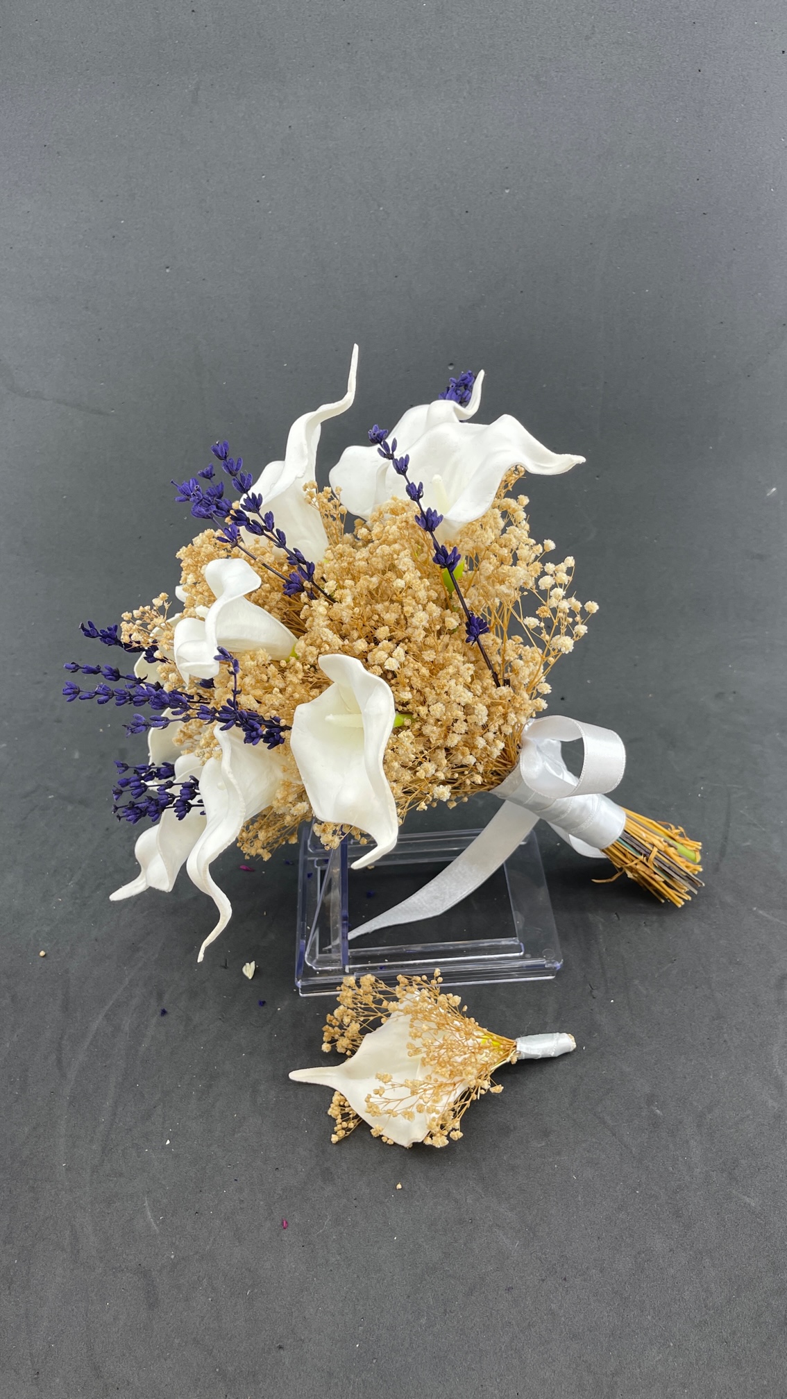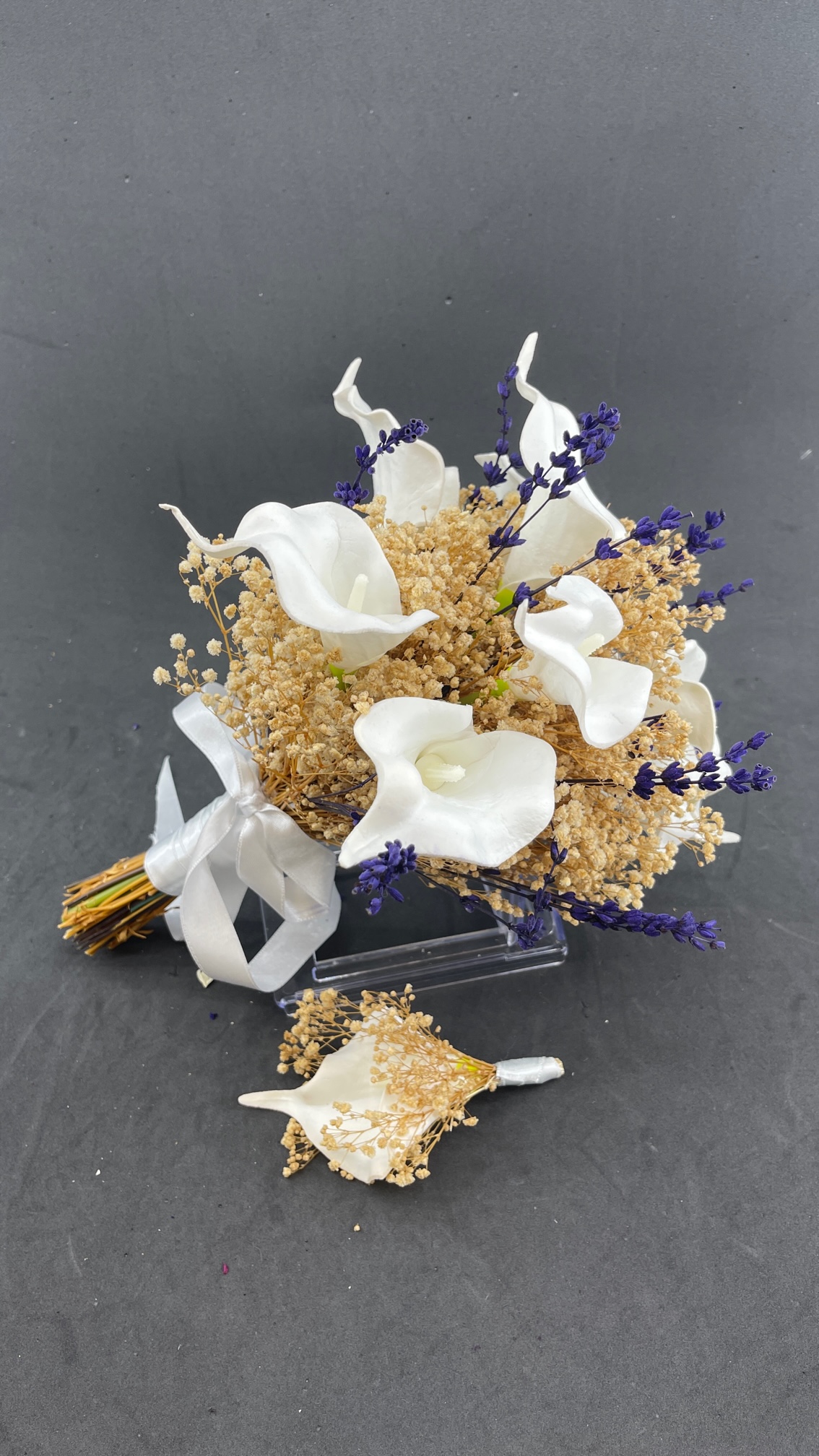 Renkli Kır Çiçekleriyle Süslü Beyaz Gala Gelin Buketi Ve Damat Yaka Çiçeği