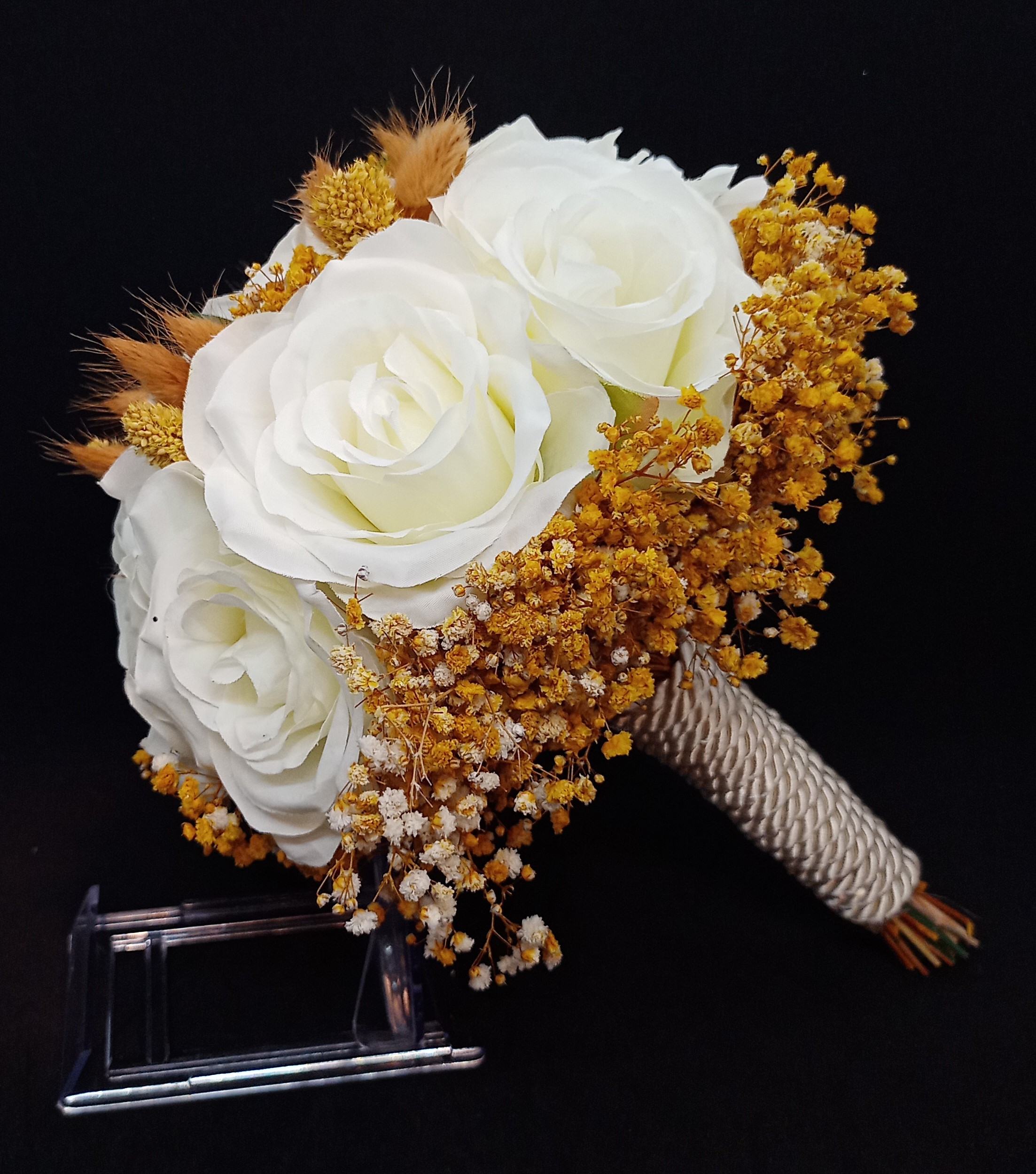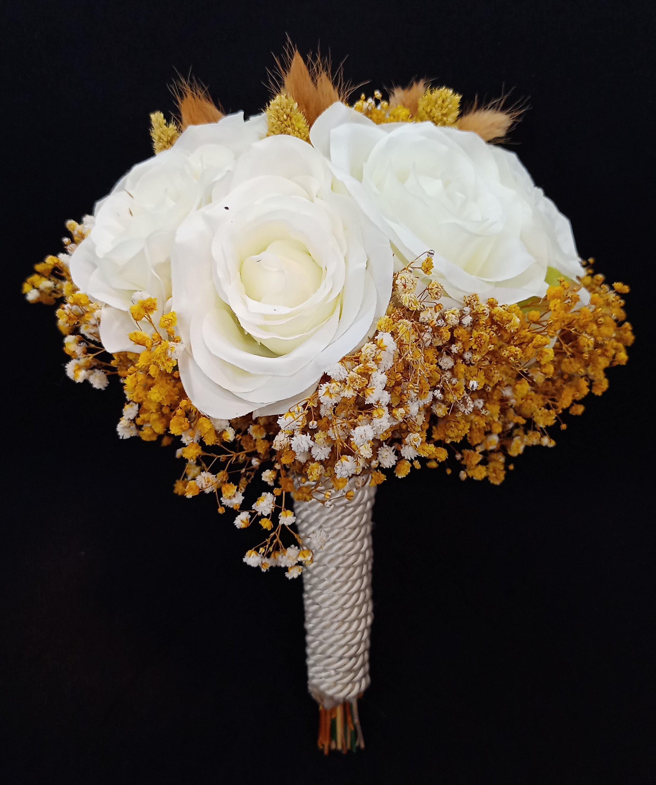 Sarı Cipsolarla Süslenmiş Beyaz Gül Gelin Buketi .